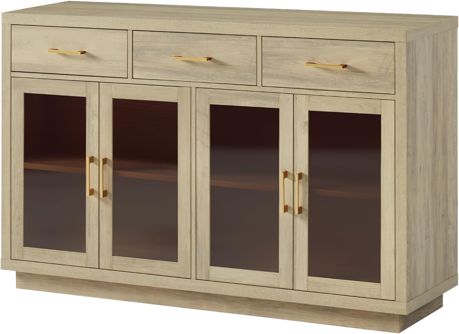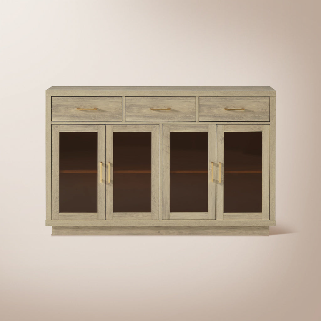 Glass 4 Doors Wooden Buffet Cabinet with 3 Top Drawers