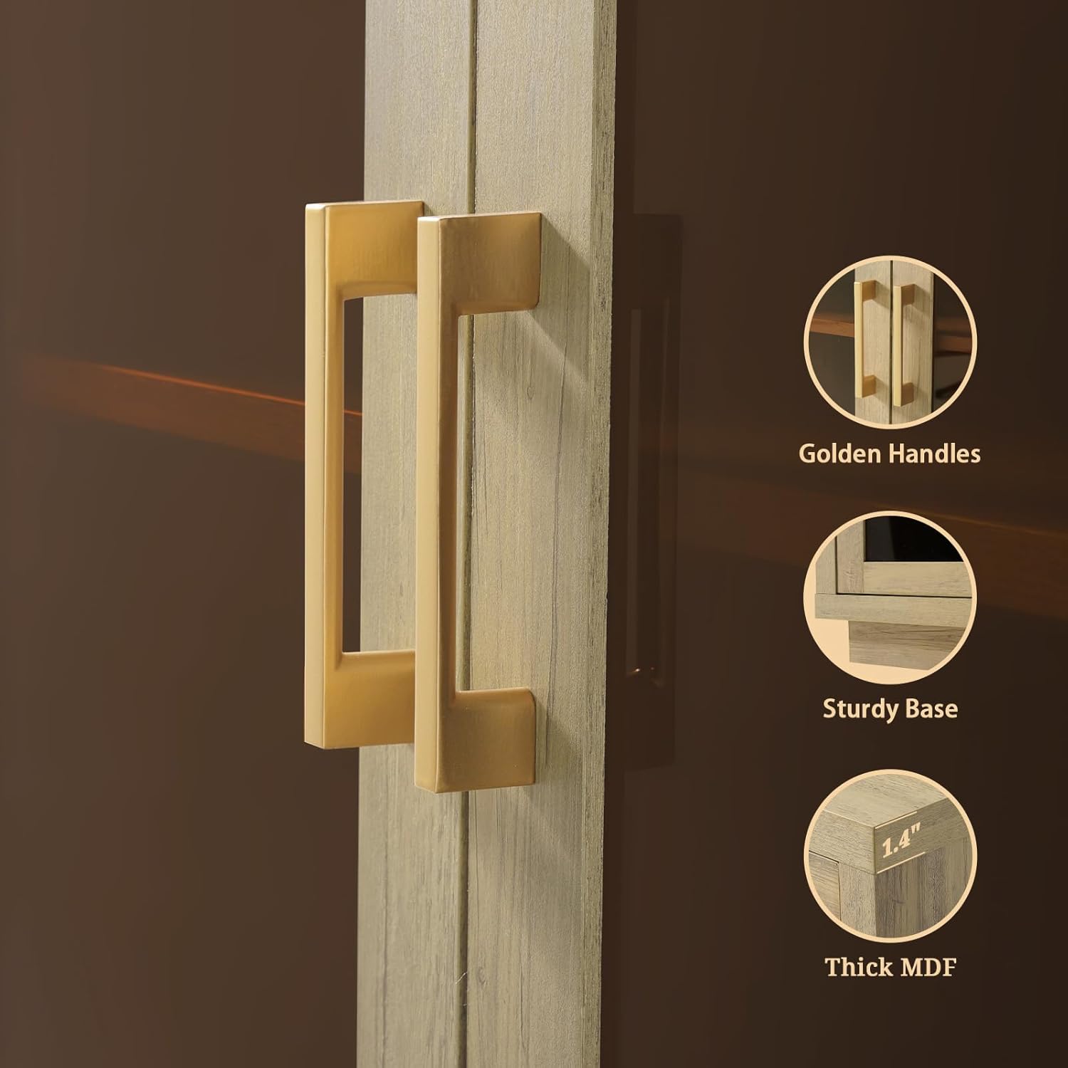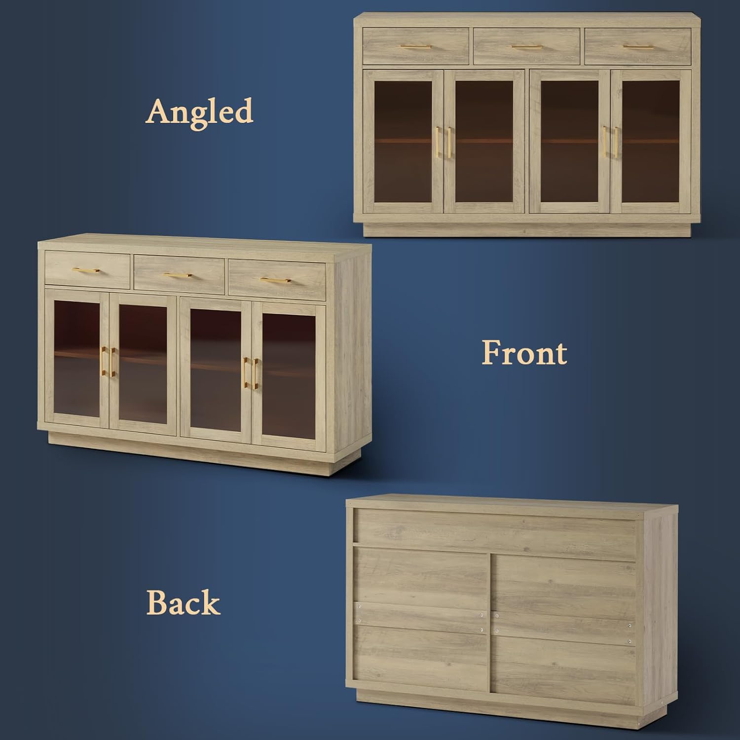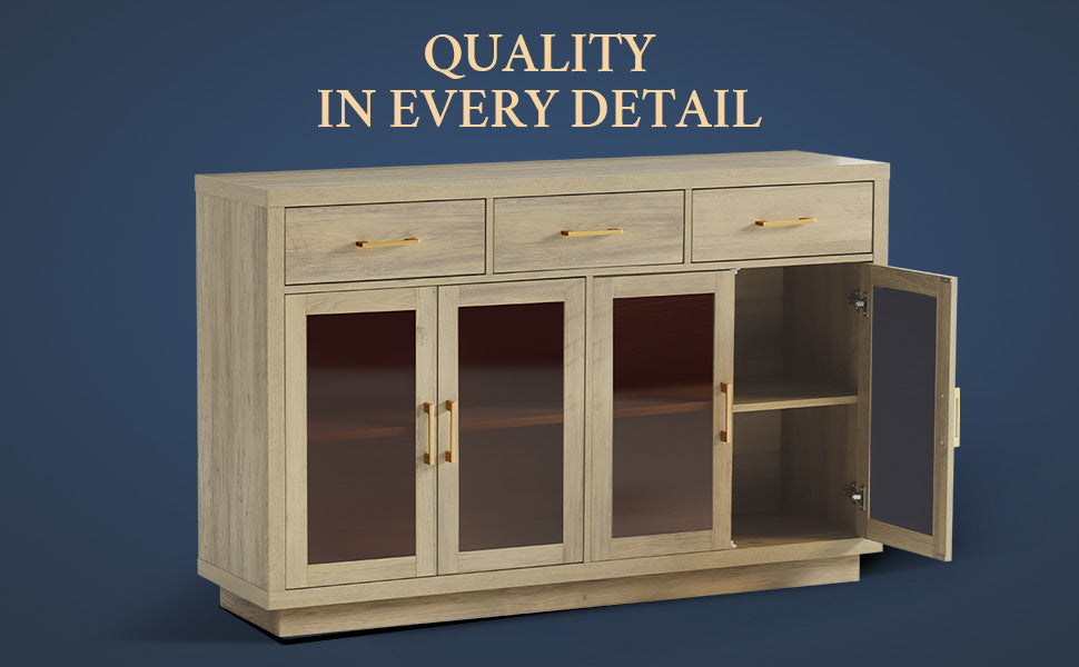 In addition to the 3 top drawers, it includes 4 tempered glass doors and adjustable height shelves, The top surface provides ample space for serving drinks or showcasing decorative items like vases or photo frames and allows you to customize the internal space to meet your storage needs and keep your room neat and organized