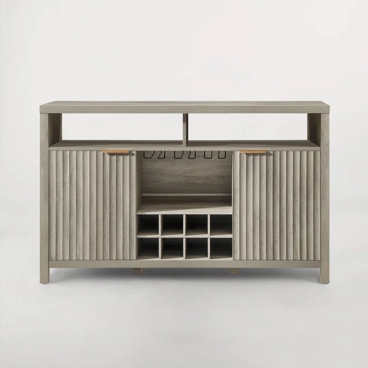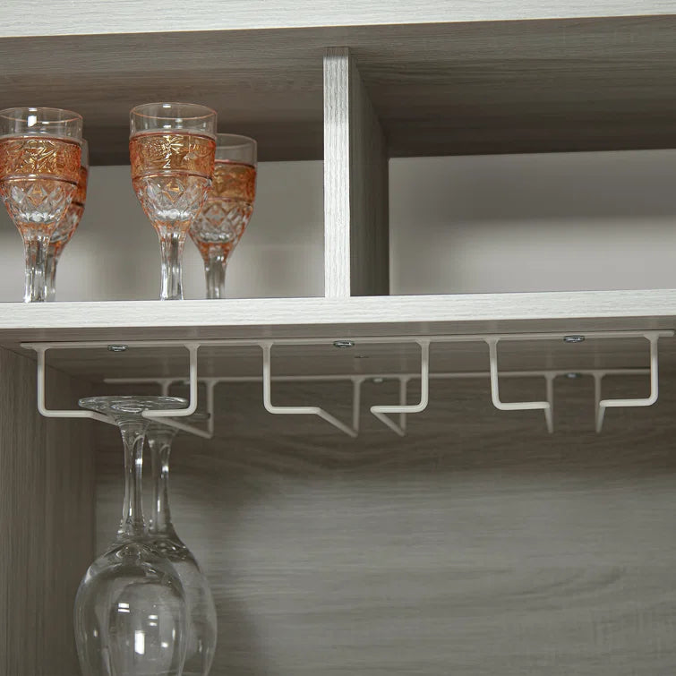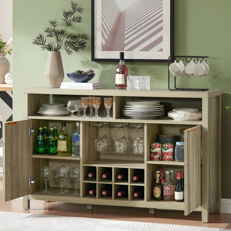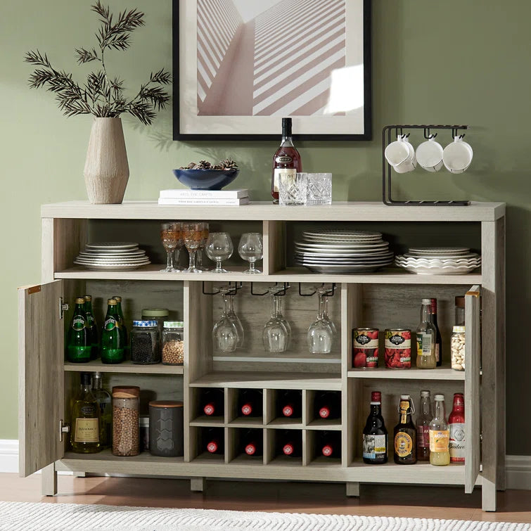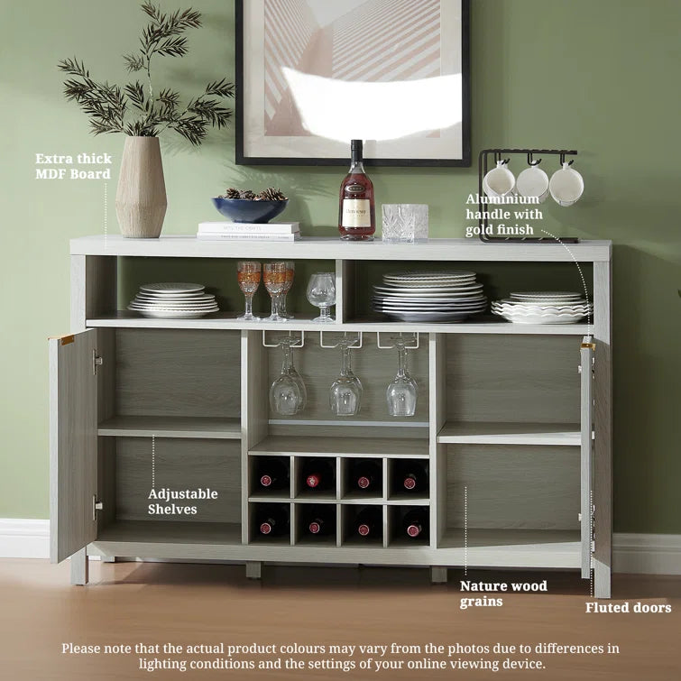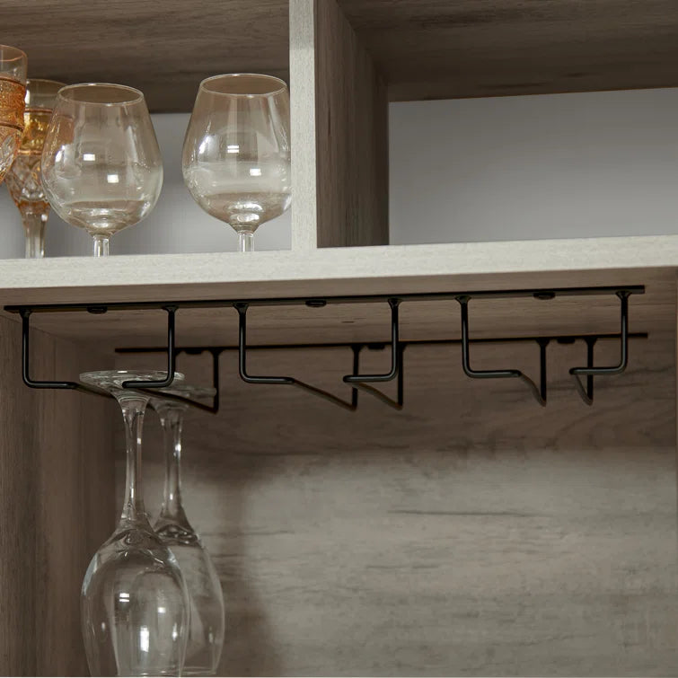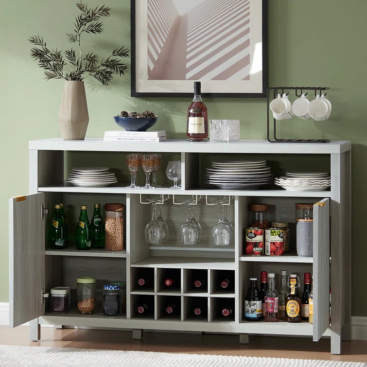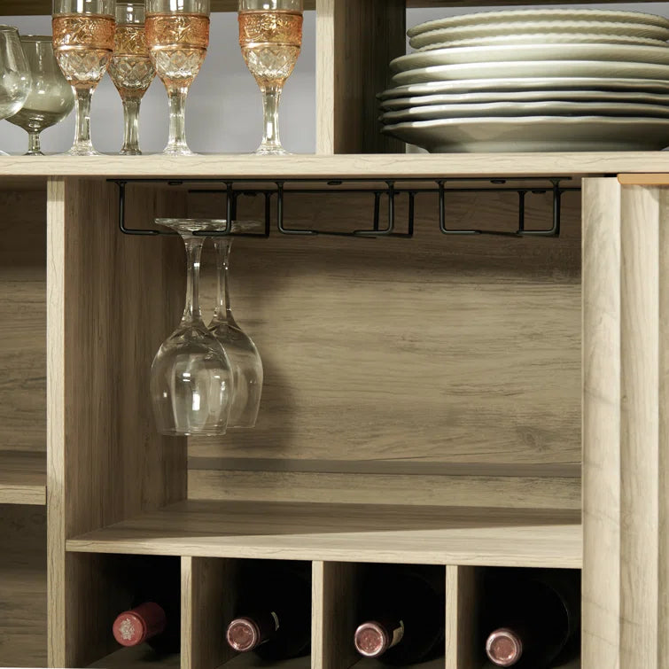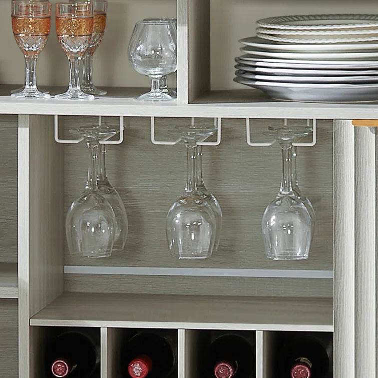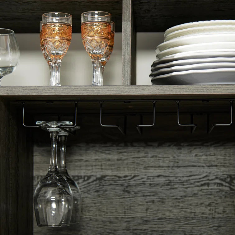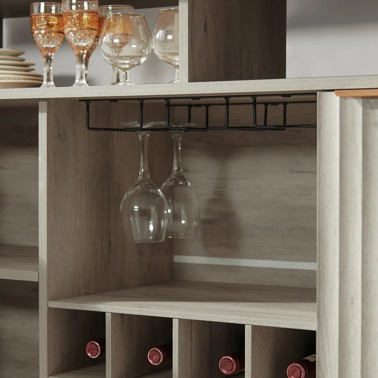 The wine bar cabinet comes complete with a dedicated space for 8 wine bottles and 3 rows of glass racks, providing an ideal solution for your wine collection. With two lockers and two storage compartments, the cabinet offers versatile storage options. The locker partitions are adjustable, allowing you to customize the space to accommodate a variety of storage needs.