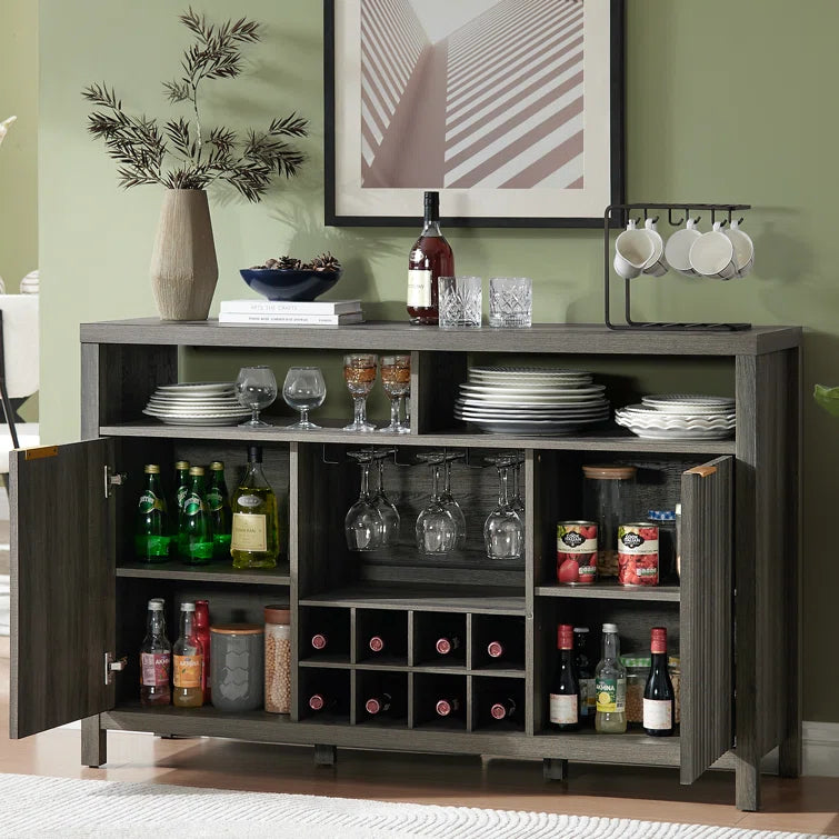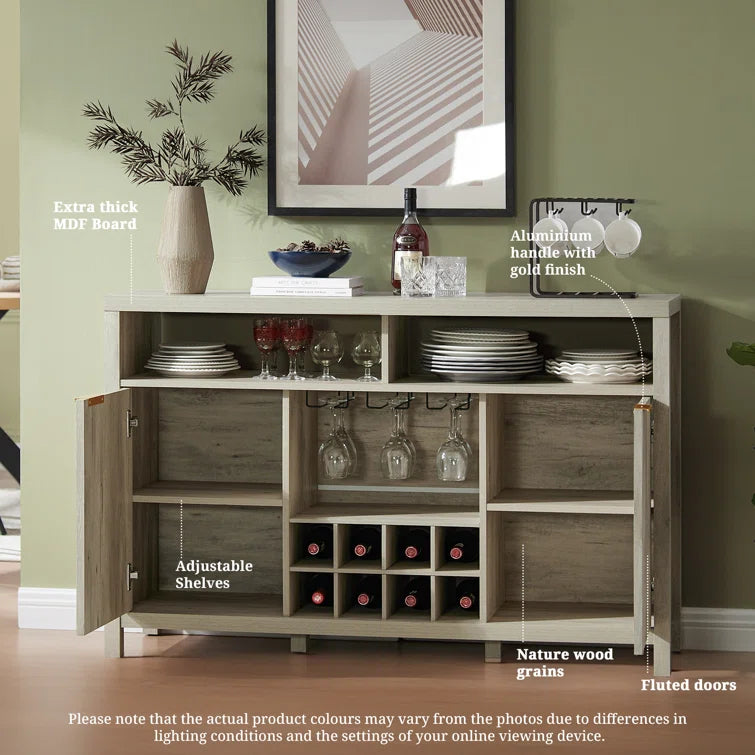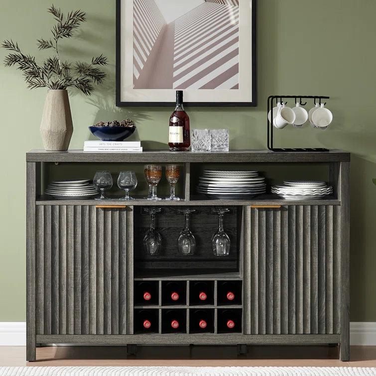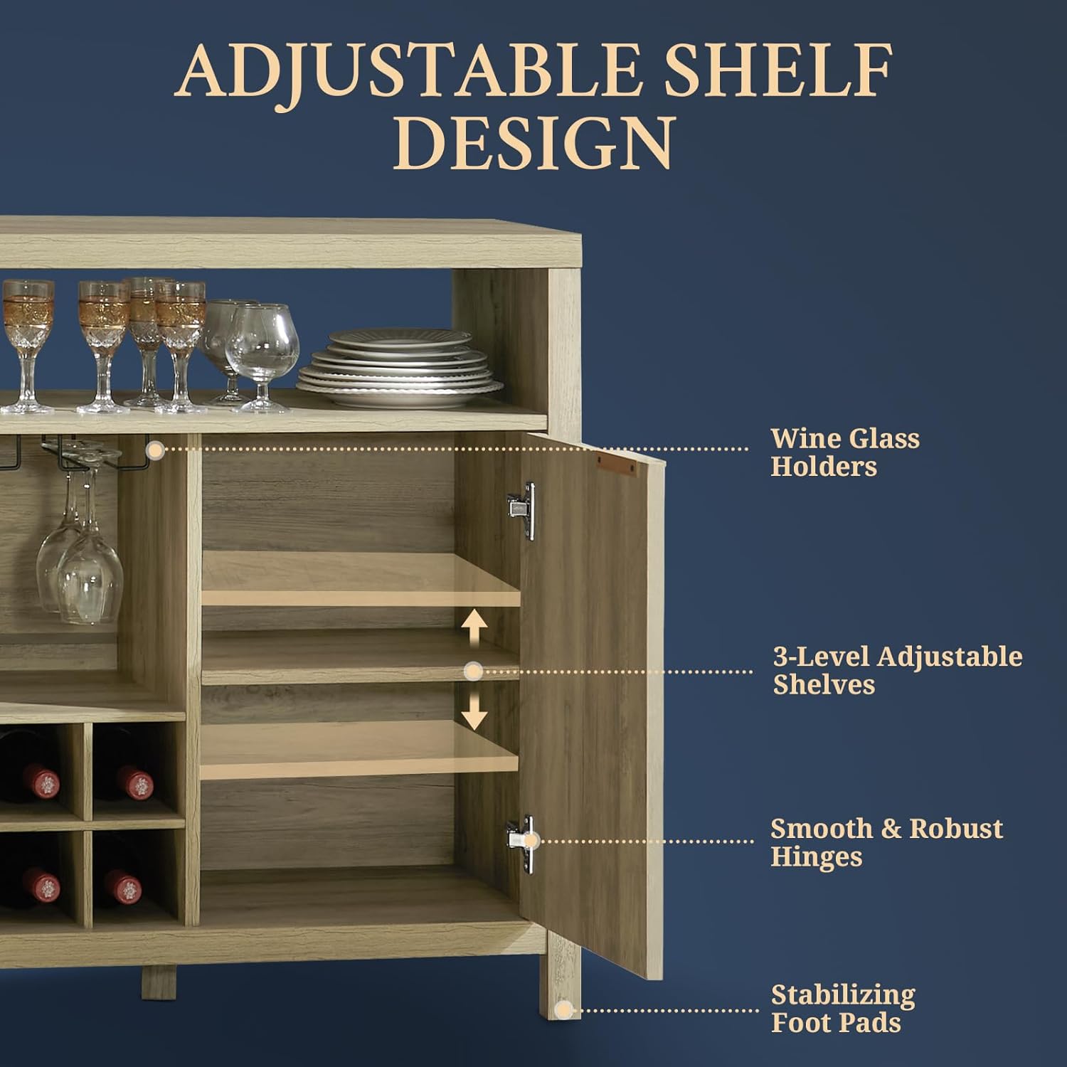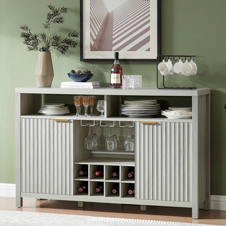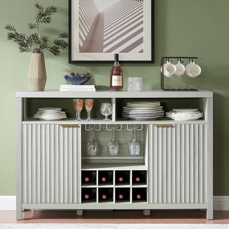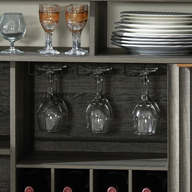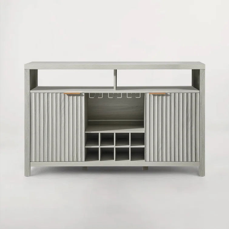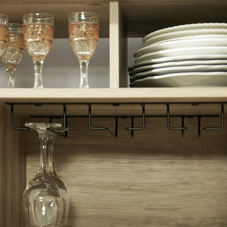 The wine bar cabinet comes complete with a dedicated space for 8 wine bottles and 3 rows of glass racks, providing an ideal solution for your wine collection. With two lockers and two storage compartments, the cabinet offers versatile storage options. The locker partitions are adjustable, allowing you to customize the space to accommodate a variety of storage needs.