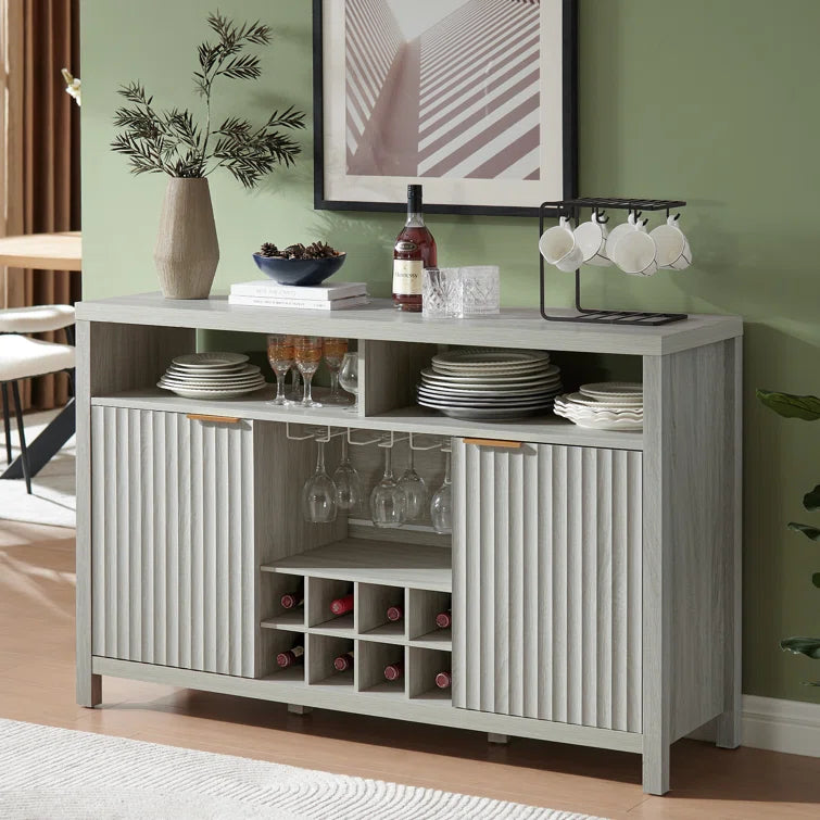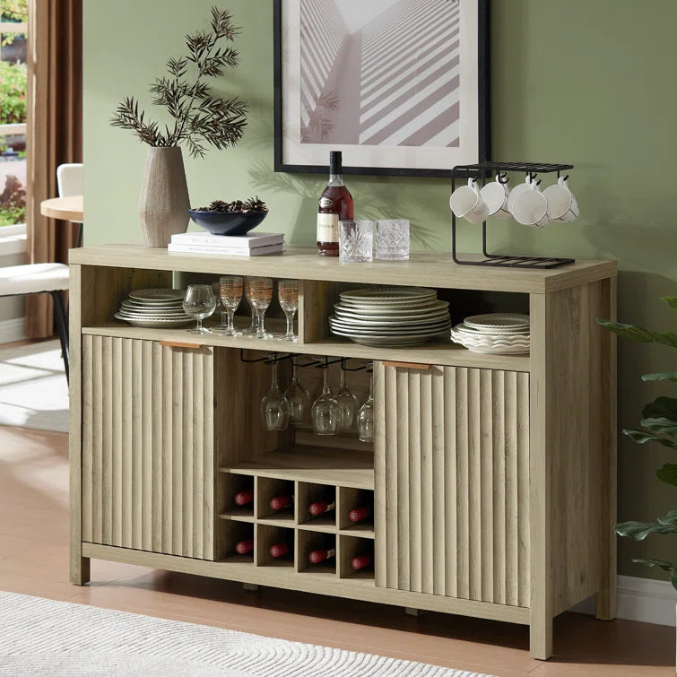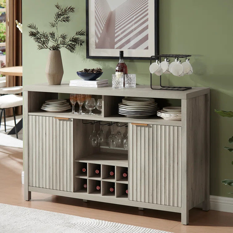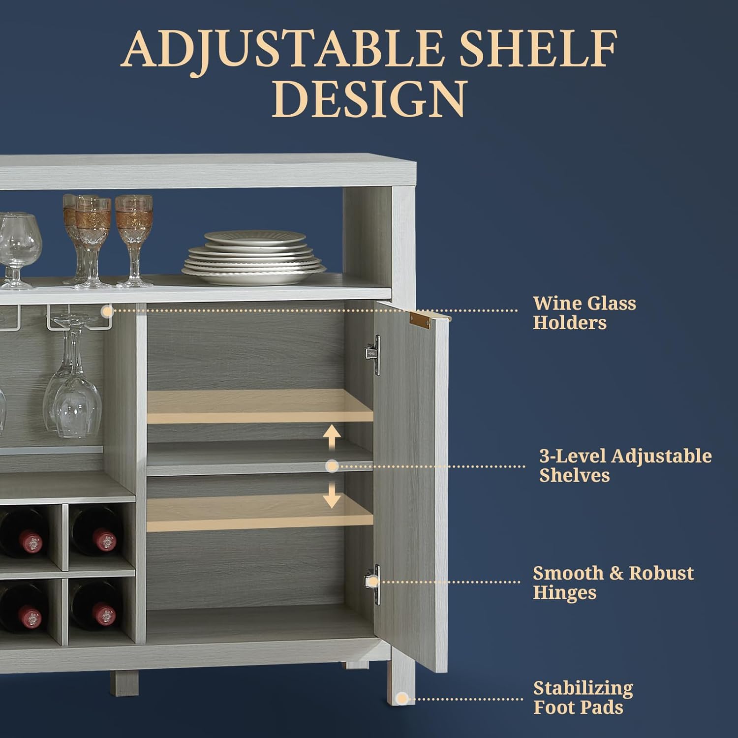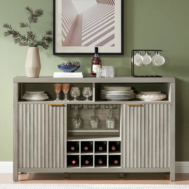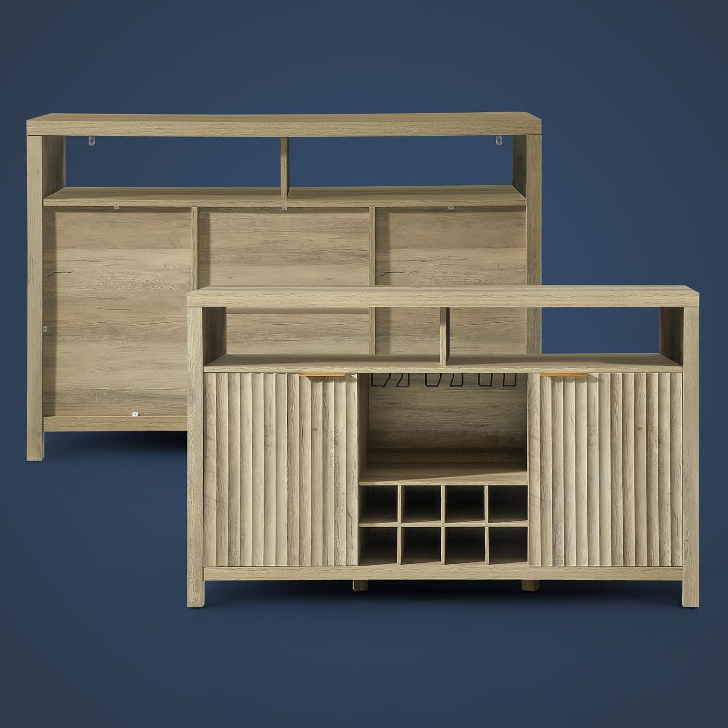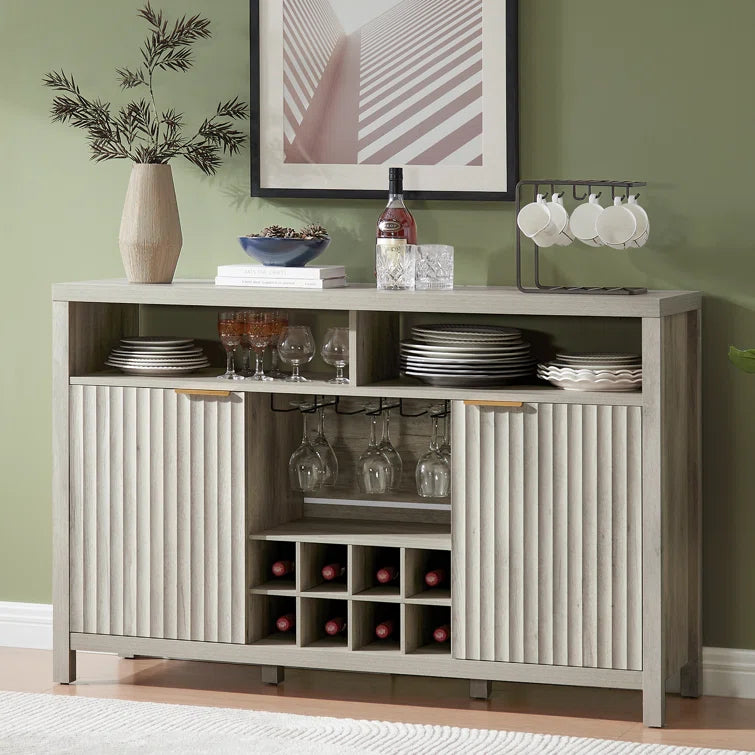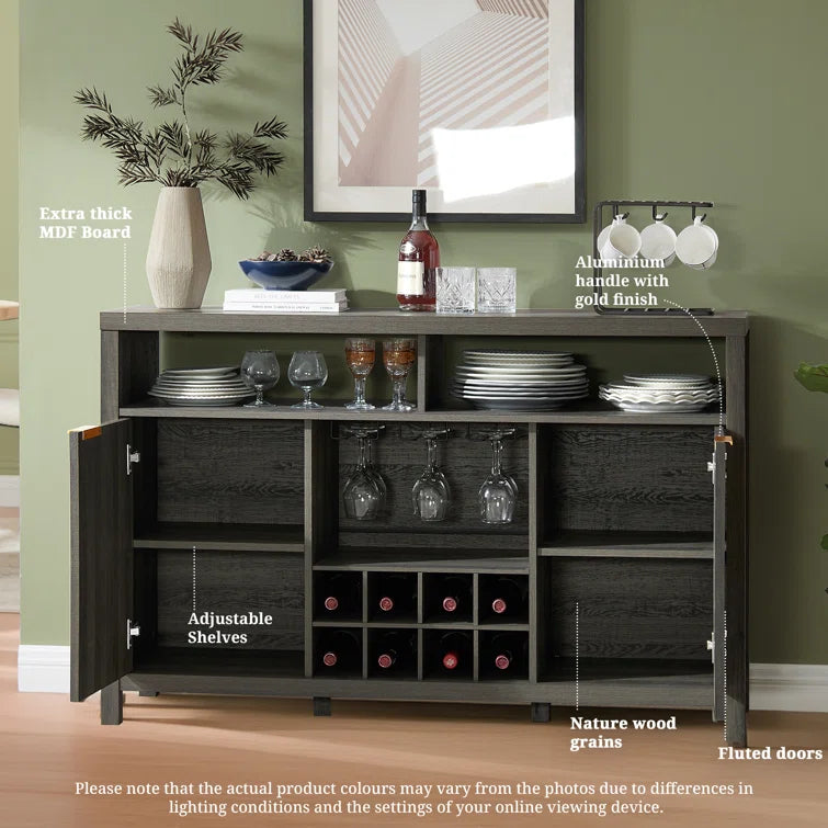 The wine bar cabinet comes complete with a dedicated space for 8 wine bottles and 3 rows of glass racks, providing an ideal solution for your wine collection. With two lockers and two storage compartments, the cabinet offers versatile storage options. The locker partitions are adjustable, allowing you to customize the space to accommodate a variety of storage needs.