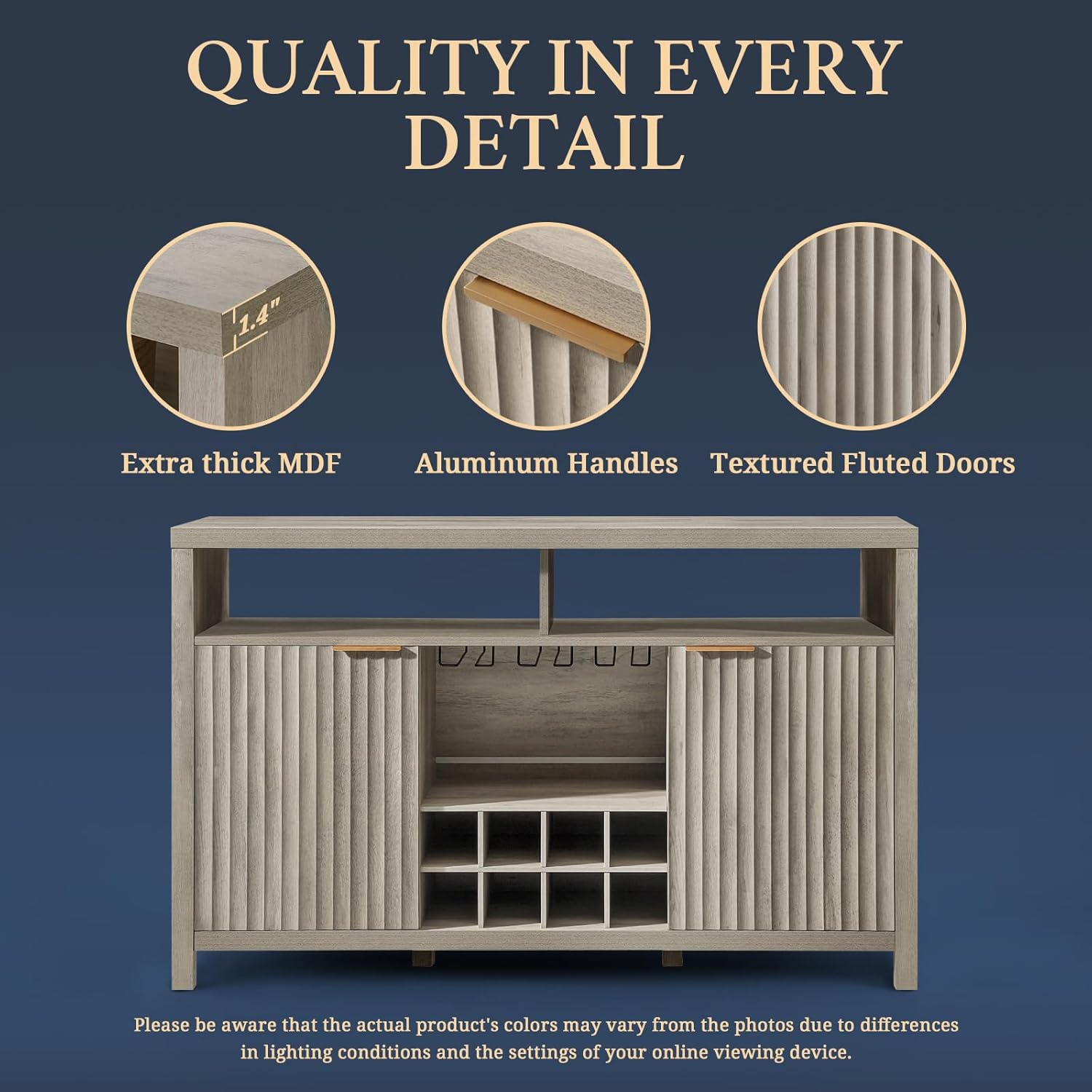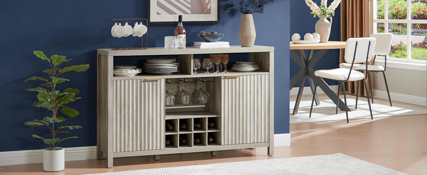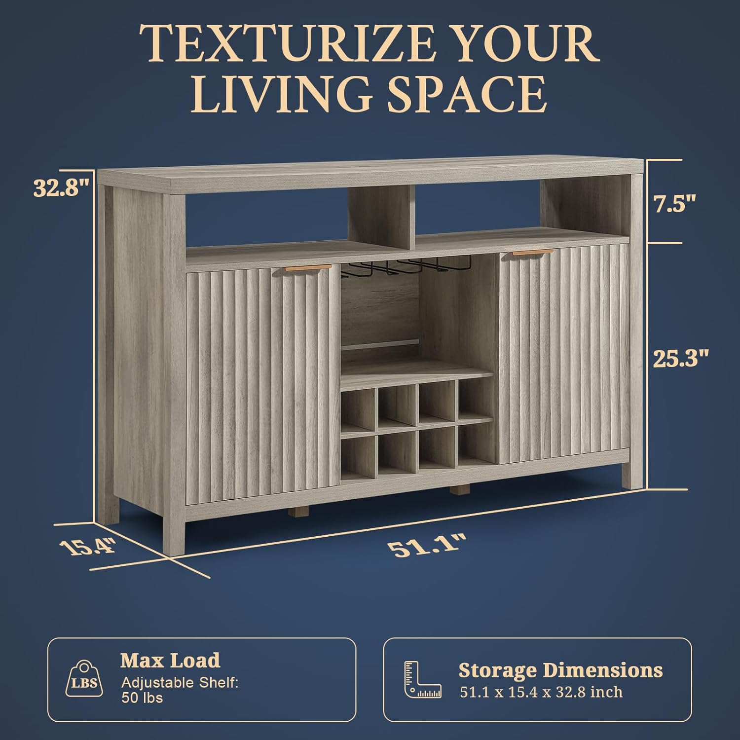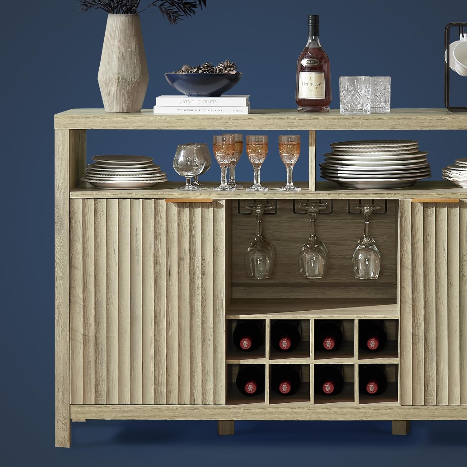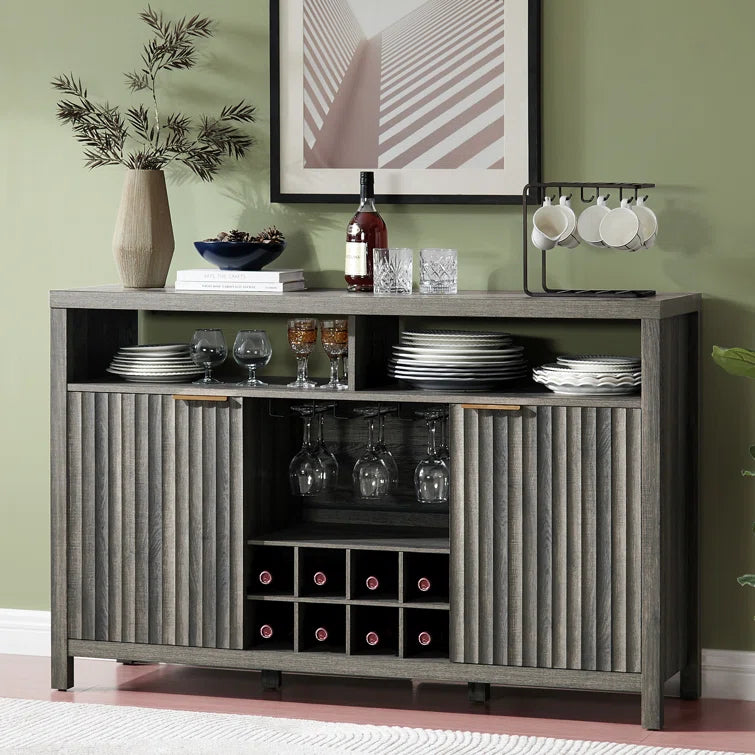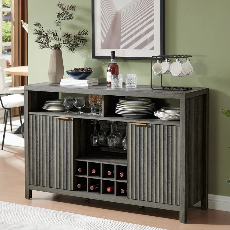The wine bar cabinet comes complete with a dedicated space for 8 wine bottles and 3 rows of glass racks, providing an ideal solution for your wine collection. With two lockers and two storage compartments, the cabinet offers versatile storage options. The locker partitions are adjustable, allowing you to customize the space to accommodate a variety of storage needs.