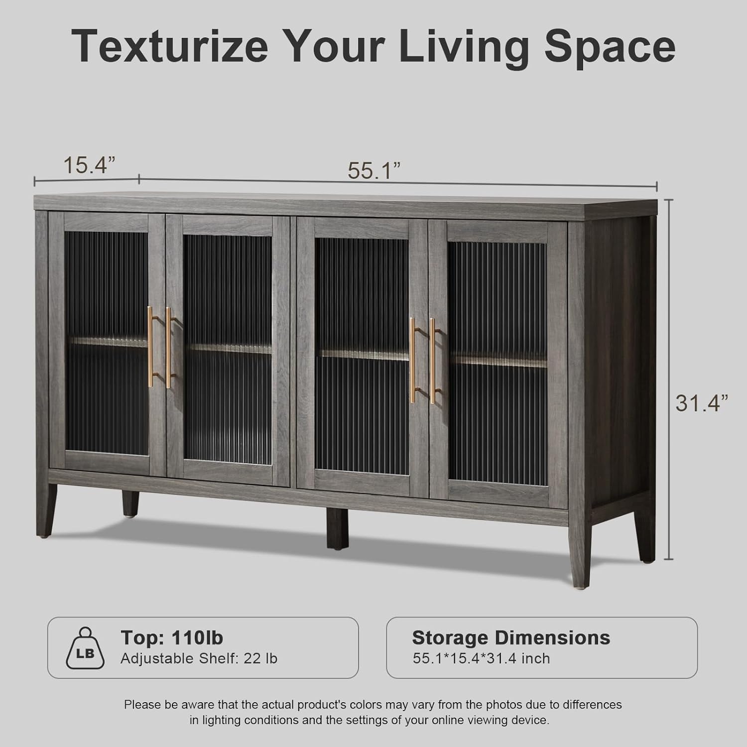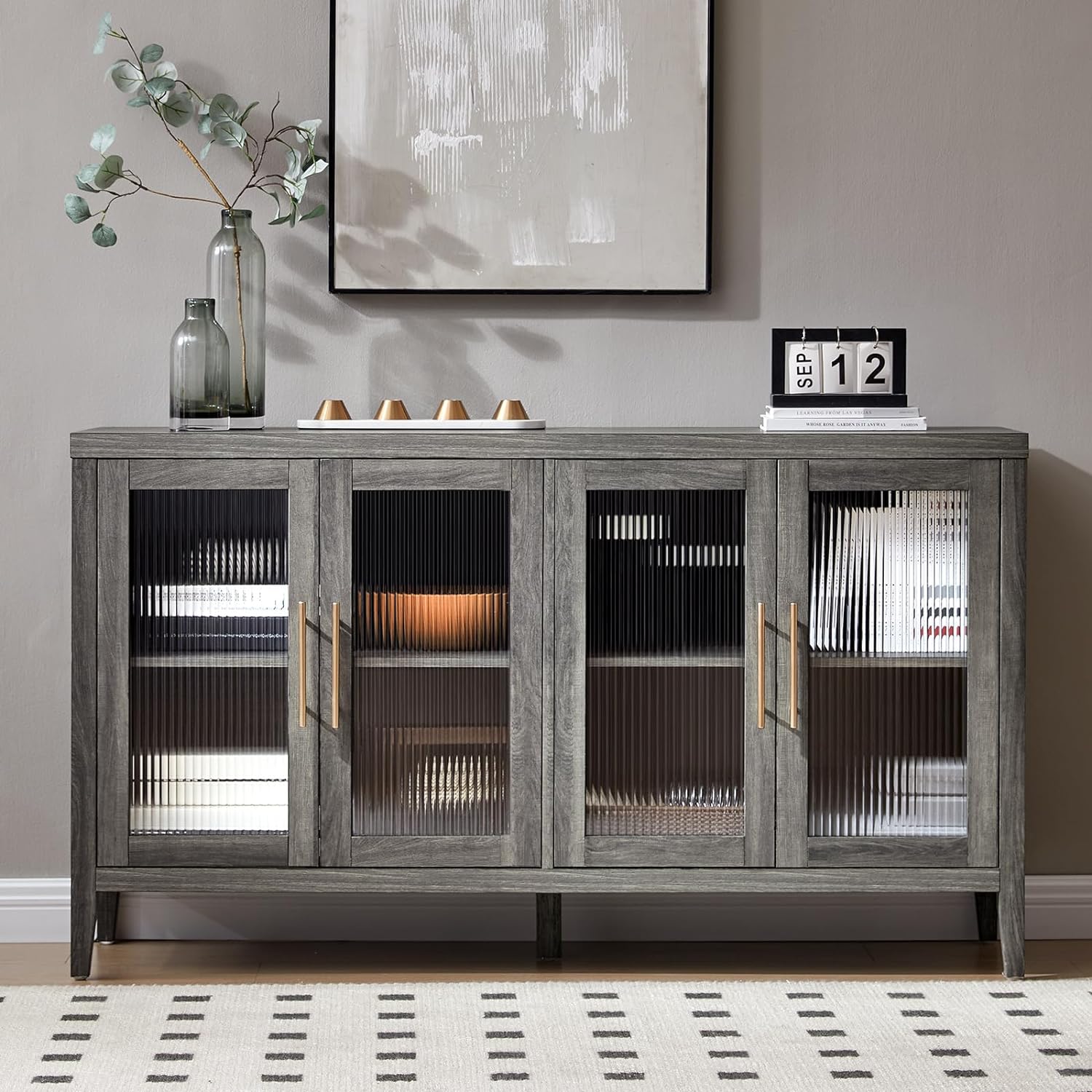 This storage cabinet has four doors and features elegant fluted glass for a chic and sophisticated look. The fluted glass design allows light to be perfectly refracted, adding a subtle mist effect to your space. Perfect for creating a warm and inviting atmosphere in any room.