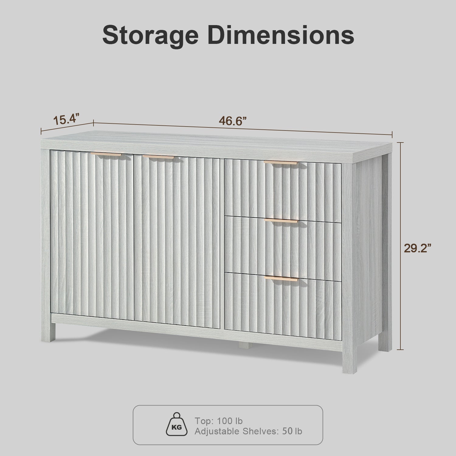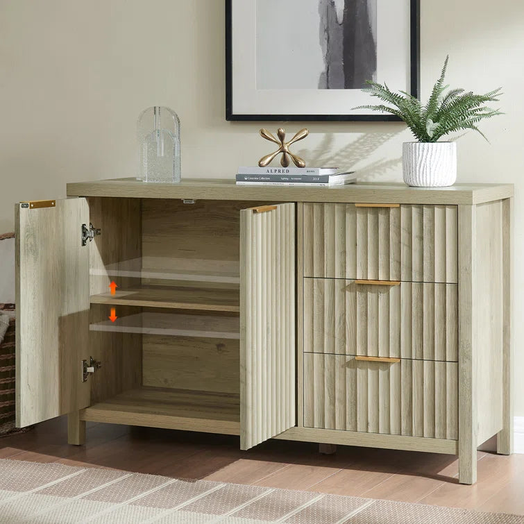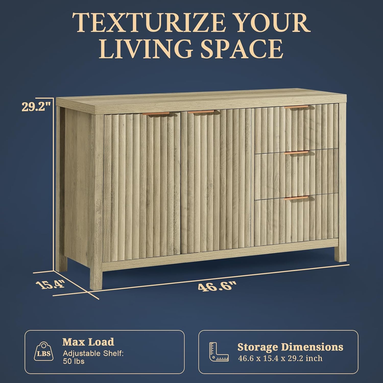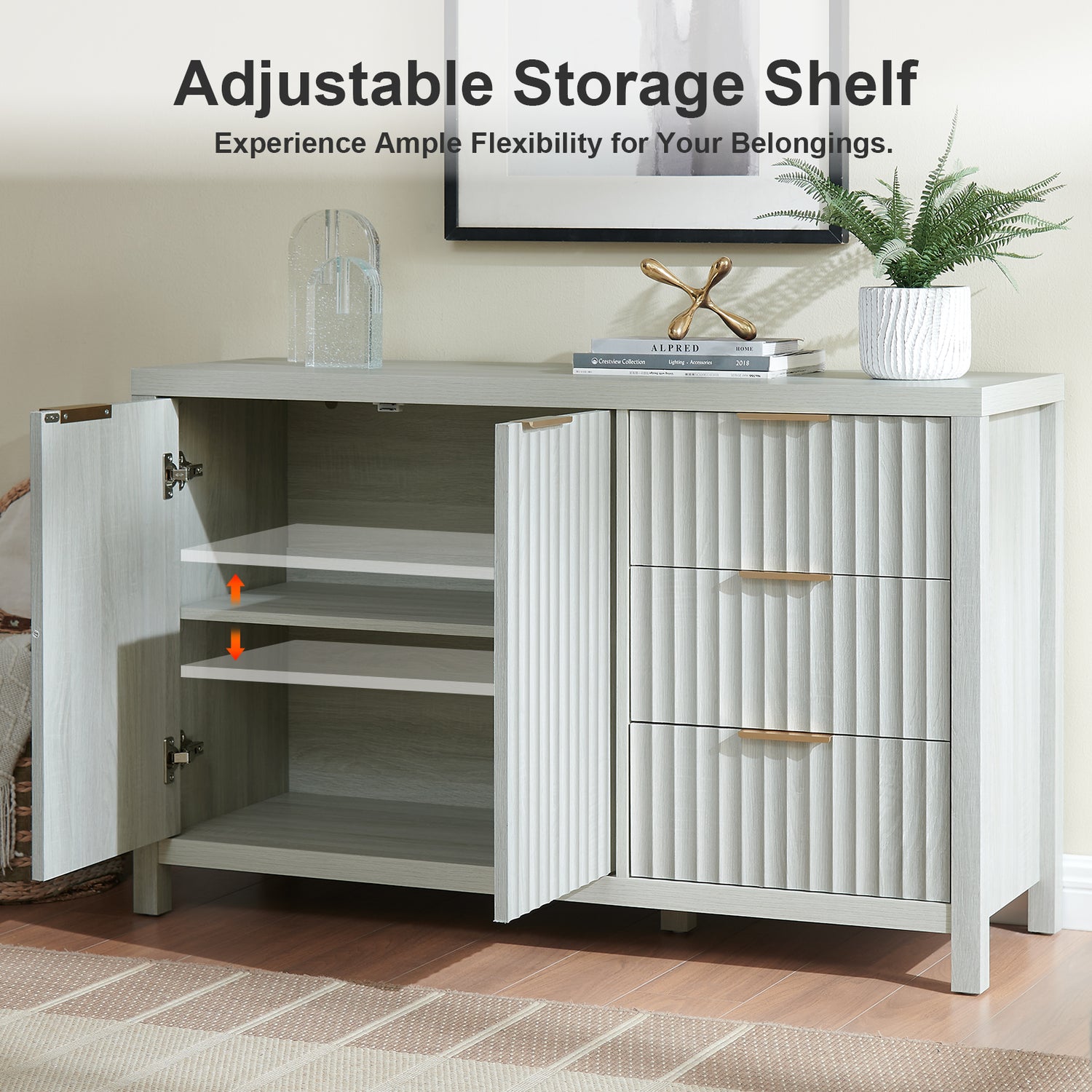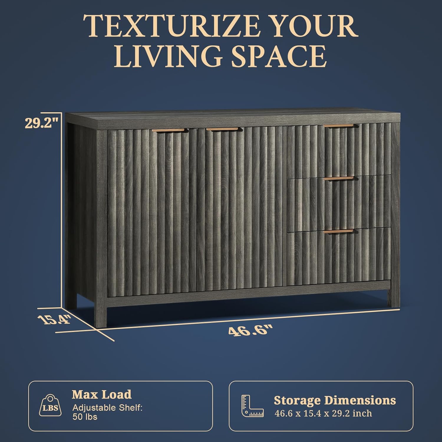 {"materialstitle":"Quality in Every Detail","image":"https://cdn.shopify.com/s/files/1/0780/4230/0713/files/1_0aa645cb-7537-4df8-bb36-3009a785778f.jpg?v=1722254869","paragraph":["This accent cabinet features hand-carved wavy patterns on each panel, enhancing the modern appeal and visual depth of your space, infusing every corner with a stylish and elegant ambiance.!","【3-Level Adjustable Shelves】This intricately designed buffet cabinet includes two doors and three drawers, with three adjustable shelves for flexible storage customization according to personal needs.","【Durable and Sturdy】 This modern sideboard is made from exterior grade MDF, enhancing both structural stability and durability. The 1.4-inch thick top ensures excellent load-bearing capacity, making it perfect for displaying decorative items.","【Product Dimensions】Total Dimensions: 46.69 L x 15.43 W x 29.21 H | Individual Storage: 25.98 L x 13.78 W x 23.62 H | Each Drawer: 16.54L x 13.78W x 5.71H inches | Maximum Top Panel Load: Maximum Top Panel Load: 100 lbs | Maximum Adjustable Shelves Load: 50 lbs | Maximum Drawers Load: 20 lbs | Cabinet leg height: 2.76 in.","【Easy to Assemble】This fluted credenza comes with clear, detailed instructions, numbered parts, and all necessary tools for assembly. Follow our video tutorial for easy setup, or reach out to our professional team for further assistance."]}