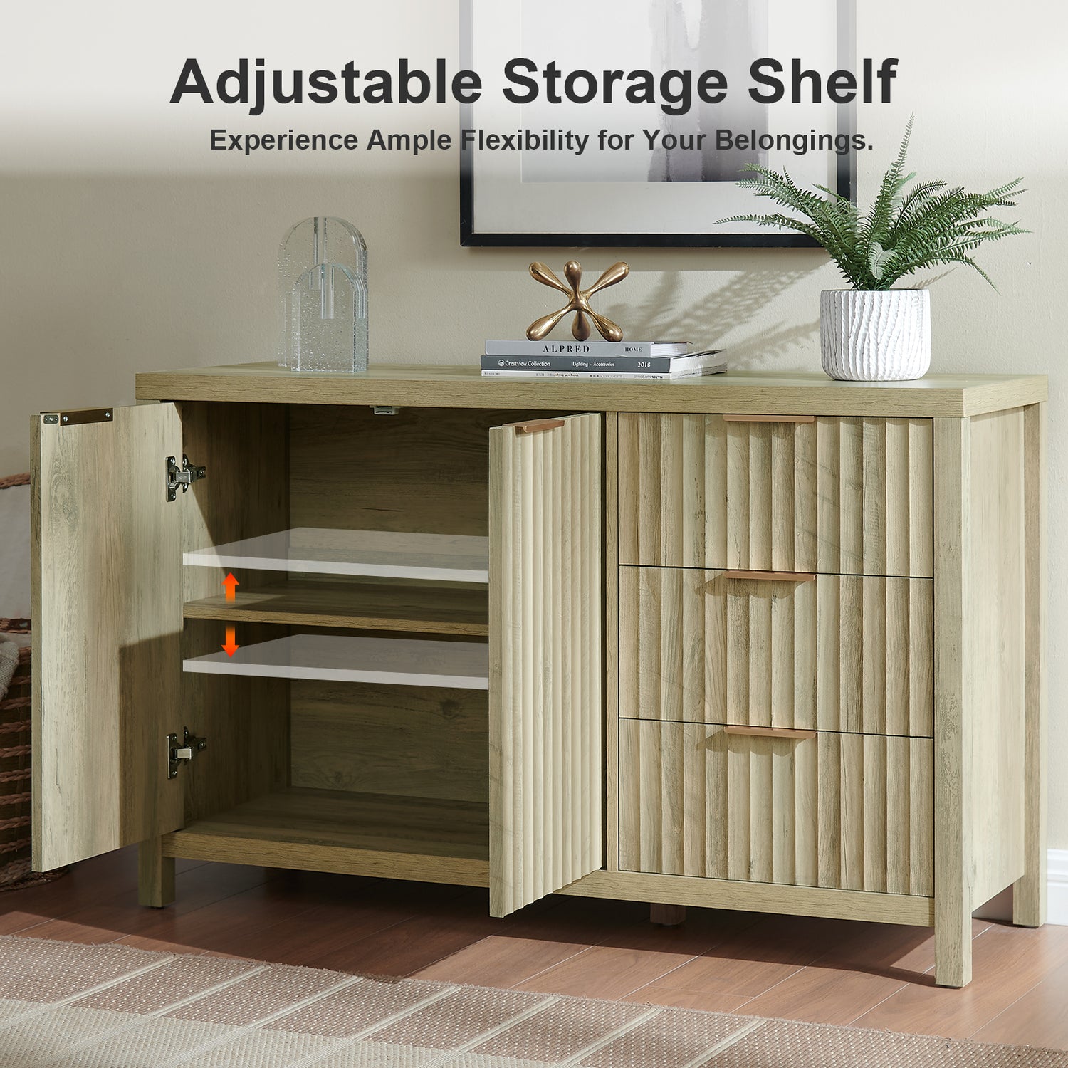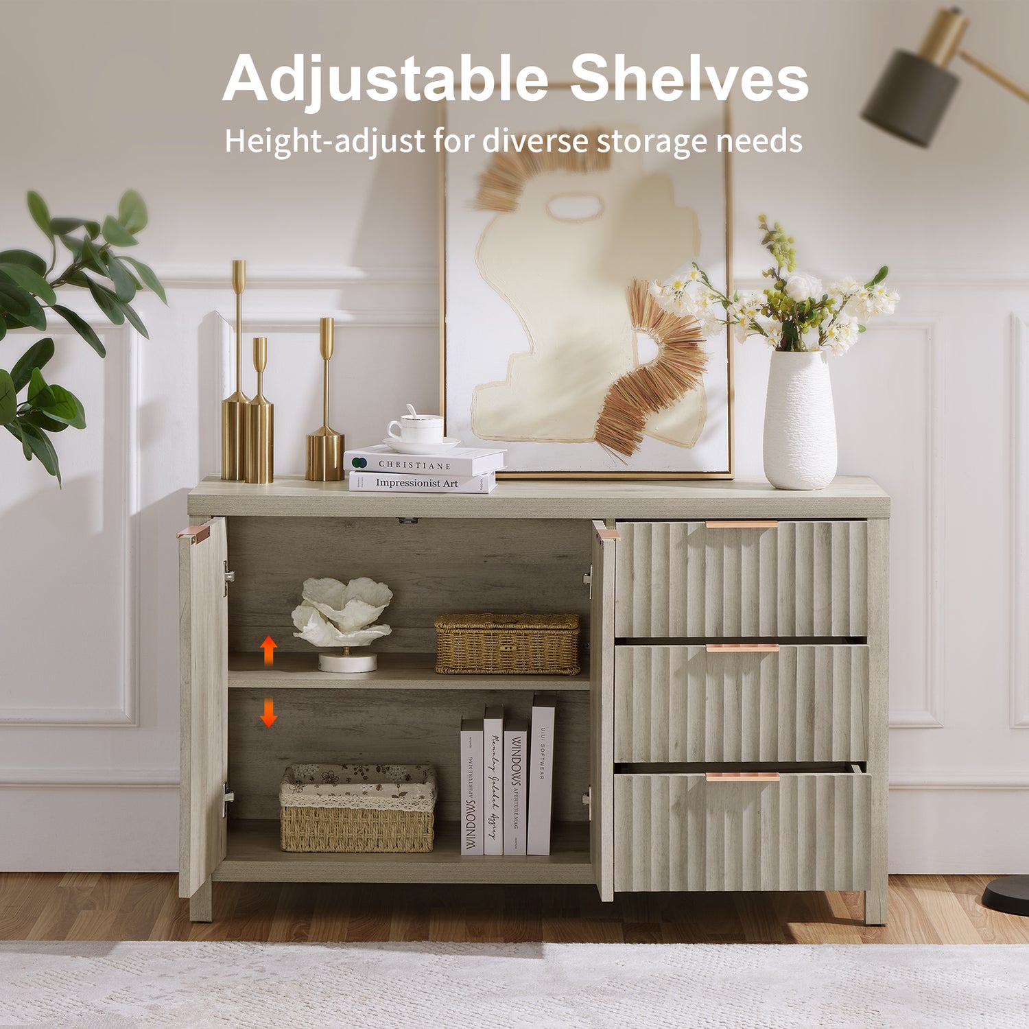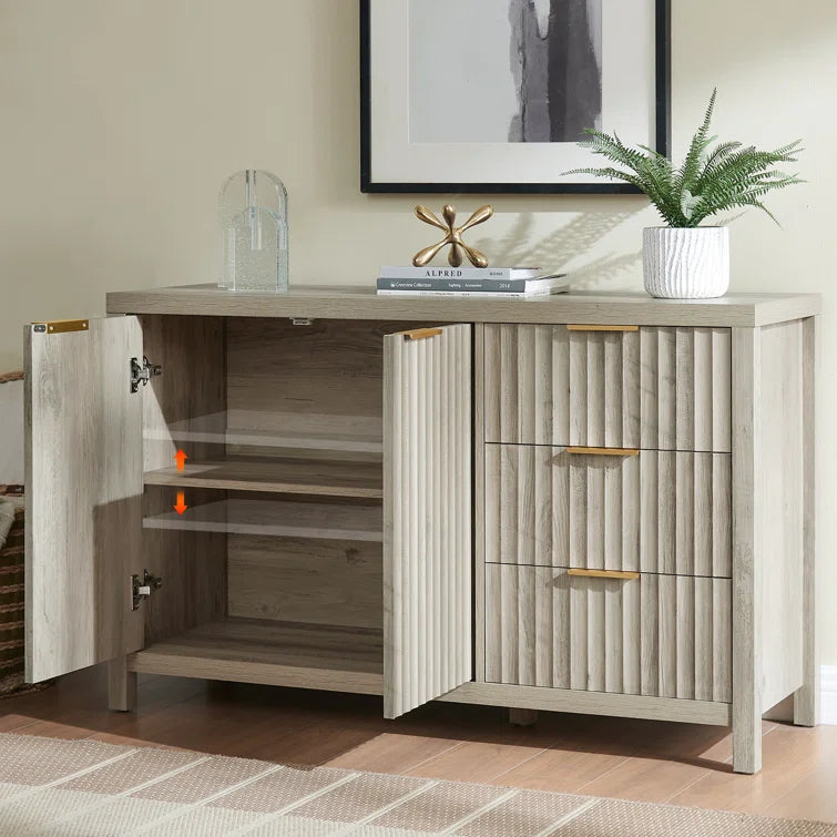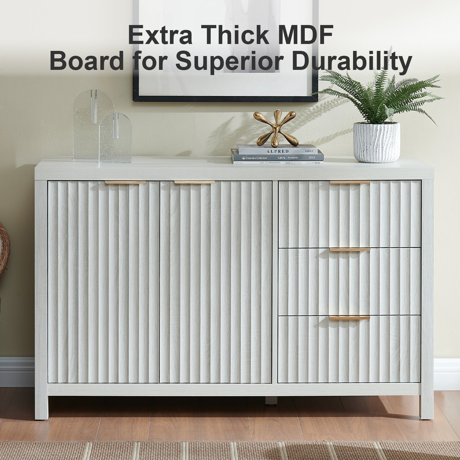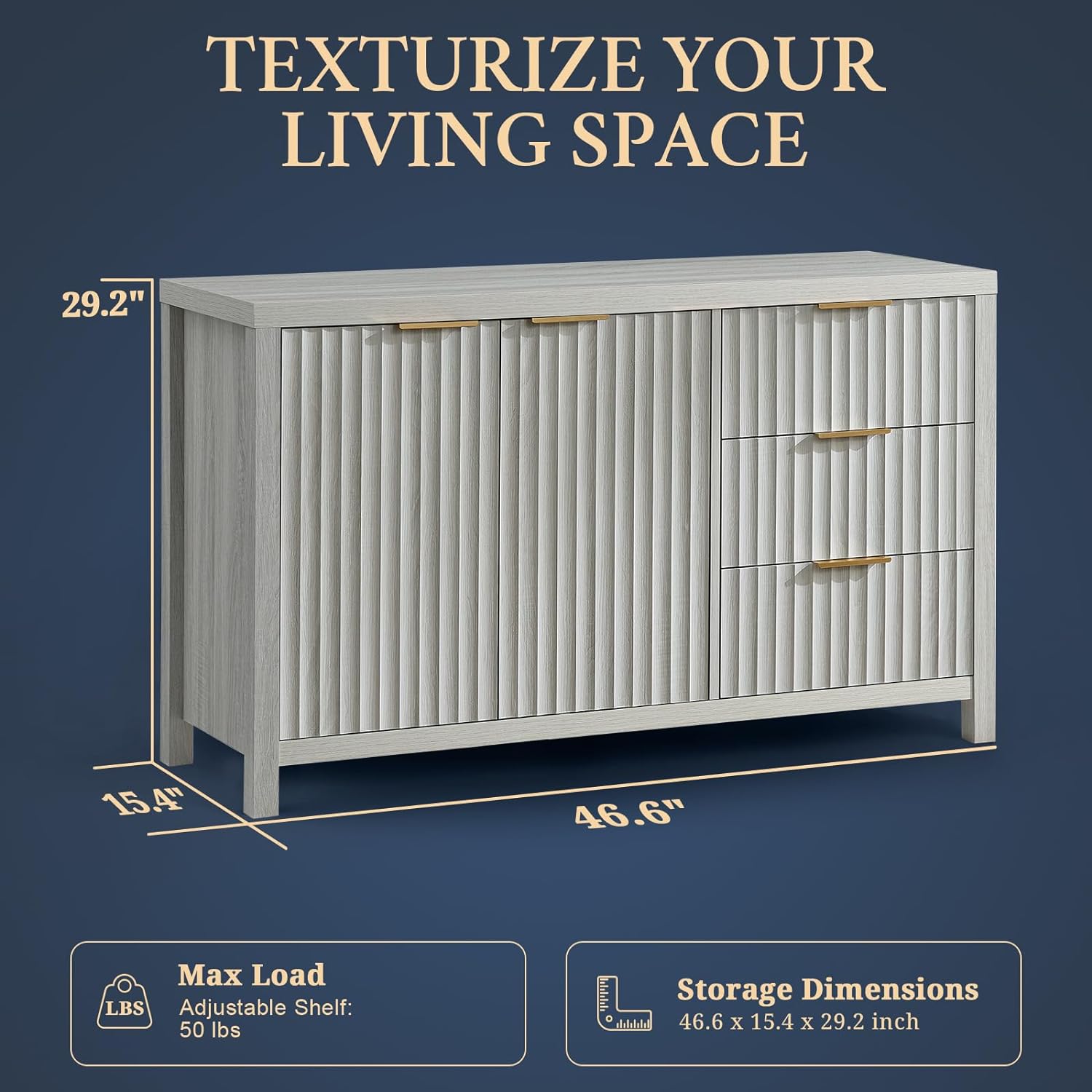 {"materialstitle":"Quality in Every Detail","image":"https://cdn.shopify.com/s/files/1/0780/4230/0713/files/1_0aa645cb-7537-4df8-bb36-3009a785778f.jpg?v=1722254869","paragraph":["This accent cabinet features hand-carved wavy patterns on each panel, enhancing the modern appeal and visual depth of your space, infusing every corner with a stylish and elegant ambiance.!","【3-Level Adjustable Shelves】This intricately designed buffet cabinet includes two doors and three drawers, with three adjustable shelves for flexible storage customization according to personal needs.","【Durable and Sturdy】 This modern sideboard is made from exterior grade MDF, enhancing both structural stability and durability. The 1.4-inch thick top ensures excellent load-bearing capacity, making it perfect for displaying decorative items.","【Product Dimensions】Total Dimensions: 46.69 L x 15.43 W x 29.21 H | Individual Storage: 25.98 L x 13.78 W x 23.62 H | Each Drawer: 16.54L x 13.78W x 5.71H inches | Maximum Top Panel Load: Maximum Top Panel Load: 100 lbs | Maximum Adjustable Shelves Load: 50 lbs | Maximum Drawers Load: 20 lbs | Cabinet leg height: 2.76 in.","【Easy to Assemble】This fluted credenza comes with clear, detailed instructions, numbered parts, and all necessary tools for assembly. Follow our video tutorial for easy setup, or reach out to our professional team for further assistance."]}