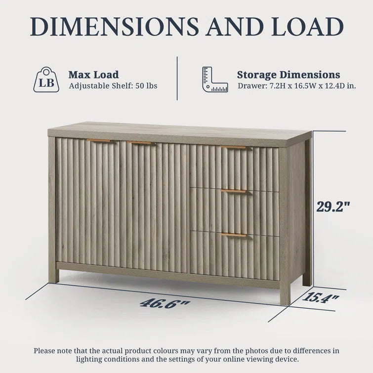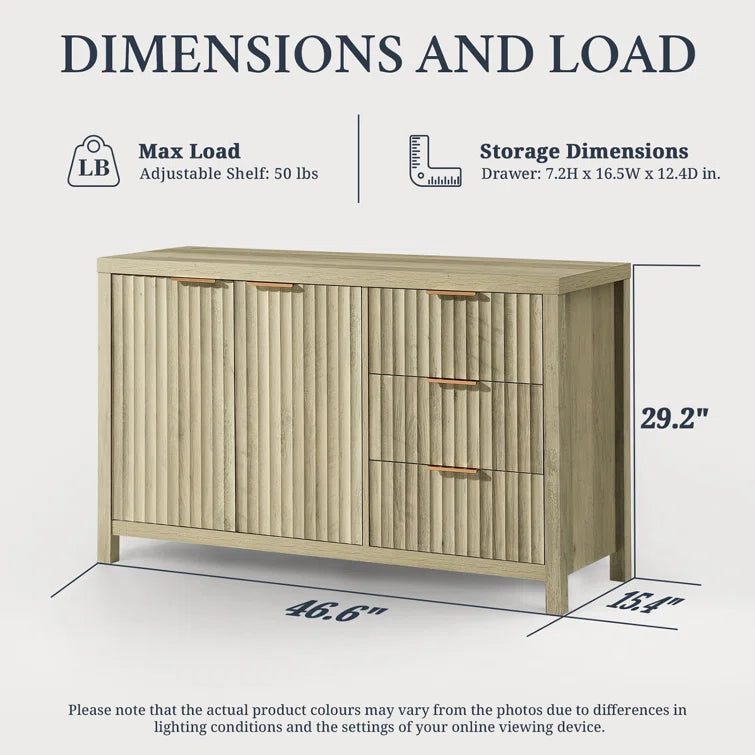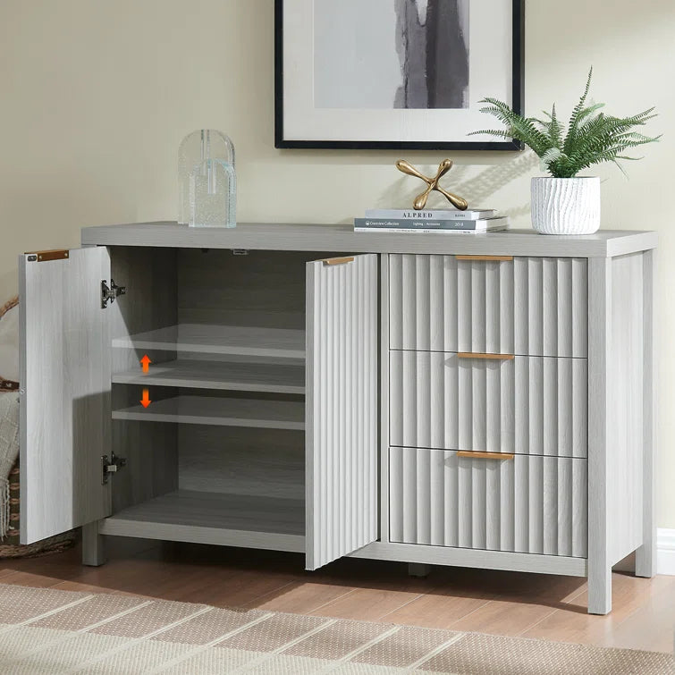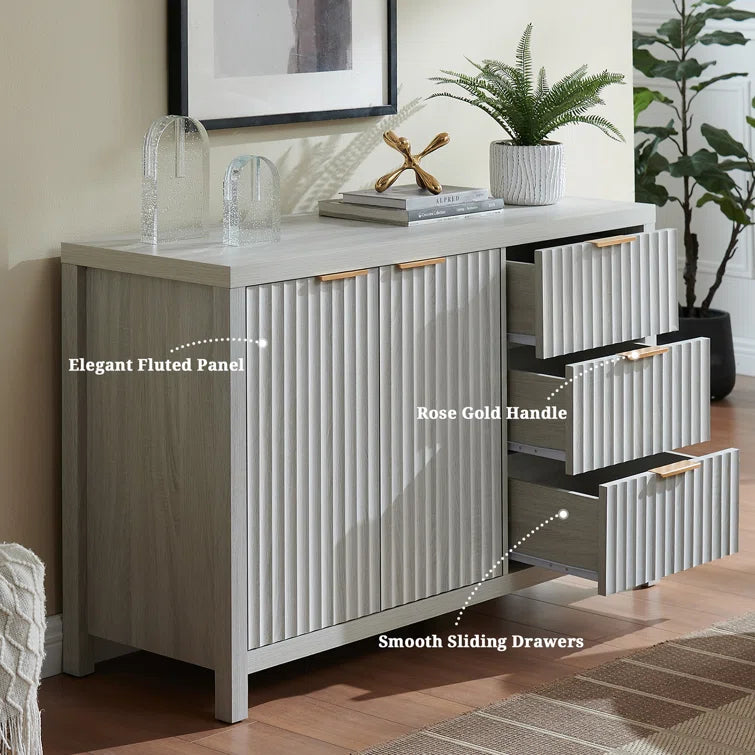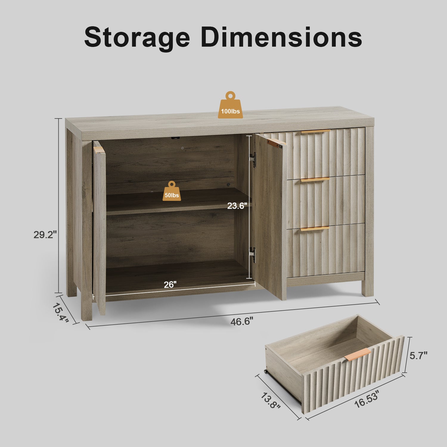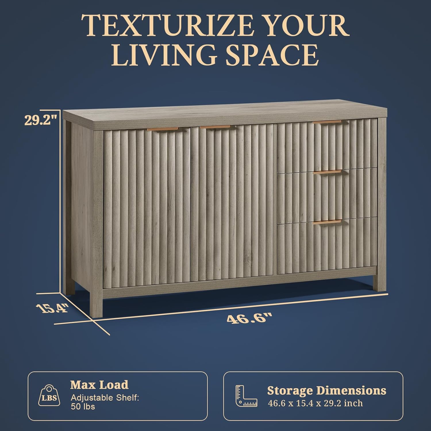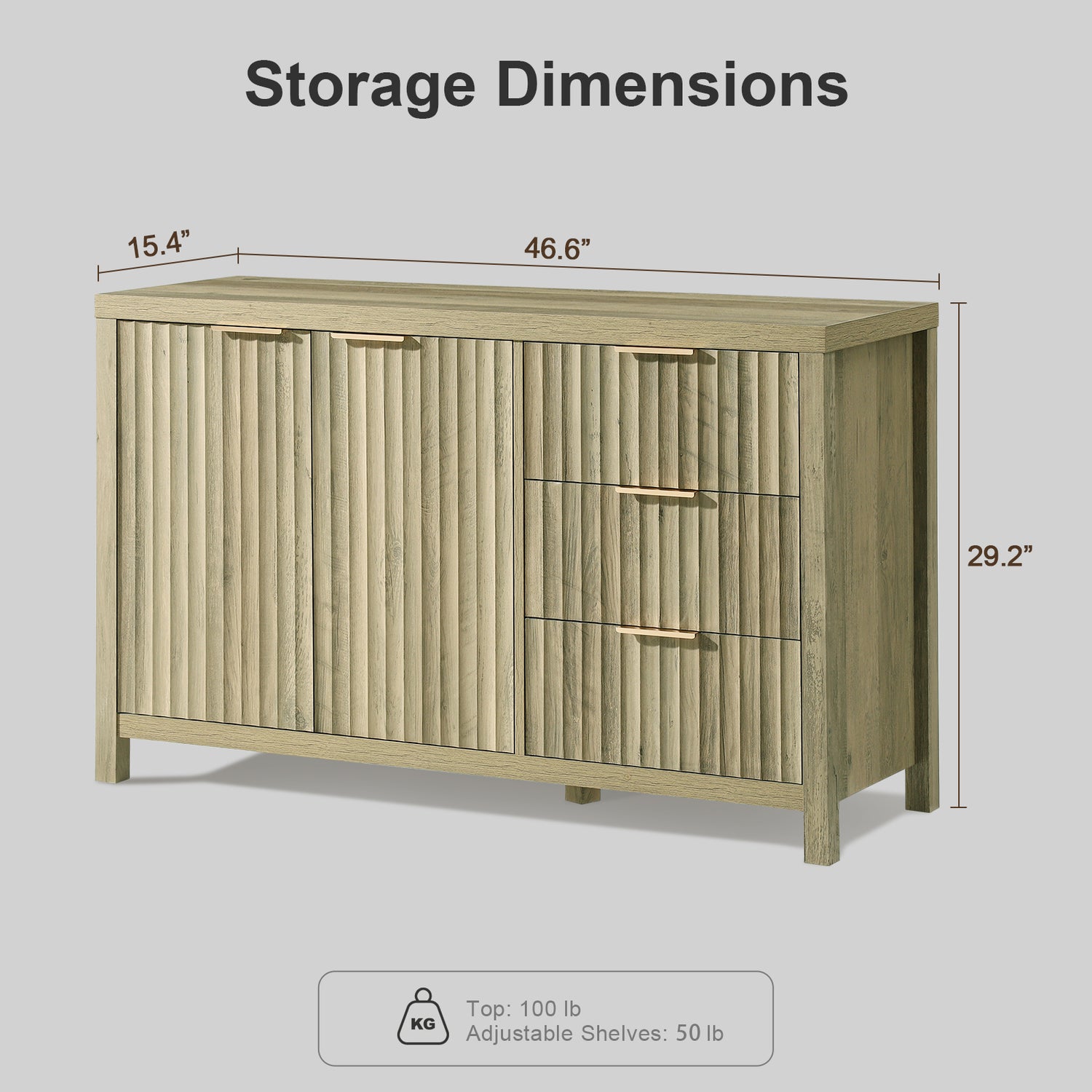 {"materialstitle":"Quality in Every Detail","image":"https://cdn.shopify.com/s/files/1/0780/4230/0713/files/1_0aa645cb-7537-4df8-bb36-3009a785778f.jpg?v=1722254869","paragraph":["This accent cabinet features hand-carved wavy patterns on each panel, enhancing the modern appeal and visual depth of your space, infusing every corner with a stylish and elegant ambiance.!","【3-Level Adjustable Shelves】This intricately designed buffet cabinet includes two doors and three drawers, with three adjustable shelves for flexible storage customization according to personal needs.","【Durable and Sturdy】 This modern sideboard is made from exterior grade MDF, enhancing both structural stability and durability. The 1.4-inch thick top ensures excellent load-bearing capacity, making it perfect for displaying decorative items.","【Product Dimensions】Total Dimensions: 46.69 L x 15.43 W x 29.21 H | Individual Storage: 25.98 L x 13.78 W x 23.62 H | Each Drawer: 16.54L x 13.78W x 5.71H inches | Maximum Top Panel Load: Maximum Top Panel Load: 100 lbs | Maximum Adjustable Shelves Load: 50 lbs | Maximum Drawers Load: 20 lbs | Cabinet leg height: 2.76 in.","【Easy to Assemble】This fluted credenza comes with clear, detailed instructions, numbered parts, and all necessary tools for assembly. Follow our video tutorial for easy setup, or reach out to our professional team for further assistance."]}