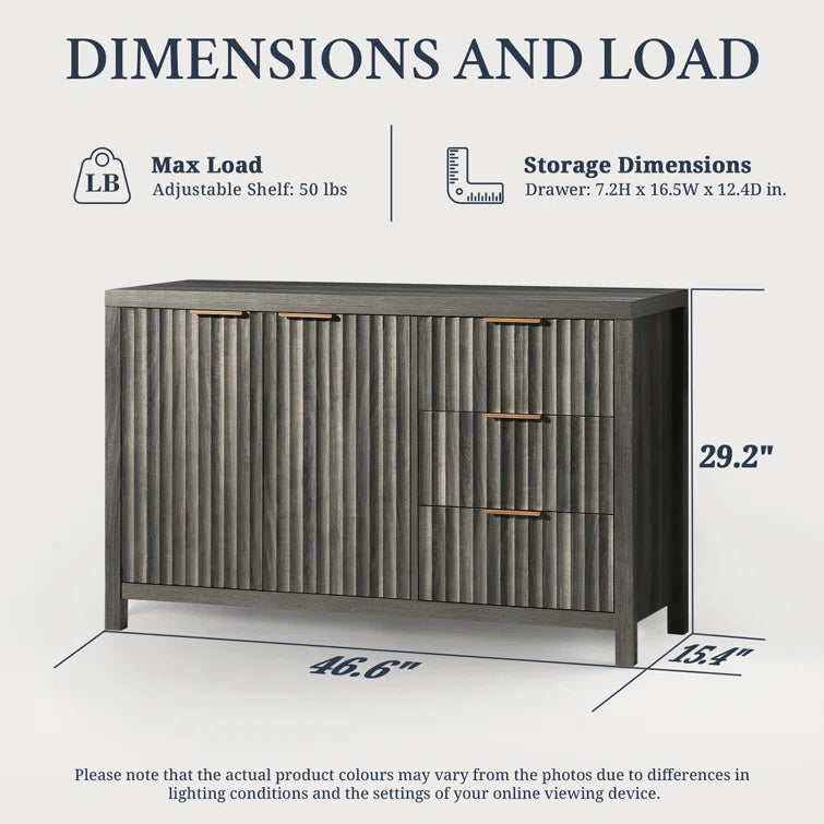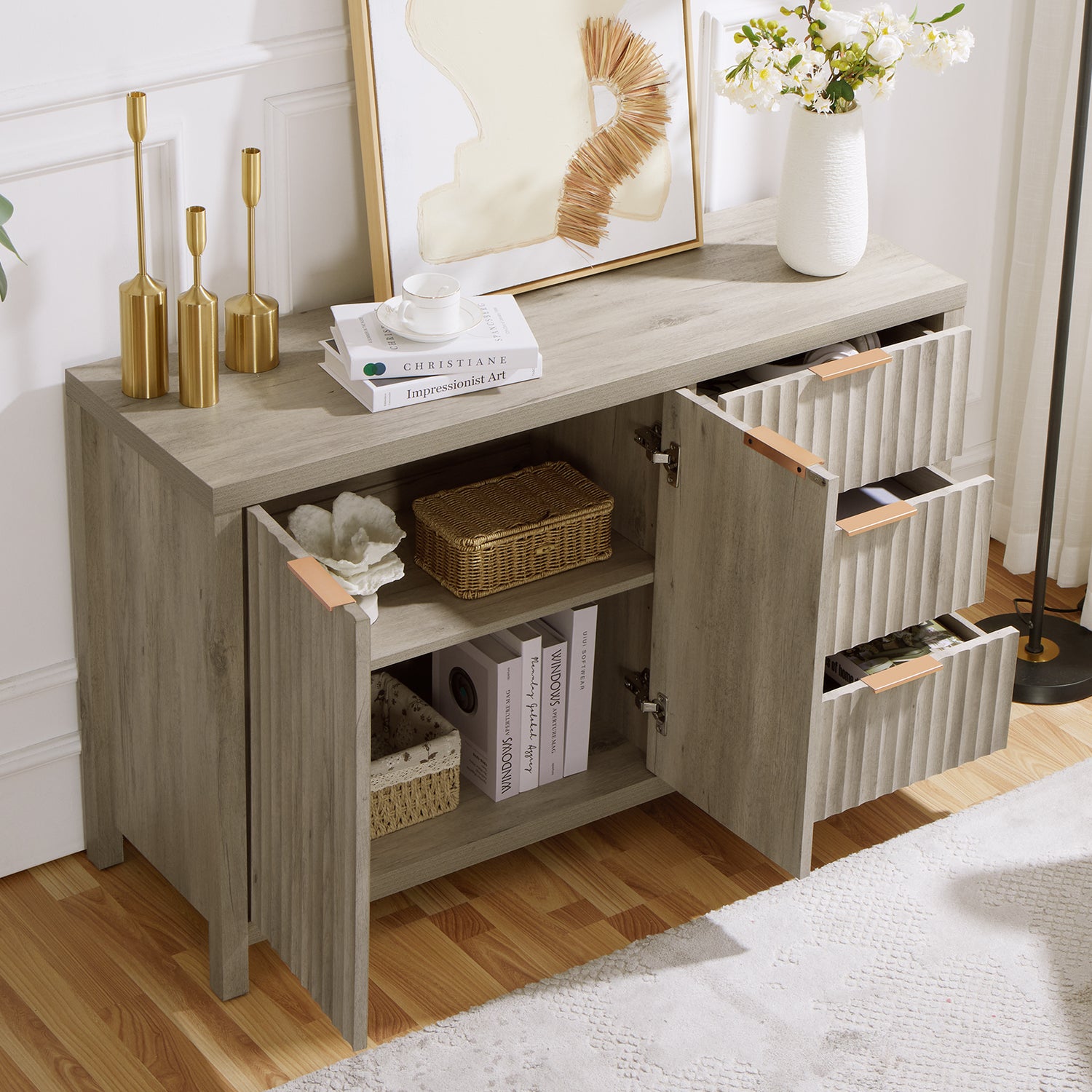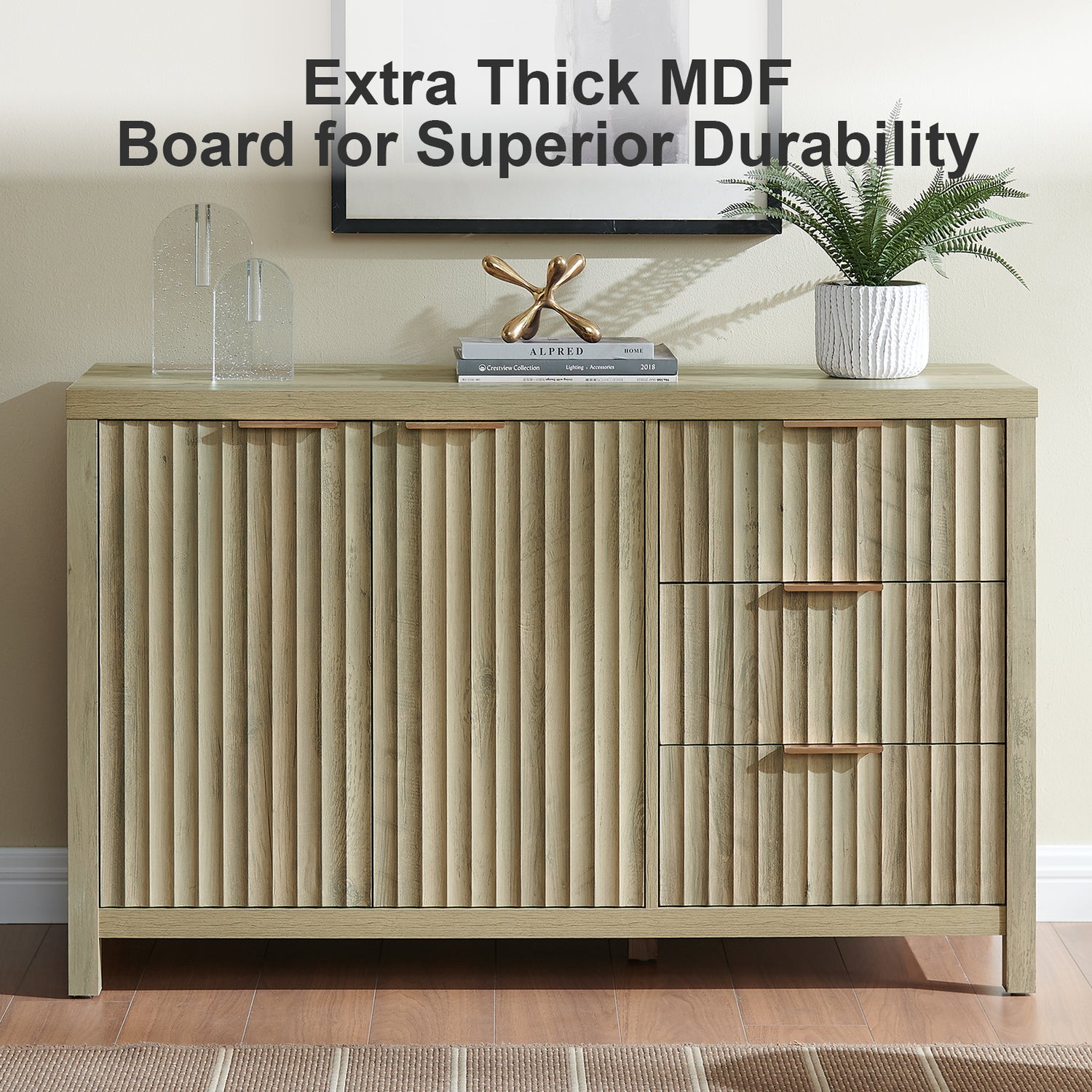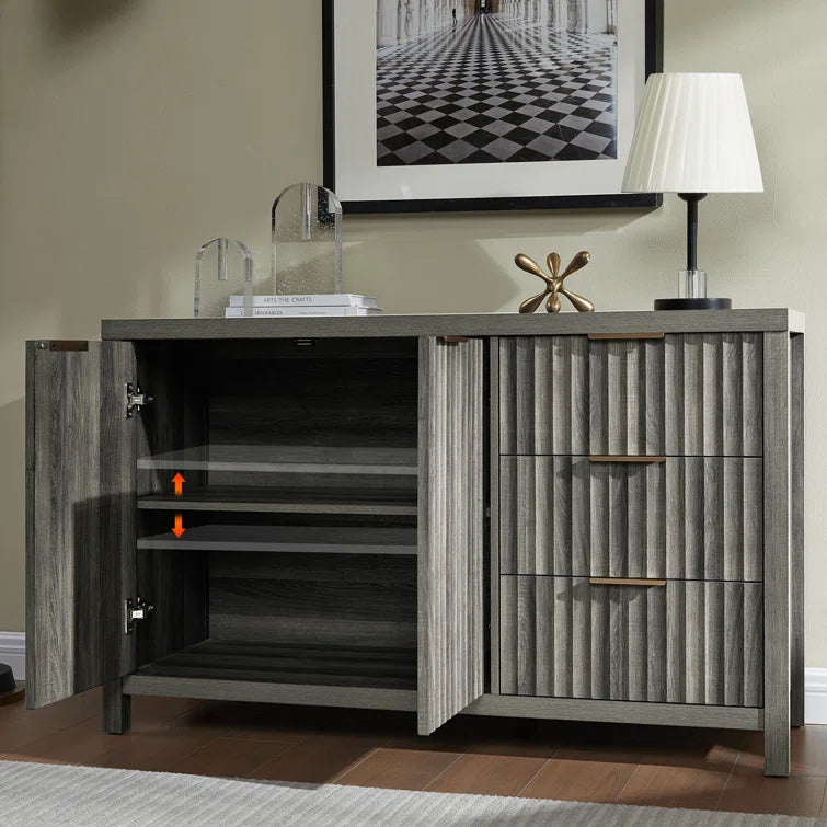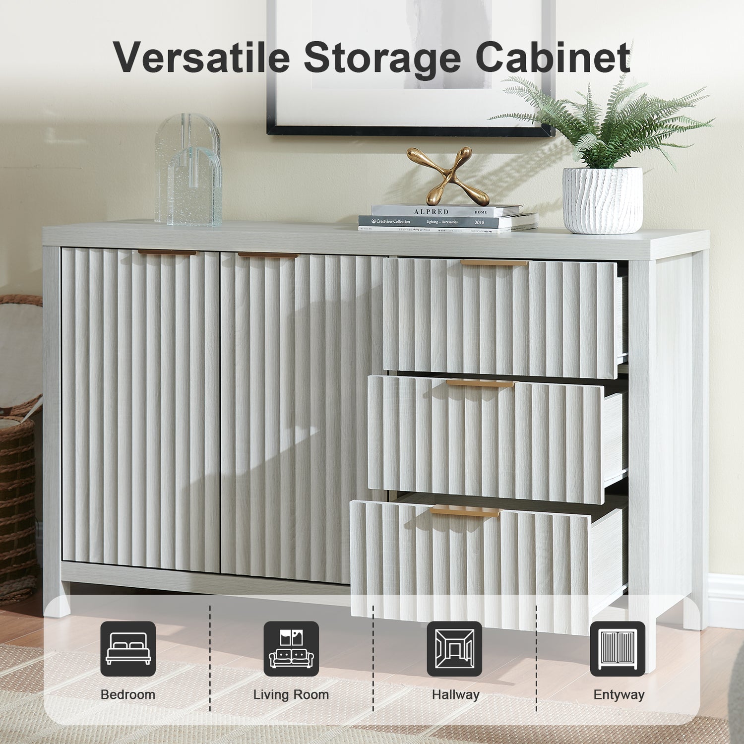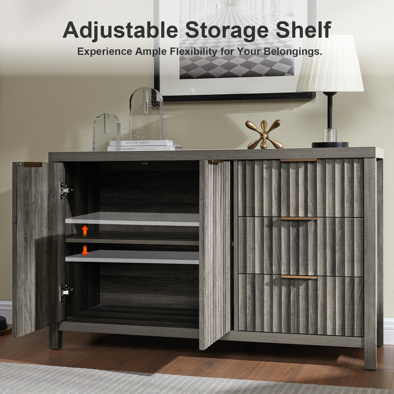 {"materialstitle":"Quality in Every Detail","image":"https://cdn.shopify.com/s/files/1/0780/4230/0713/files/1_0aa645cb-7537-4df8-bb36-3009a785778f.jpg?v=1722254869","paragraph":["This accent cabinet features hand-carved wavy patterns on each panel, enhancing the modern appeal and visual depth of your space, infusing every corner with a stylish and elegant ambiance.!","【3-Level Adjustable Shelves】This intricately designed buffet cabinet includes two doors and three drawers, with three adjustable shelves for flexible storage customization according to personal needs.","【Durable and Sturdy】 This modern sideboard is made from exterior grade MDF, enhancing both structural stability and durability. The 1.4-inch thick top ensures excellent load-bearing capacity, making it perfect for displaying decorative items.","【Product Dimensions】Total Dimensions: 46.69 L x 15.43 W x 29.21 H | Individual Storage: 25.98 L x 13.78 W x 23.62 H | Each Drawer: 16.54L x 13.78W x 5.71H inches | Maximum Top Panel Load: Maximum Top Panel Load: 100 lbs | Maximum Adjustable Shelves Load: 50 lbs | Maximum Drawers Load: 20 lbs | Cabinet leg height: 2.76 in.","【Easy to Assemble】This fluted credenza comes with clear, detailed instructions, numbered parts, and all necessary tools for assembly. Follow our video tutorial for easy setup, or reach out to our professional team for further assistance."]}