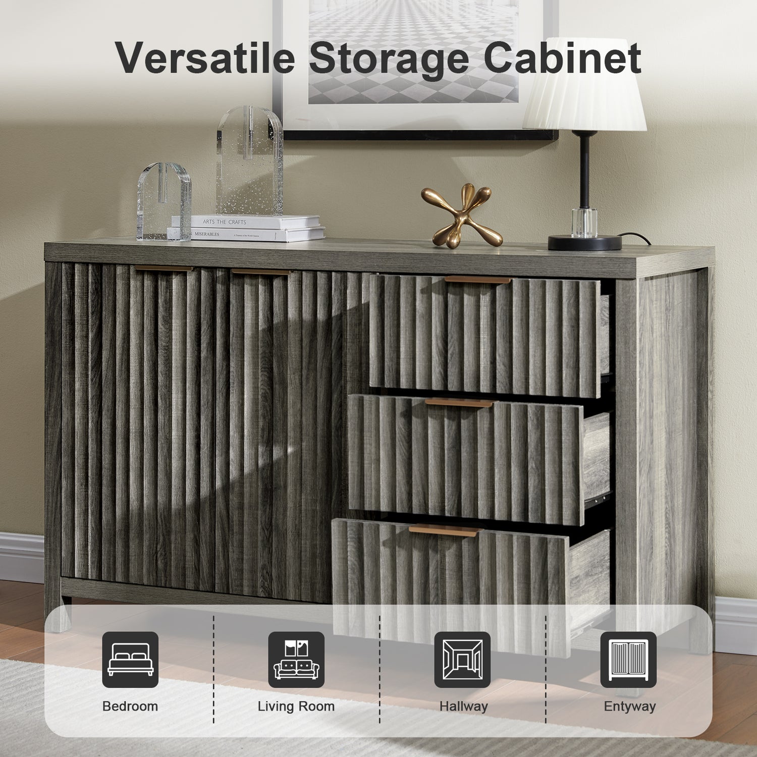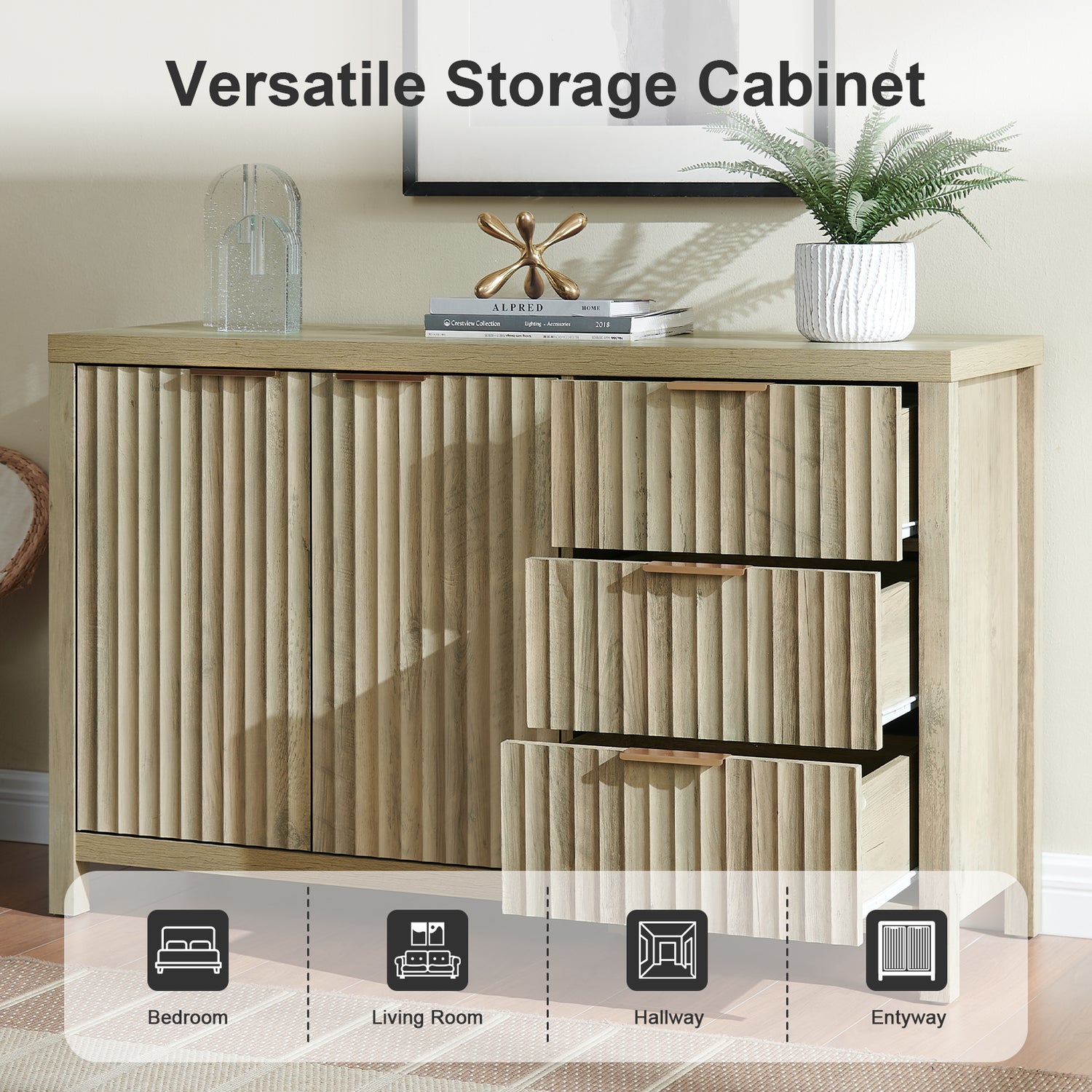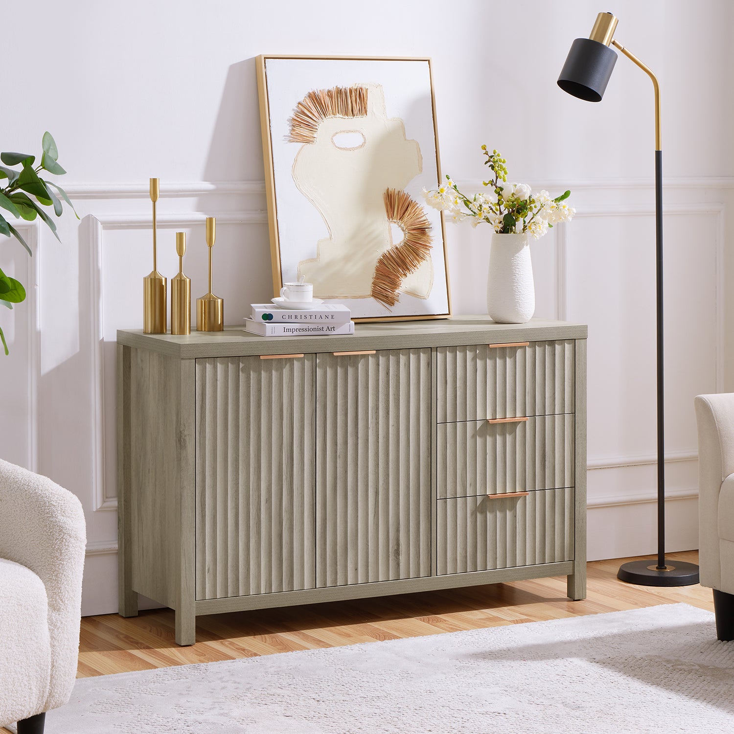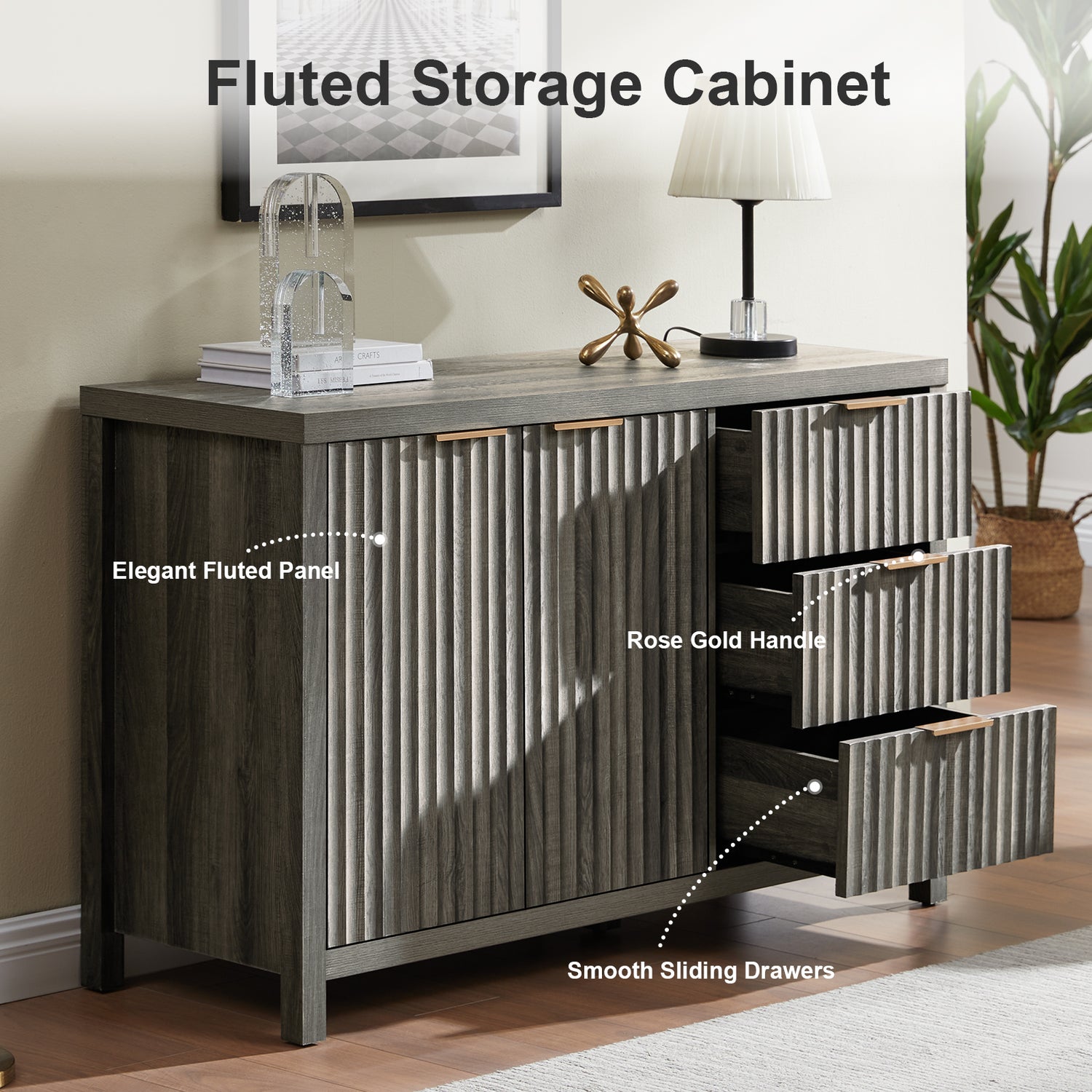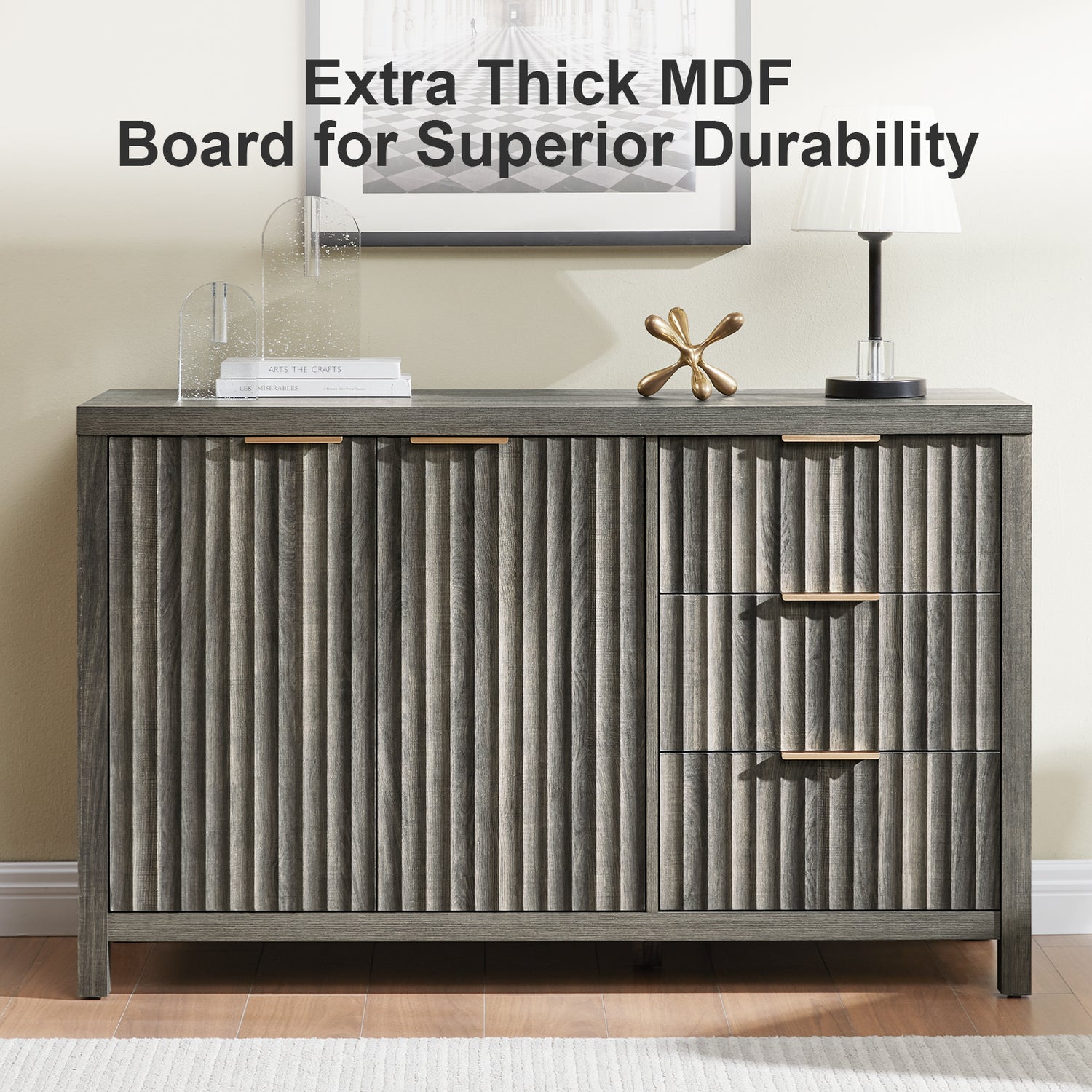 {"materialstitle":"Quality in Every Detail","image":"https://cdn.shopify.com/s/files/1/0780/4230/0713/files/1_0aa645cb-7537-4df8-bb36-3009a785778f.jpg?v=1722254869","paragraph":["This accent cabinet features hand-carved wavy patterns on each panel, enhancing the modern appeal and visual depth of your space, infusing every corner with a stylish and elegant ambiance.!","【3-Level Adjustable Shelves】This intricately designed buffet cabinet includes two doors and three drawers, with three adjustable shelves for flexible storage customization according to personal needs.","【Durable and Sturdy】 This modern sideboard is made from exterior grade MDF, enhancing both structural stability and durability. The 1.4-inch thick top ensures excellent load-bearing capacity, making it perfect for displaying decorative items.","【Product Dimensions】Total Dimensions: 46.69 L x 15.43 W x 29.21 H | Individual Storage: 25.98 L x 13.78 W x 23.62 H | Each Drawer: 16.54L x 13.78W x 5.71H inches | Maximum Top Panel Load: Maximum Top Panel Load: 100 lbs | Maximum Adjustable Shelves Load: 50 lbs | Maximum Drawers Load: 20 lbs | Cabinet leg height: 2.76 in.","【Easy to Assemble】This fluted credenza comes with clear, detailed instructions, numbered parts, and all necessary tools for assembly. Follow our video tutorial for easy setup, or reach out to our professional team for further assistance."]}