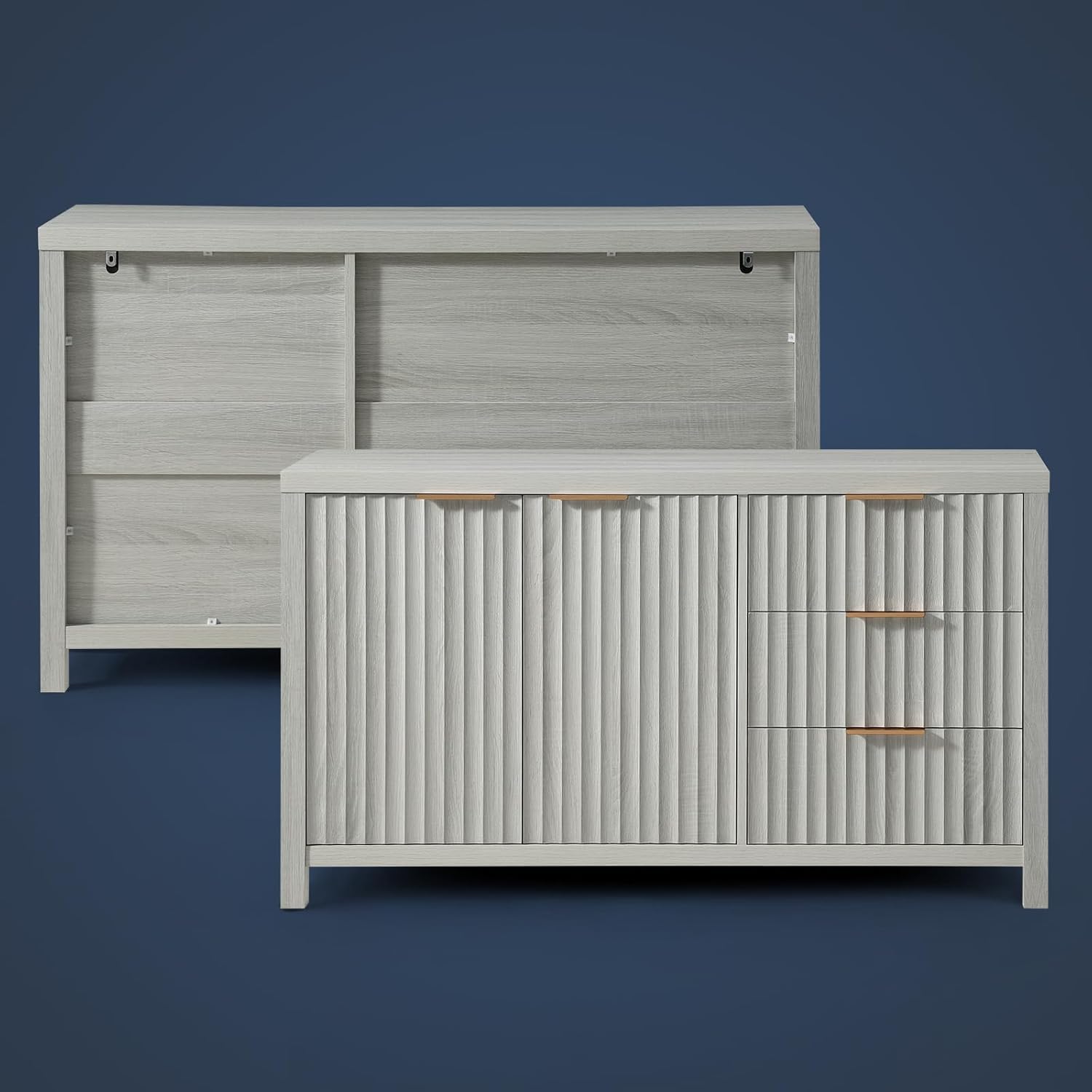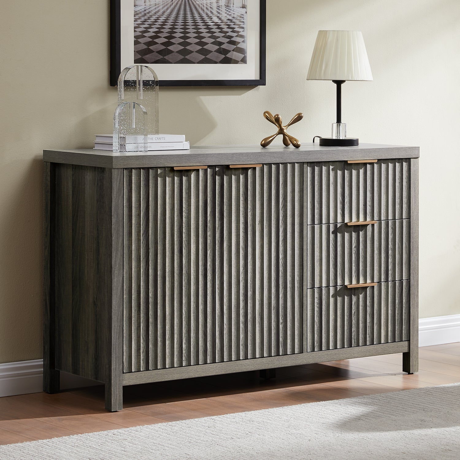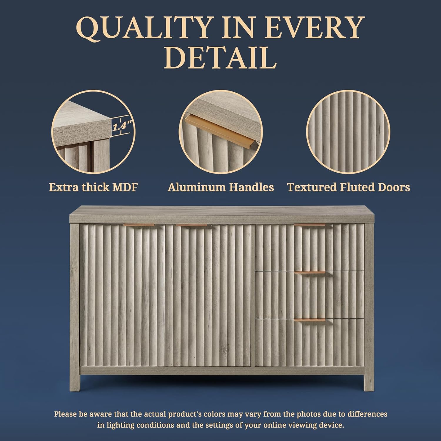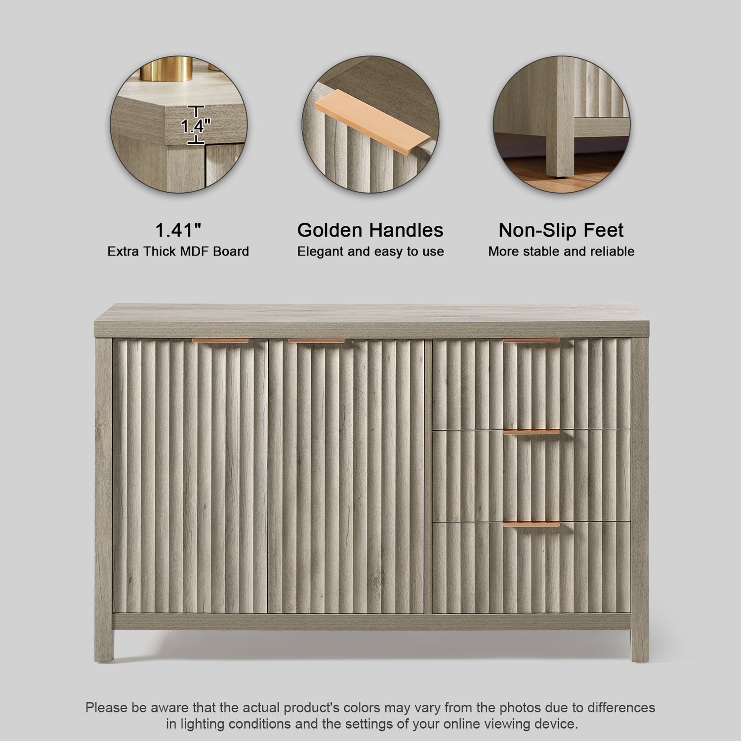 {"materialstitle":"Quality in Every Detail","image":"https://cdn.shopify.com/s/files/1/0780/4230/0713/files/1_0aa645cb-7537-4df8-bb36-3009a785778f.jpg?v=1722254869","paragraph":["This accent cabinet features hand-carved wavy patterns on each panel, enhancing the modern appeal and visual depth of your space, infusing every corner with a stylish and elegant ambiance.!","【3-Level Adjustable Shelves】This intricately designed buffet cabinet includes two doors and three drawers, with three adjustable shelves for flexible storage customization according to personal needs.","【Durable and Sturdy】 This modern sideboard is made from exterior grade MDF, enhancing both structural stability and durability. The 1.4-inch thick top ensures excellent load-bearing capacity, making it perfect for displaying decorative items.","【Product Dimensions】Total Dimensions: 46.69 L x 15.43 W x 29.21 H | Individual Storage: 25.98 L x 13.78 W x 23.62 H | Each Drawer: 16.54L x 13.78W x 5.71H inches | Maximum Top Panel Load: Maximum Top Panel Load: 100 lbs | Maximum Adjustable Shelves Load: 50 lbs | Maximum Drawers Load: 20 lbs | Cabinet leg height: 2.76 in.","【Easy to Assemble】This fluted credenza comes with clear, detailed instructions, numbered parts, and all necessary tools for assembly. Follow our video tutorial for easy setup, or reach out to our professional team for further assistance."]}