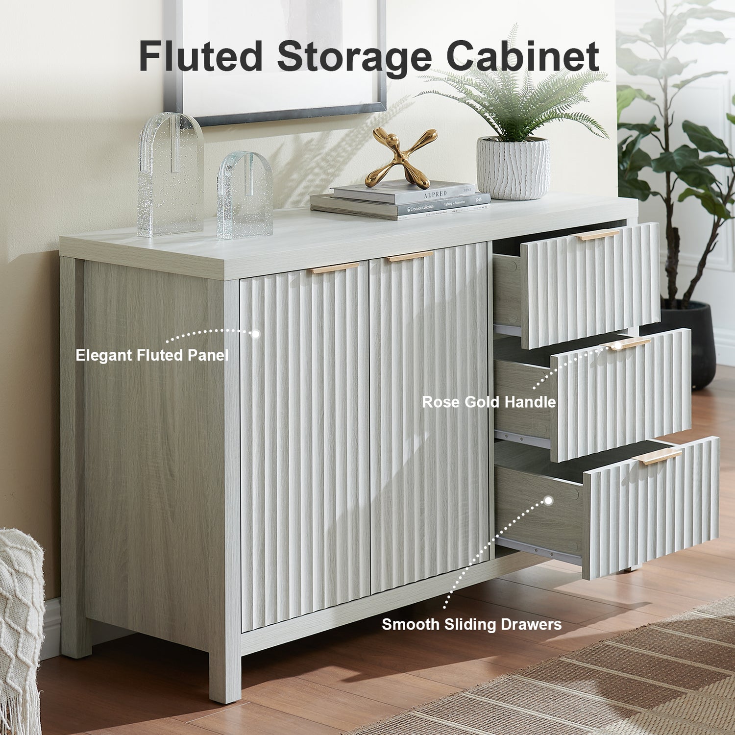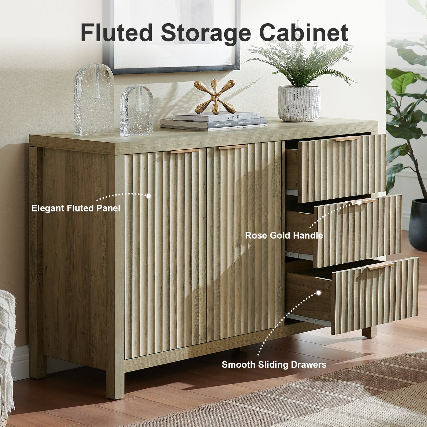 Wooden Fluted Storage Cabinet with Double Doors and 3 Drawers