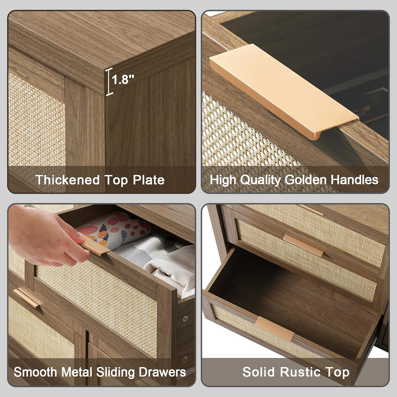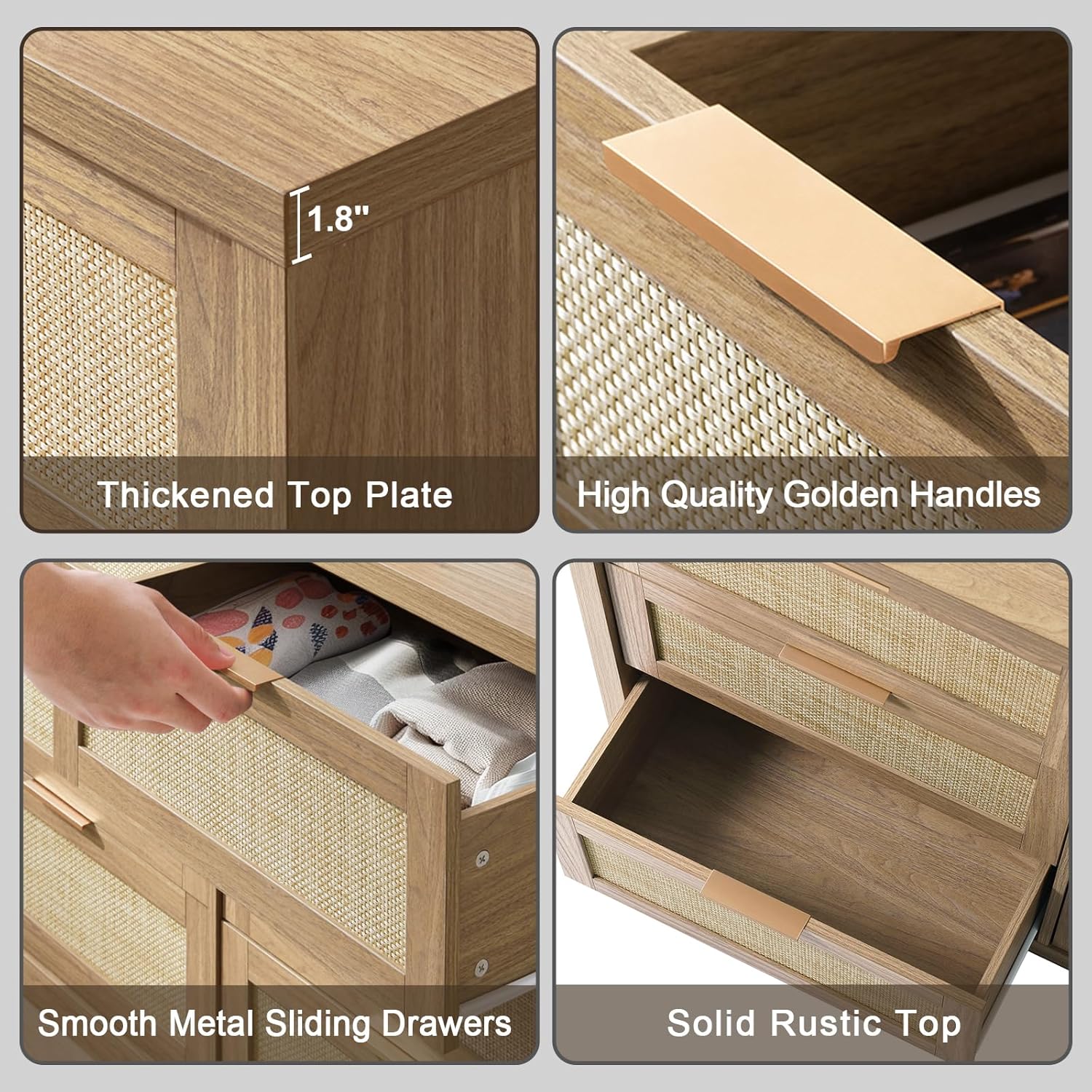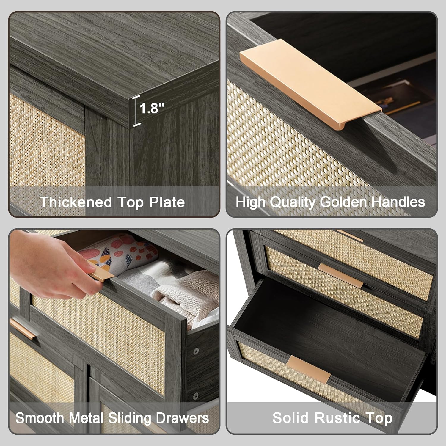 This chest of drawers is made from thickened MDF and scratch-resistant top planks. Complete with stylish gold-colored handles, it is sturdy and long-lasting, and can withstand daily use without wear or warping.