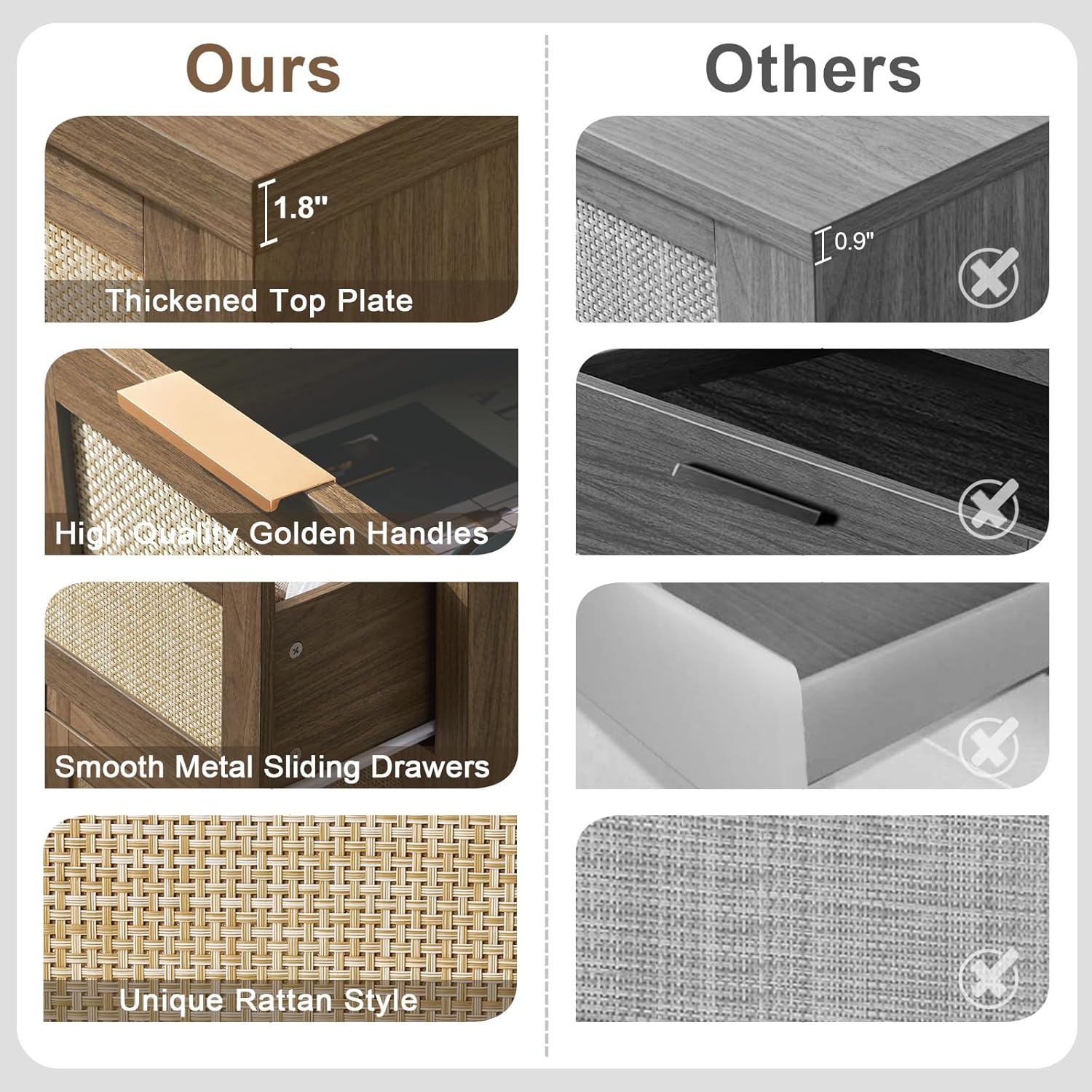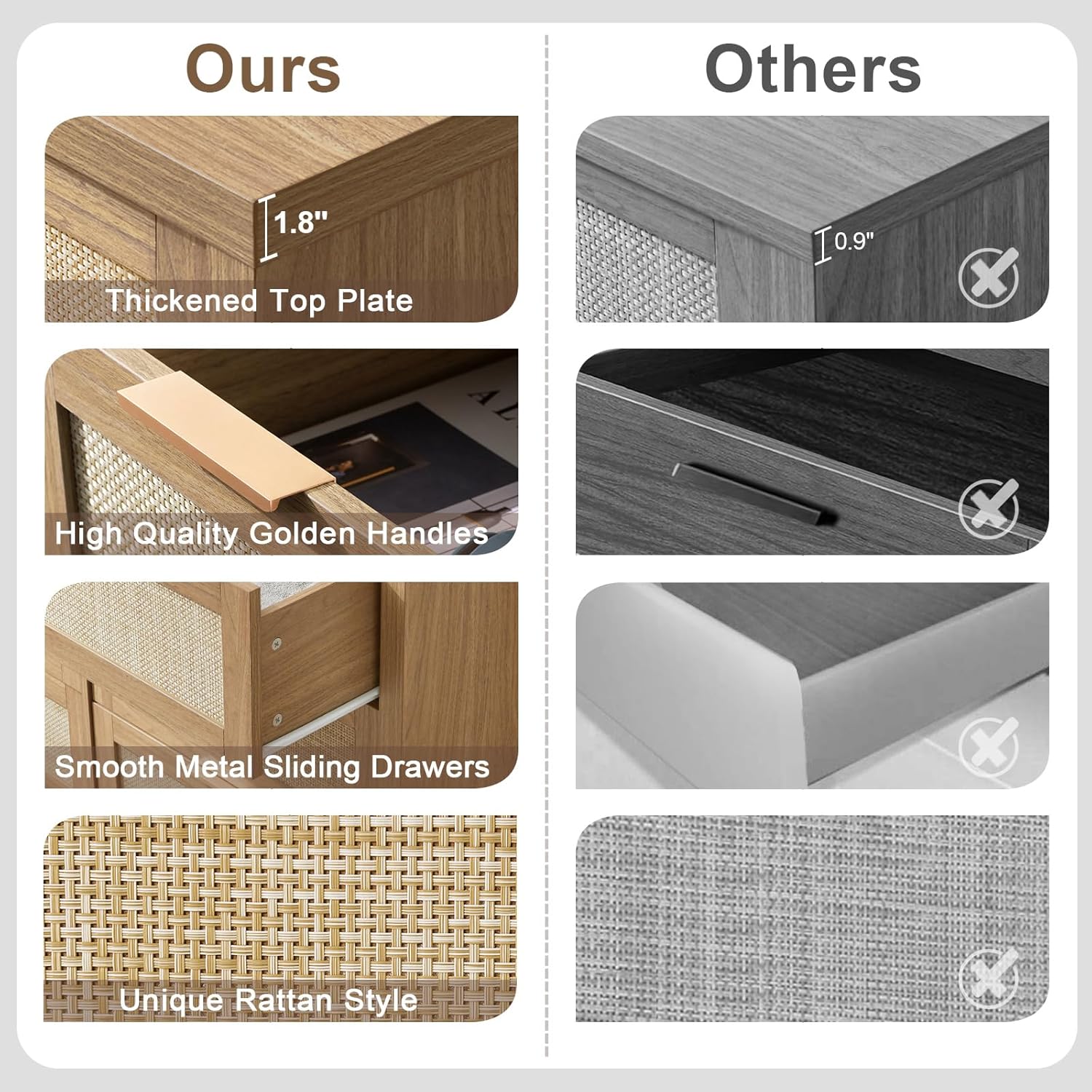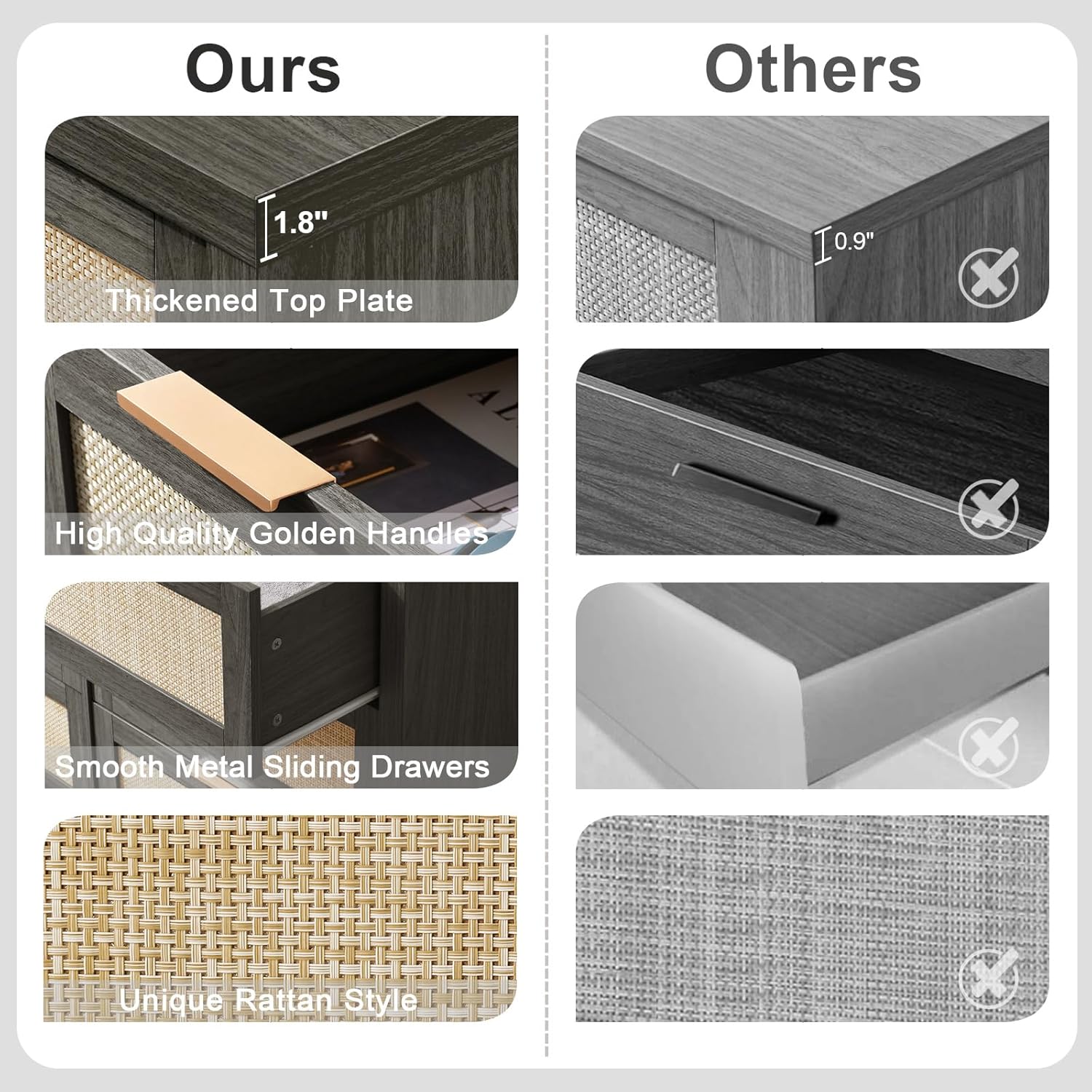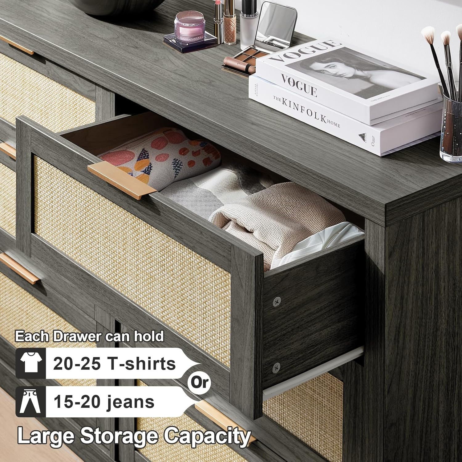 This chest of drawers is made from thickened MDF and scratch-resistant top planks. Complete with stylish gold-colored handles, it is sturdy and long-lasting, and can withstand daily use without wear or warping.