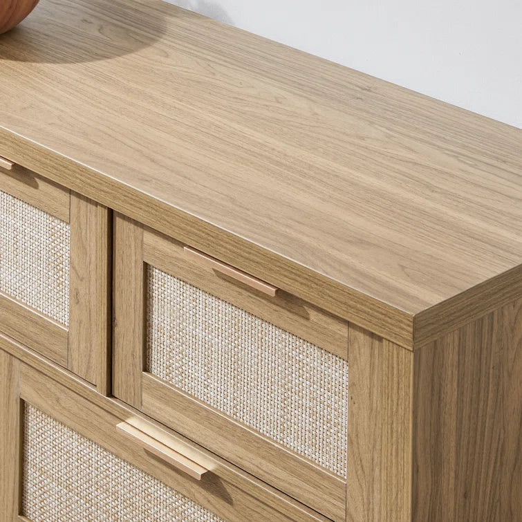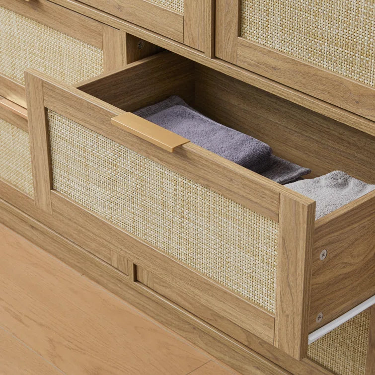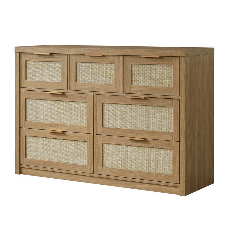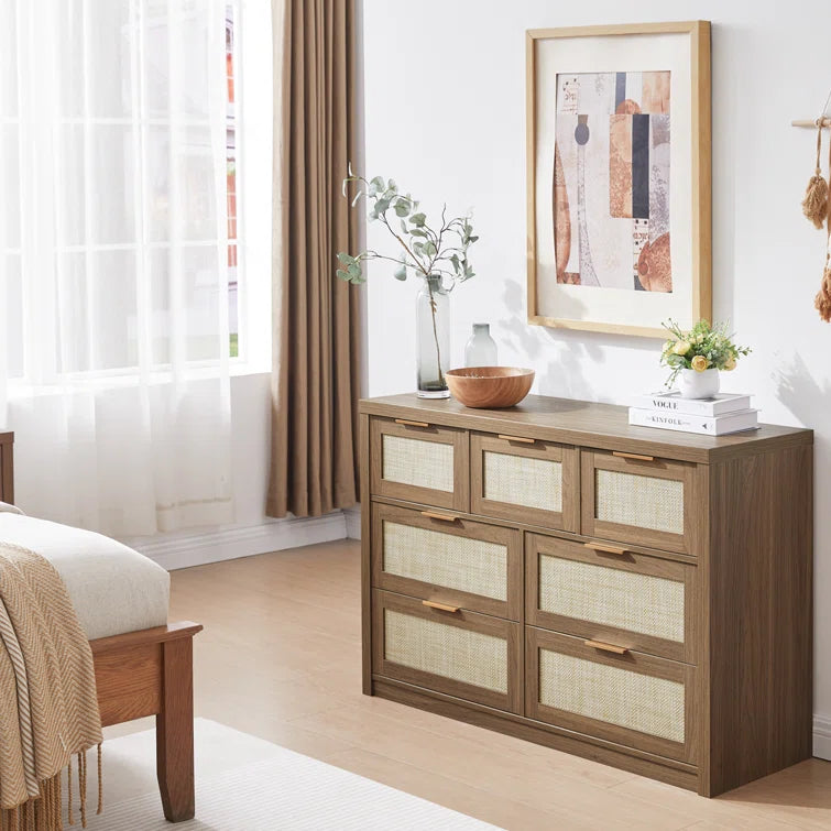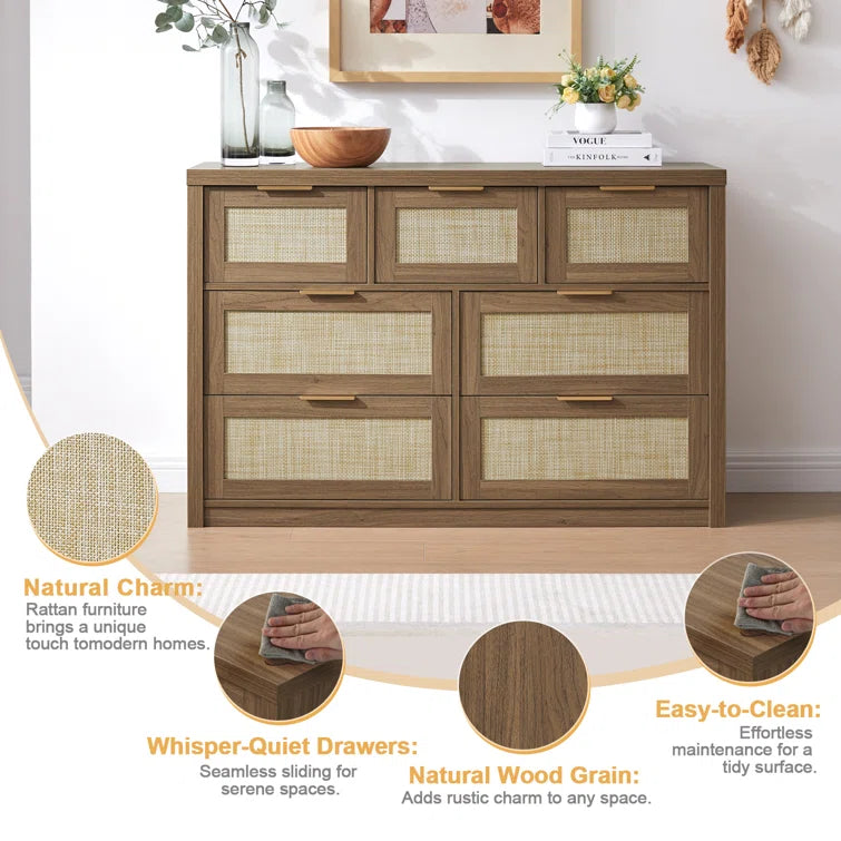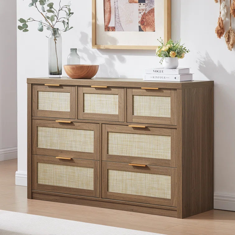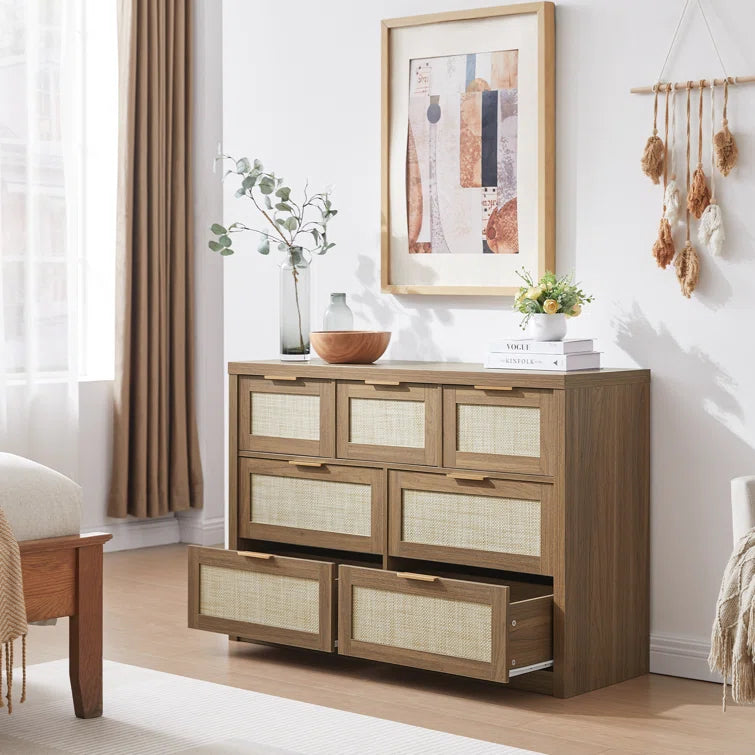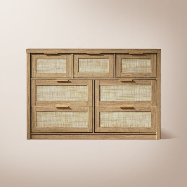 With 7 drawers, this rattan dresser blends natural charm with practicality. Featuring a carefully woven rattan top, it brings the soothing essence of nature into your home.