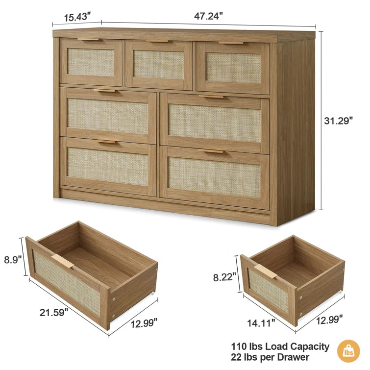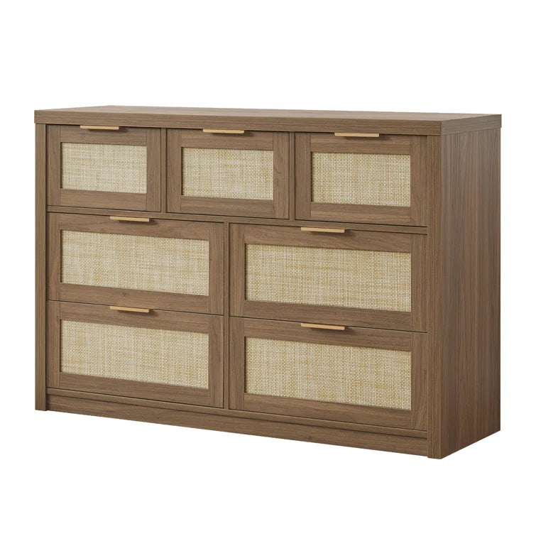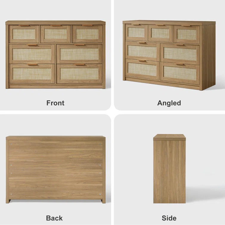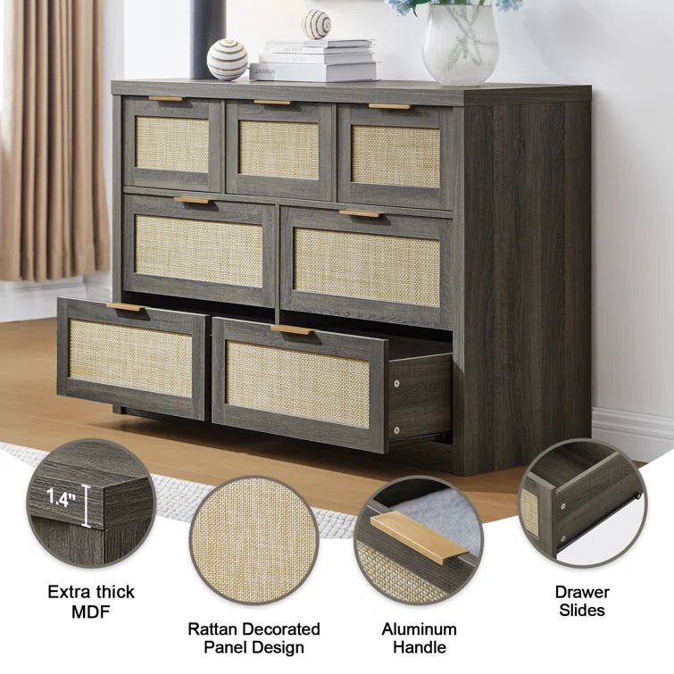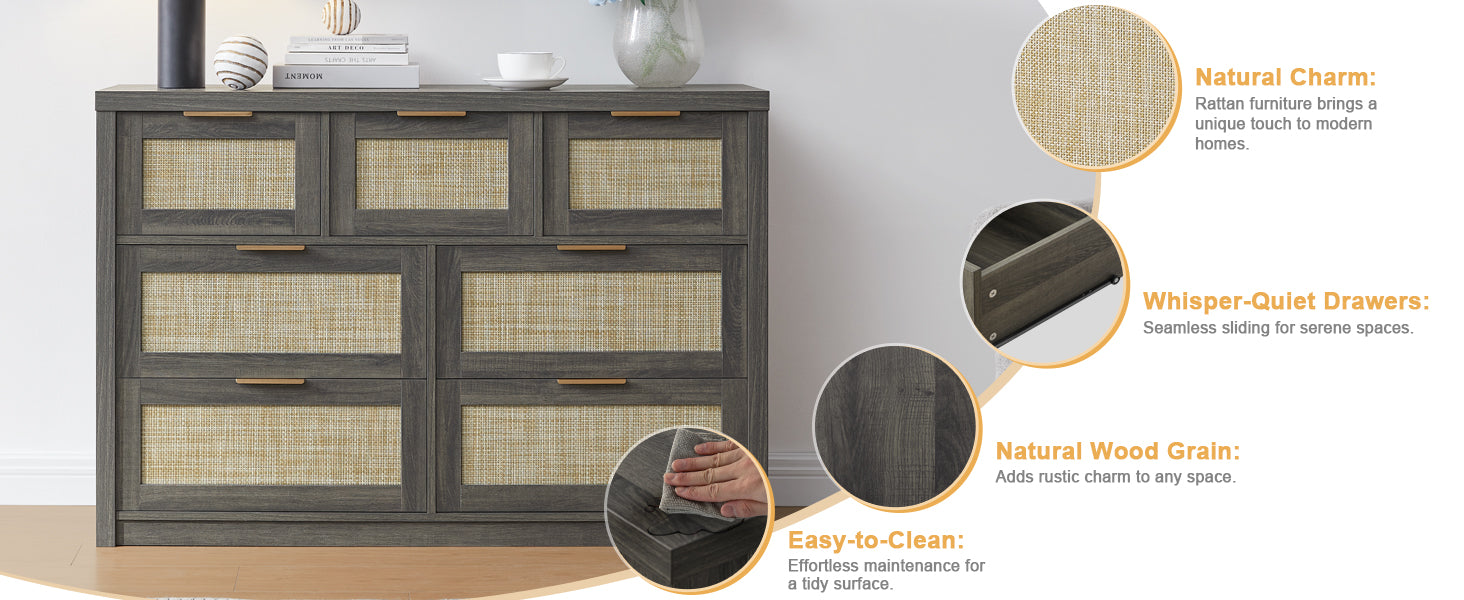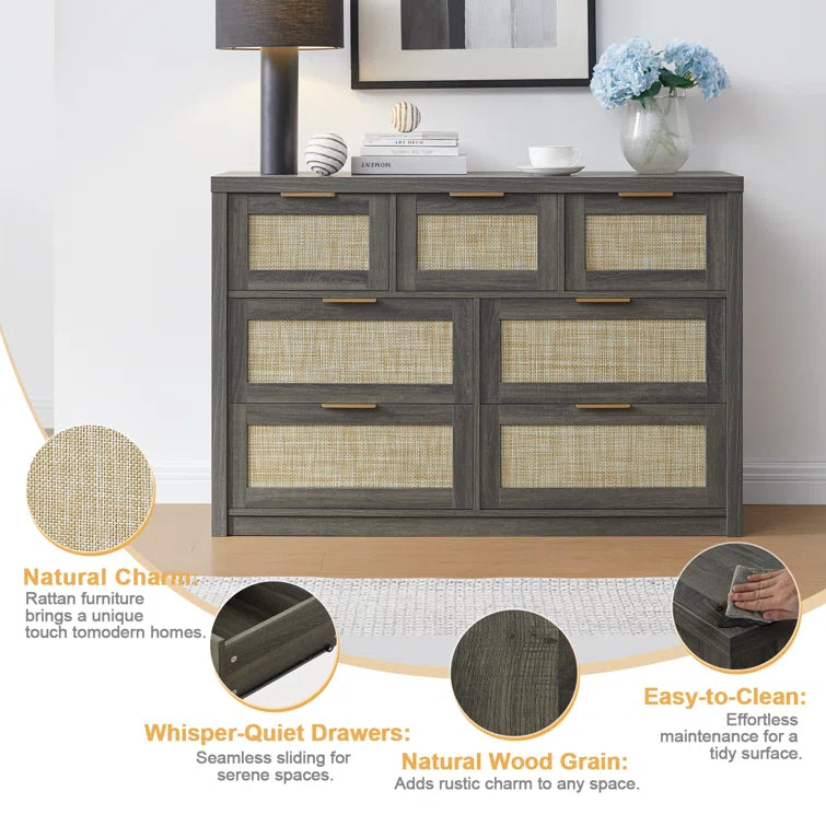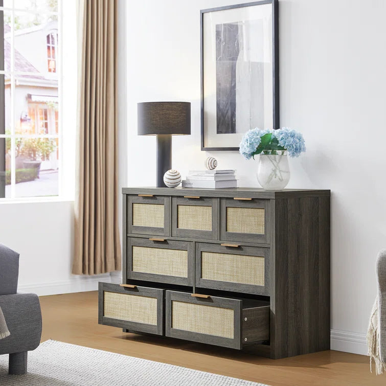 With 7 drawers, this rattan dresser blends natural charm with practicality. Featuring a carefully woven rattan top, it brings the soothing essence of nature into your home.