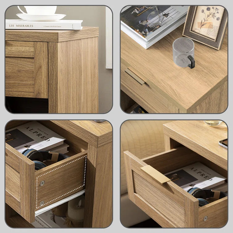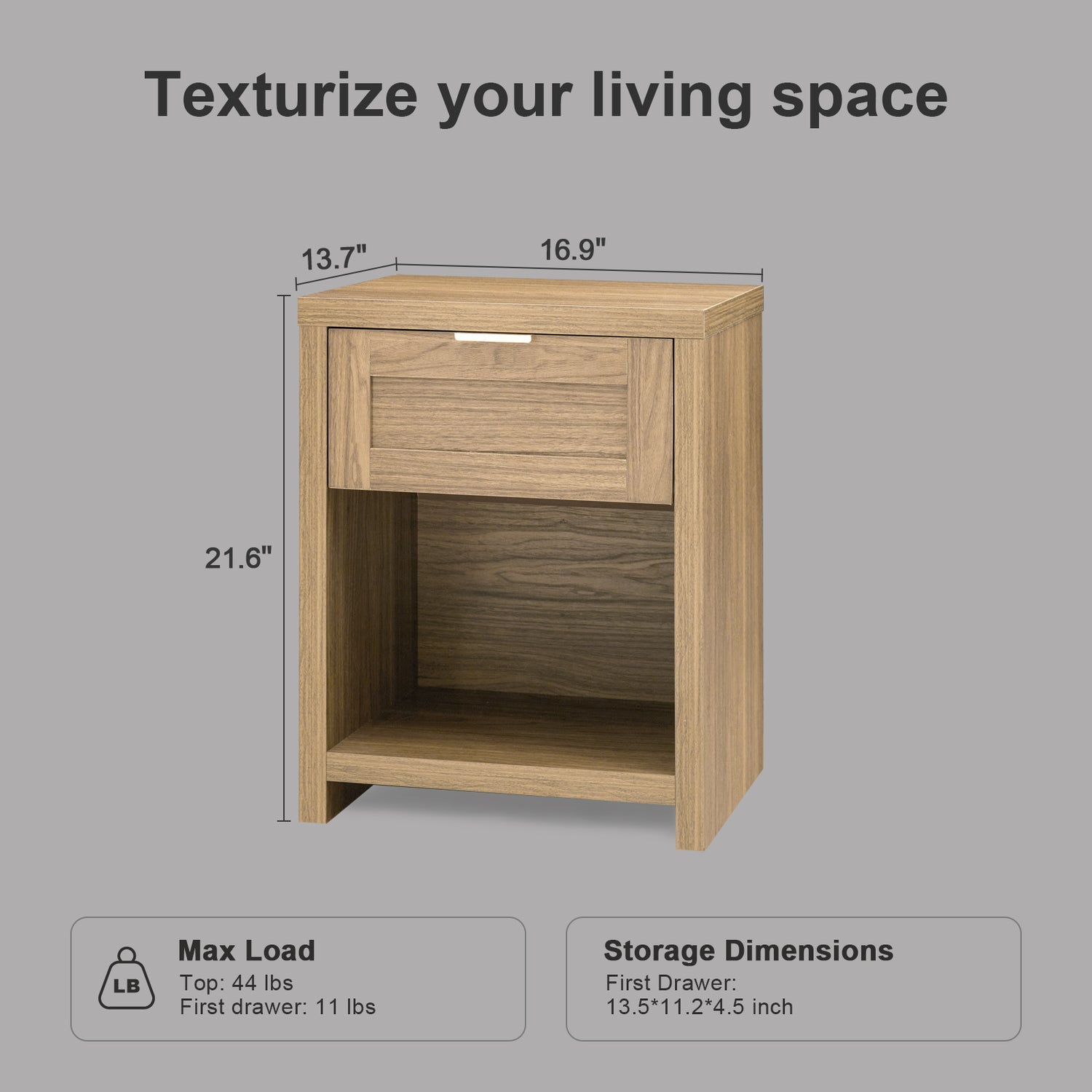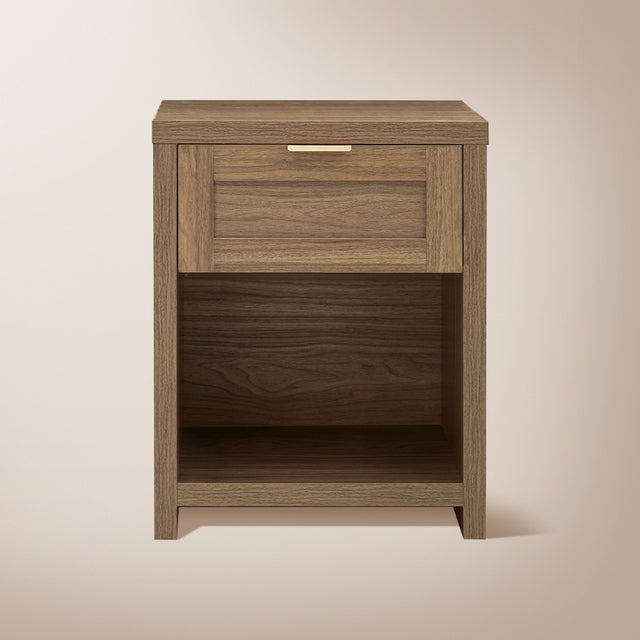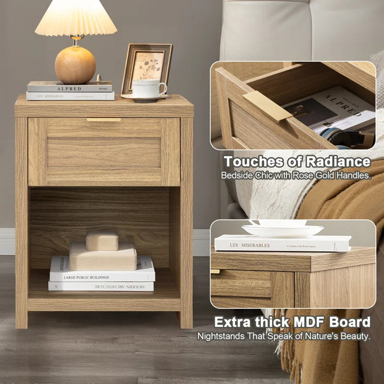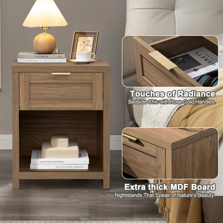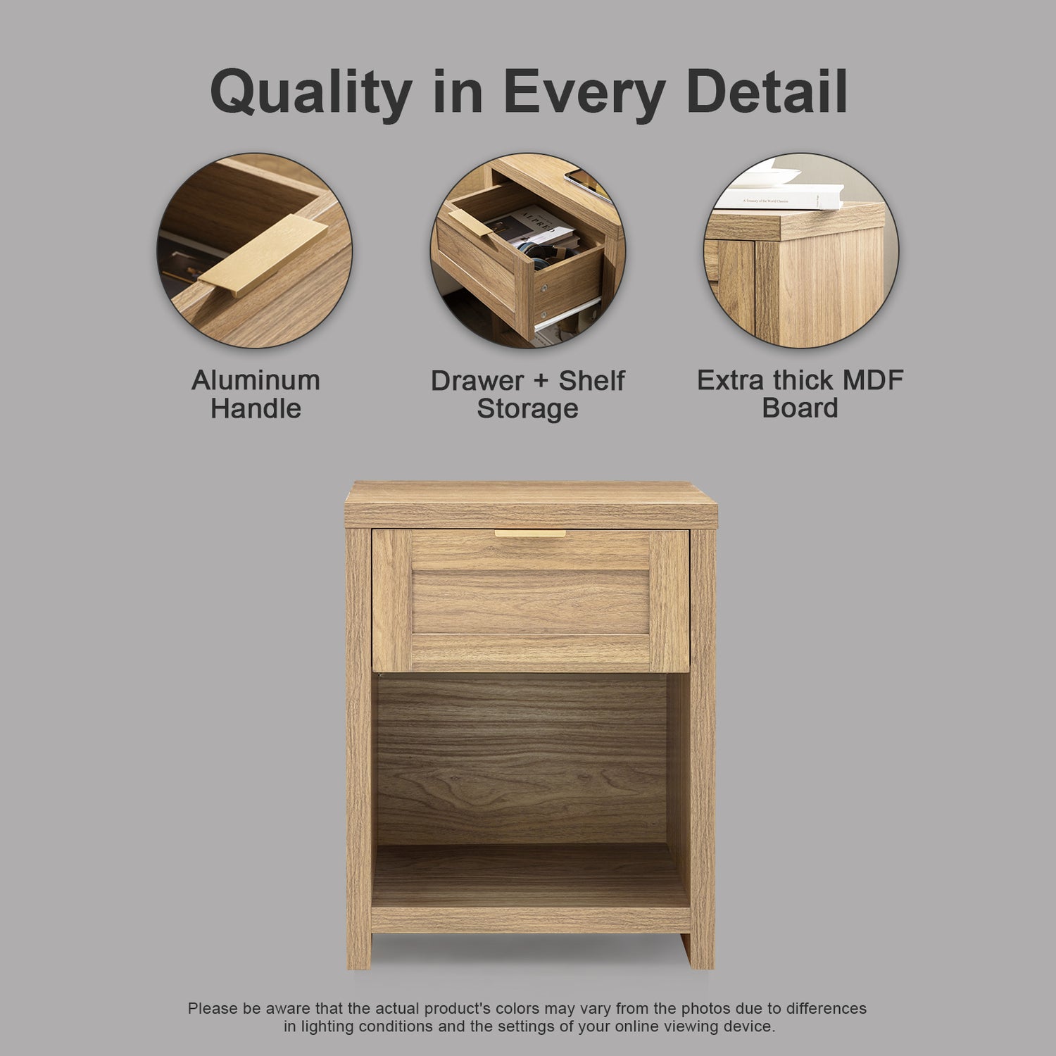 {"materialstitle":"Quality in Every Detail","image":"https://cdn.shopify.com/s/files/1/0780/4230/0713/files/1_ae9e2675-f866-4119-8311-60dddf6c563d.jpg?v=1722244220","paragraph":["The Sherwood series masterfully combines simplicity and functionality, offering furniture that effortlessly adapts to modern and boho-inspired interiors. Defined by its smooth finishes, natural wood tones, and clean lines, the series introduces a serene and sophisticated aesthetic to any space.","【Streamlined Storage Solution】The Wooden Single-Drawer Nightstand is designed to enhance organization in compact spaces. The spacious drawer with smooth-glide tracks keeps essentials out of sight, while the open shelf below offers quick access to books, decor, or daily-use items. Its seamless design creates a tidy and clutter-free environment.","【Compact and Practical Design】The Wooden Single-Drawer Nightstand measures 13.7 inches (W) x 16.9 inches (D) x 21.6 inches (H), making it perfect for compact spaces. Its design includes a spacious single drawer and an open shelf, providing versatile storage solutions for bedside essentials, books, or decor. The flat top offers an ideal spot for lamps or accent pieces.","【Multi-Room Versatility】This nightstand transitions effortlessly across rooms. Use it as a bedside table in the bedroom, an end table in the living room, or a compact storage option in home offices or hallways. Its natural wood tones complement a wide range of styles, from minimalist and Scandinavian to boho and contemporary.","【Sturdy and Reliable Construction】Crafted from high-quality MDF and finished with a smooth laminate, the nightstand is built for durability and everyday use. Protective foot pads ensure stability and prevent scratches, while the sturdy construction supports all your storage needs.","【Easy Assembly】The nightstand comes with detailed instructions, clearly labeled parts, and all necessary tools for a smooth assembly process. Experience the ease and practicality of Sherwood furniture in your home with minimal setup effort."]}