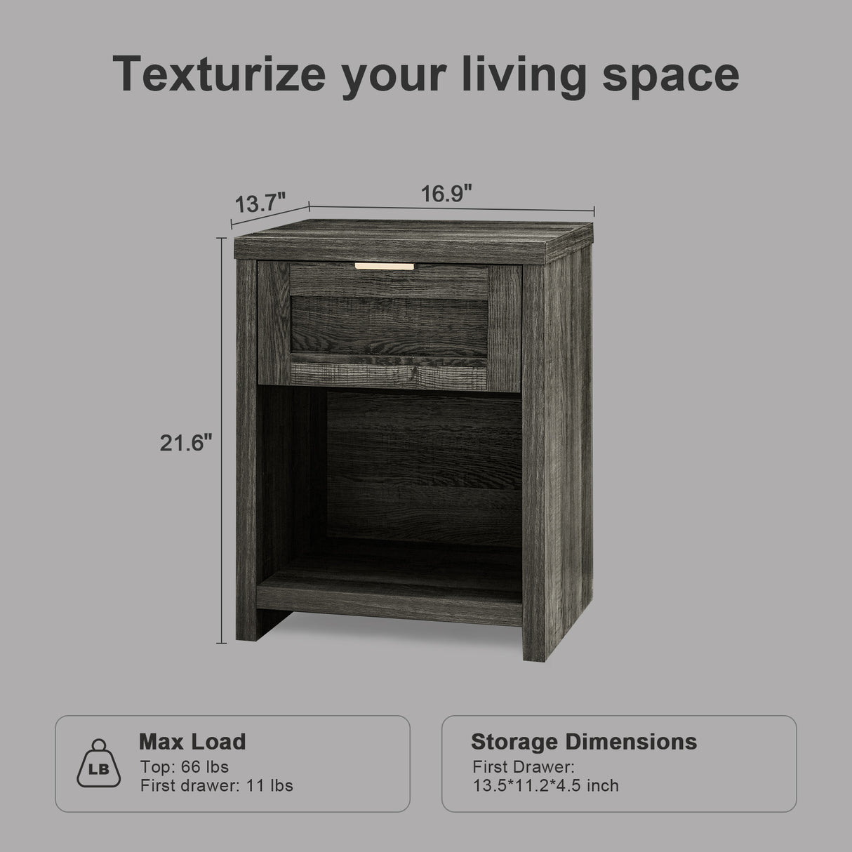【Easy to Install】Size: 16.9""(L) x 13.7""(D) x 21.6""(H). Our bedroom furniture comes with a detailed instruction video, ensuring a swift and hassle-free setup. The nightstand comes with step-by-step instructions, which are illustrated with parts. All screws and boards are labeled with letters, and screws are also thoughtfully packed in different small bags to prevent loss. These details are designed to help you assemble it more quickly.