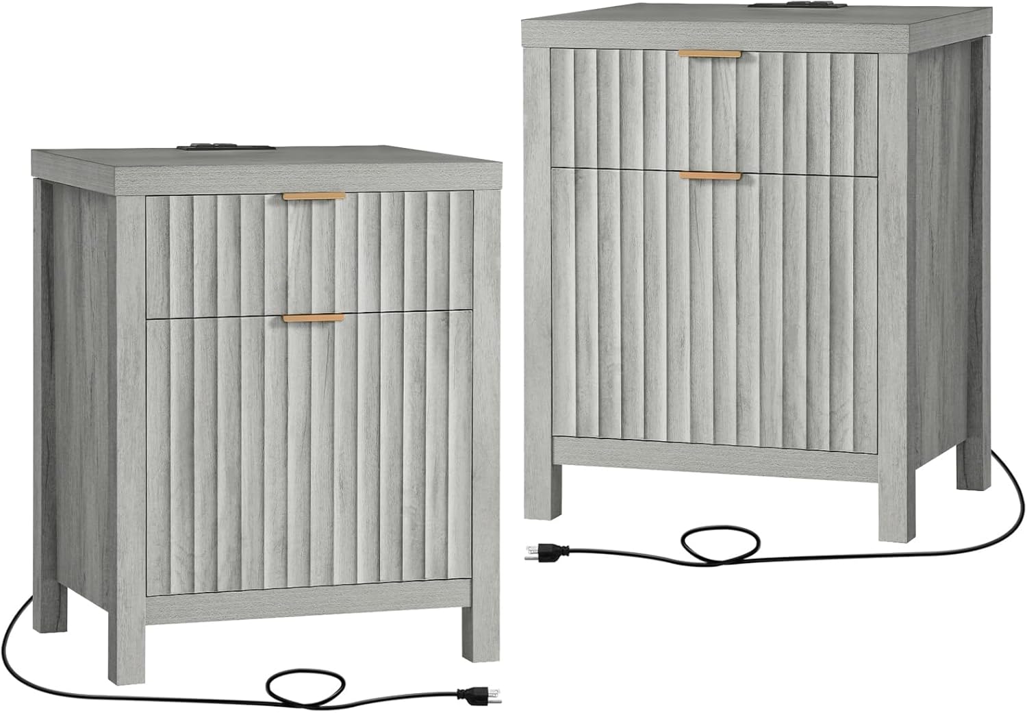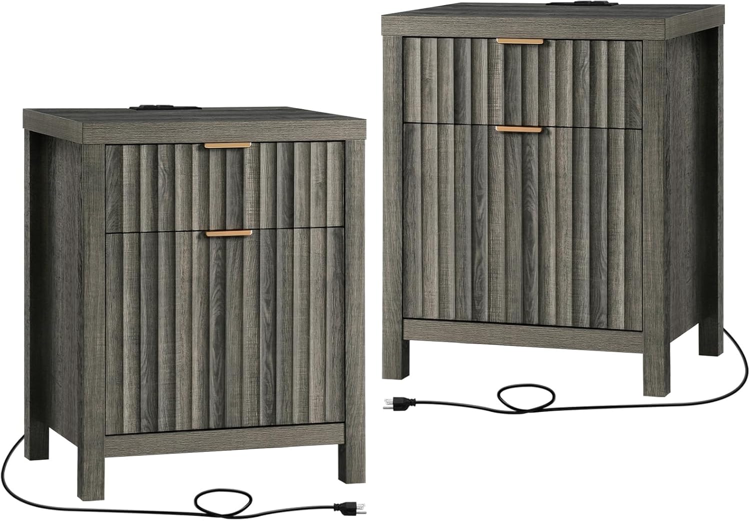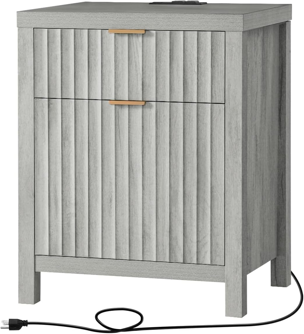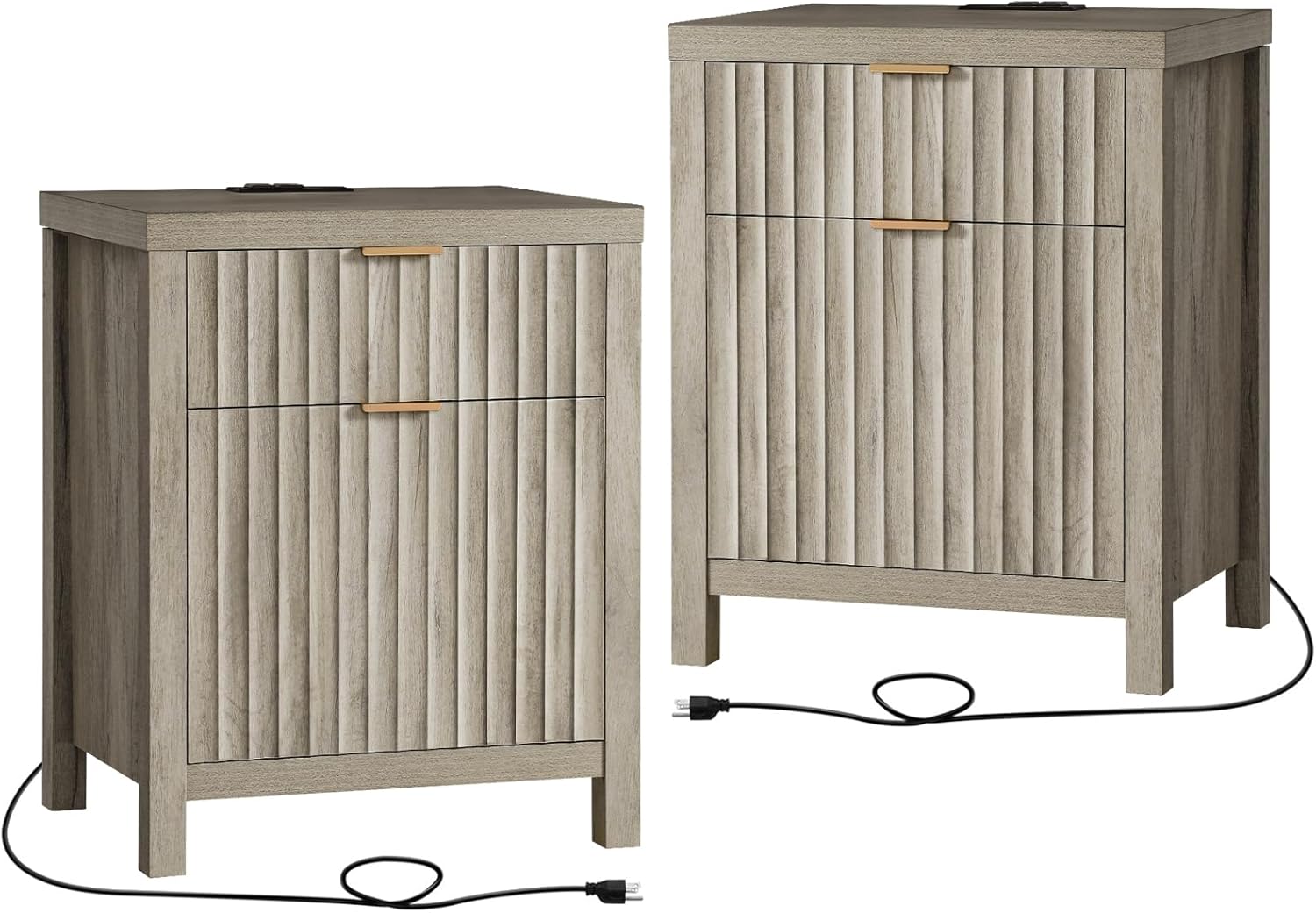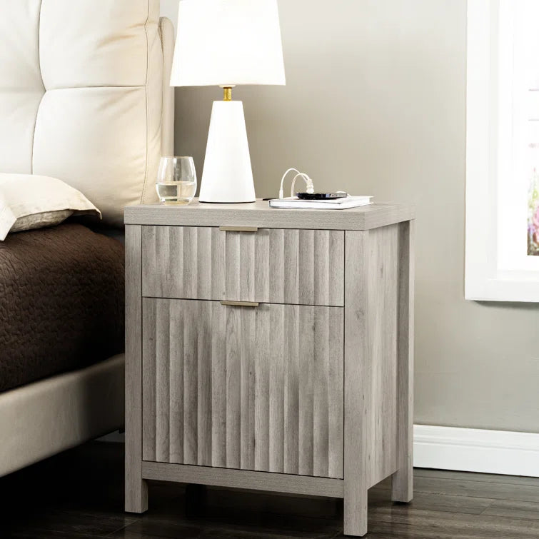 Wooden Fluted 2-Drawer Nightstand with Charging Station - Grey Oak / 1PC / Metal Wood is backordered and will ship as soon as it is back in stock.