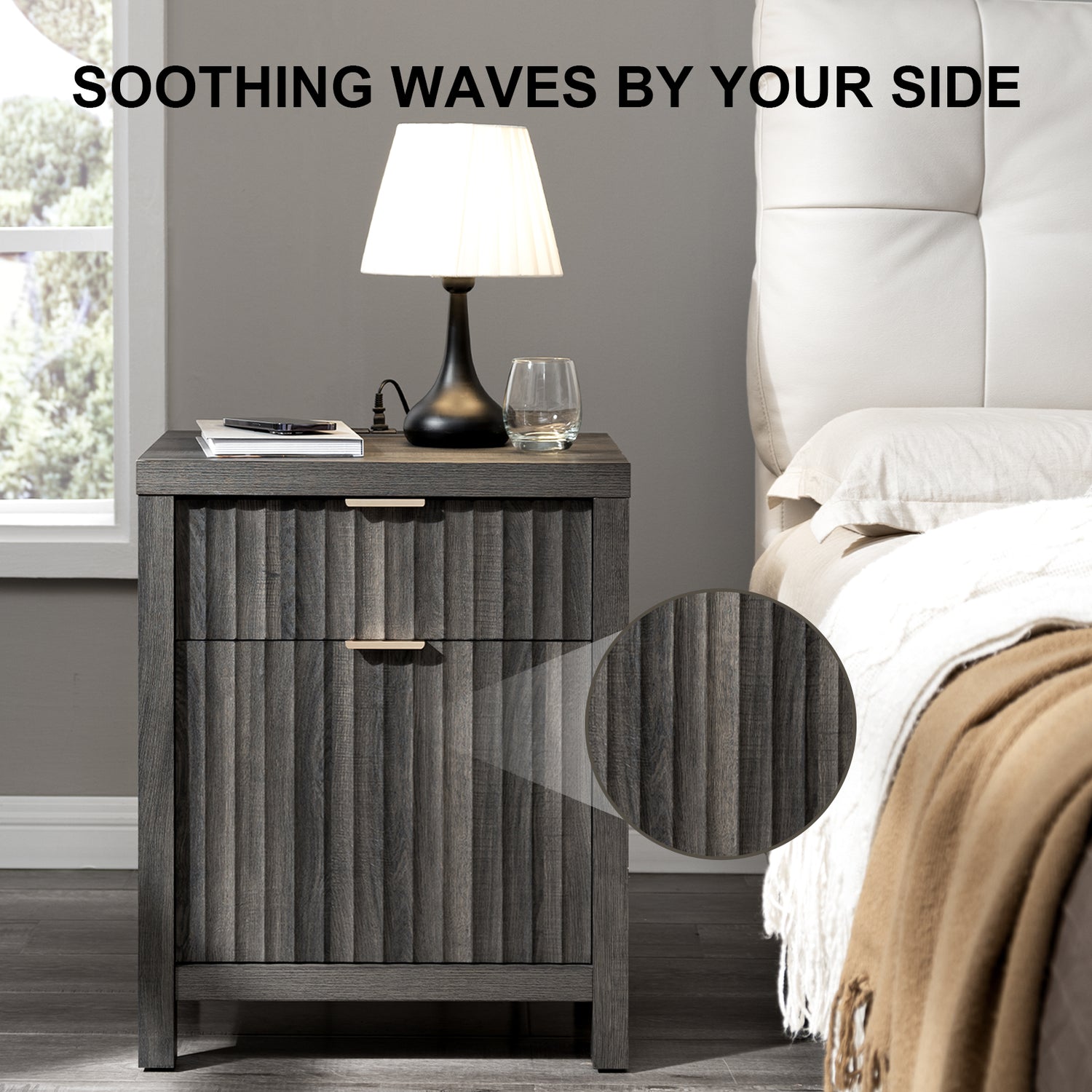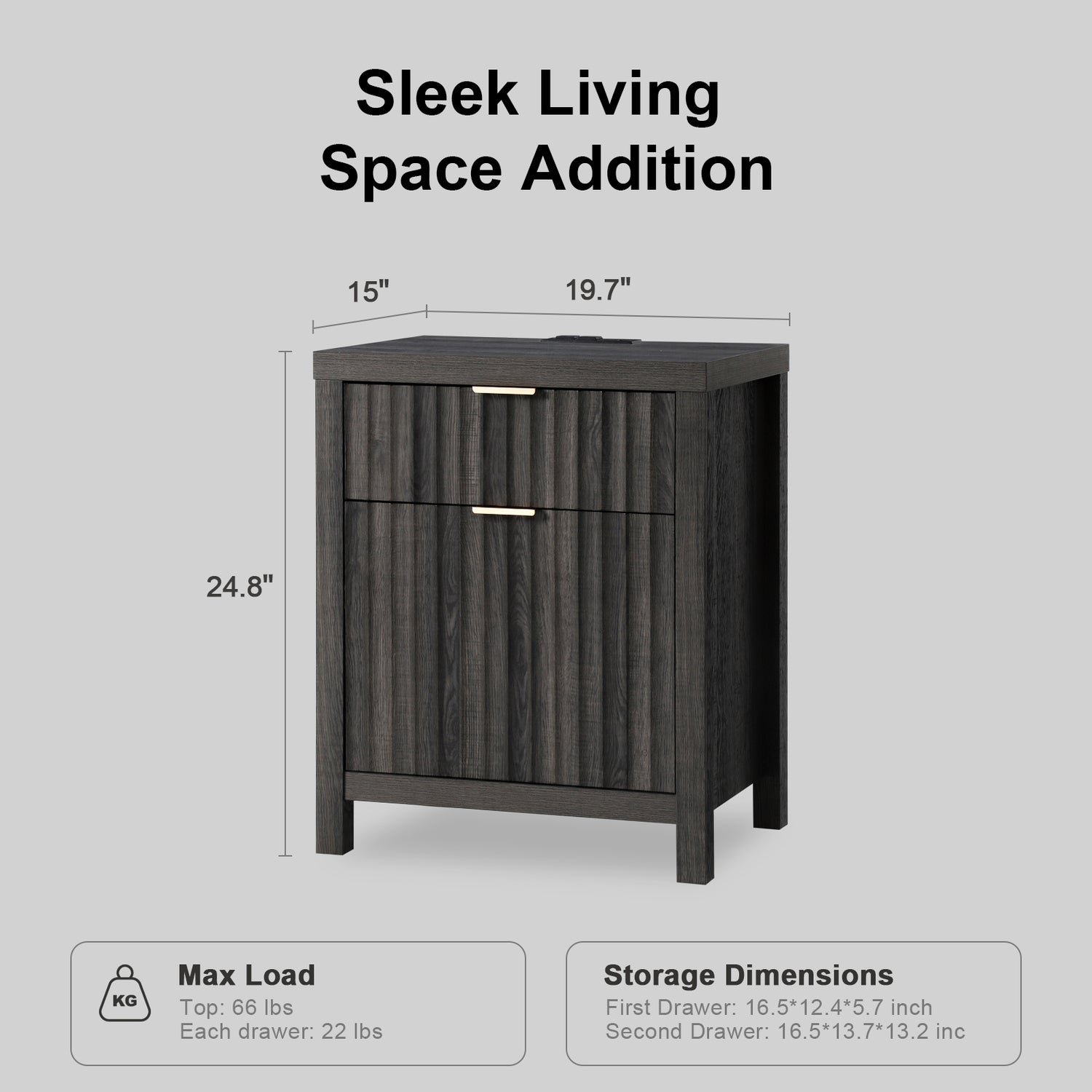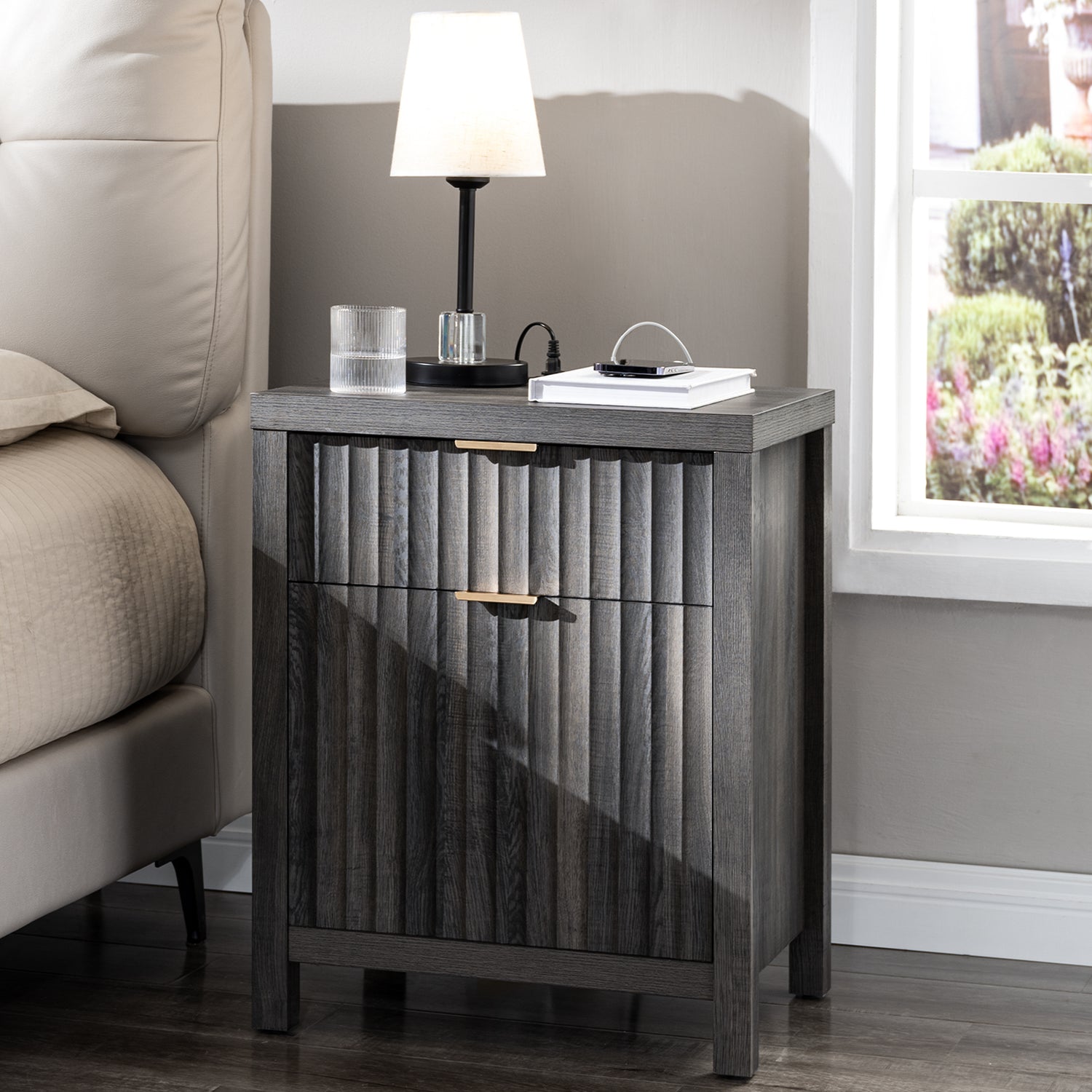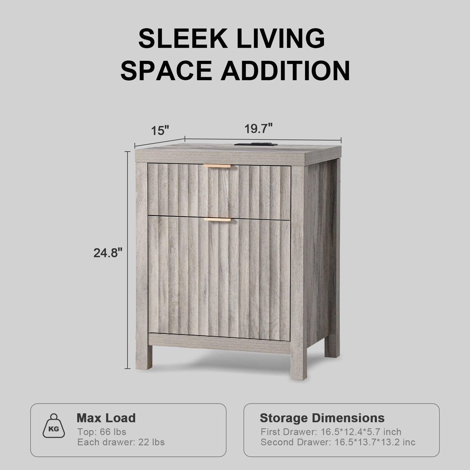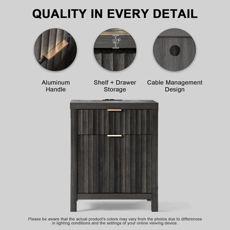 Wooden Fluted 2-Drawer Nightstand with Charging Station - Grey Oak / 1PC / Metal Wood is backordered and will ship as soon as it is back in stock.