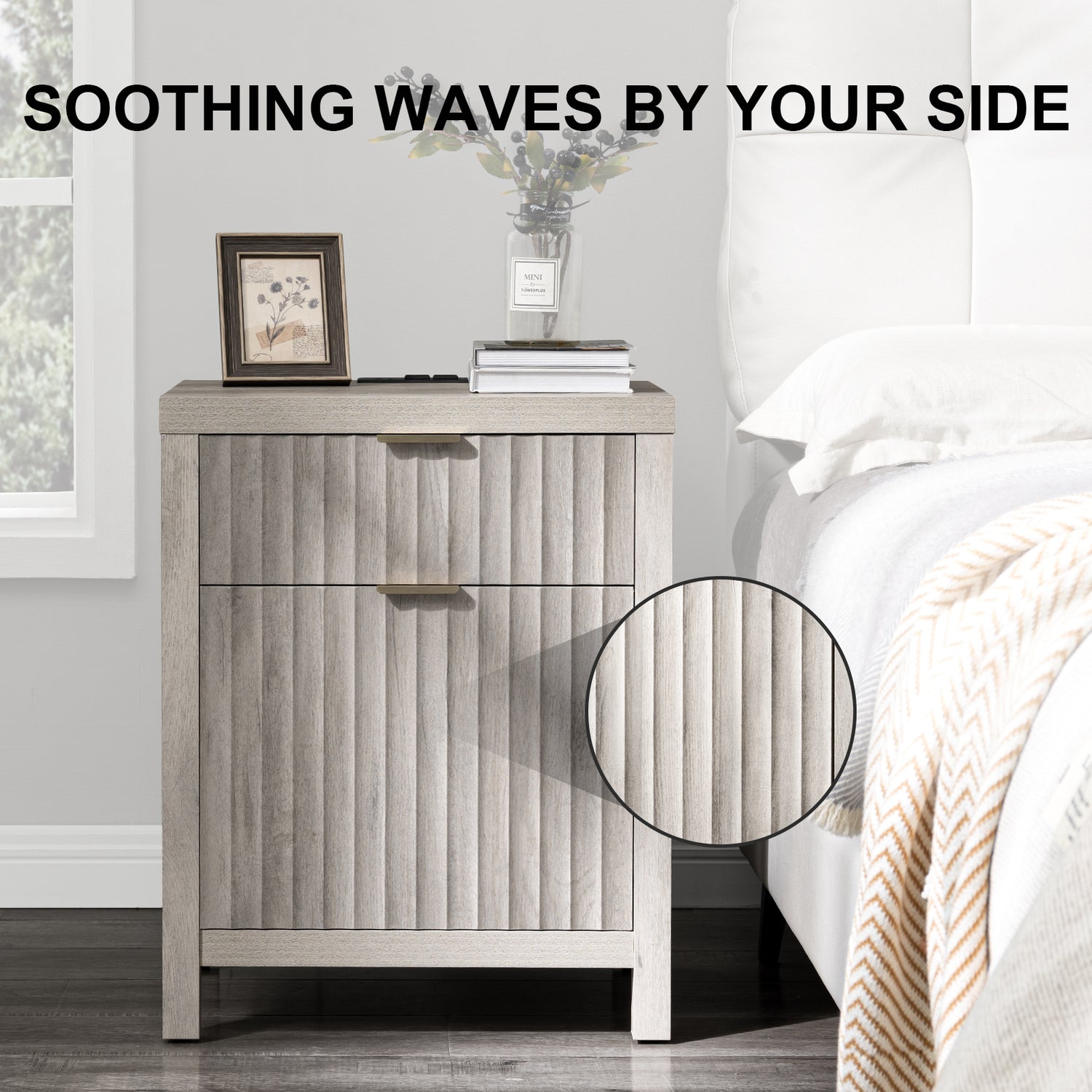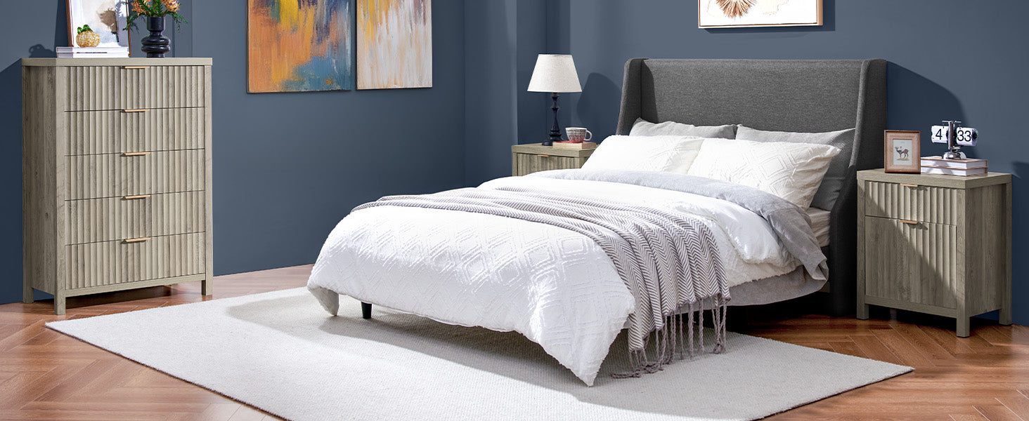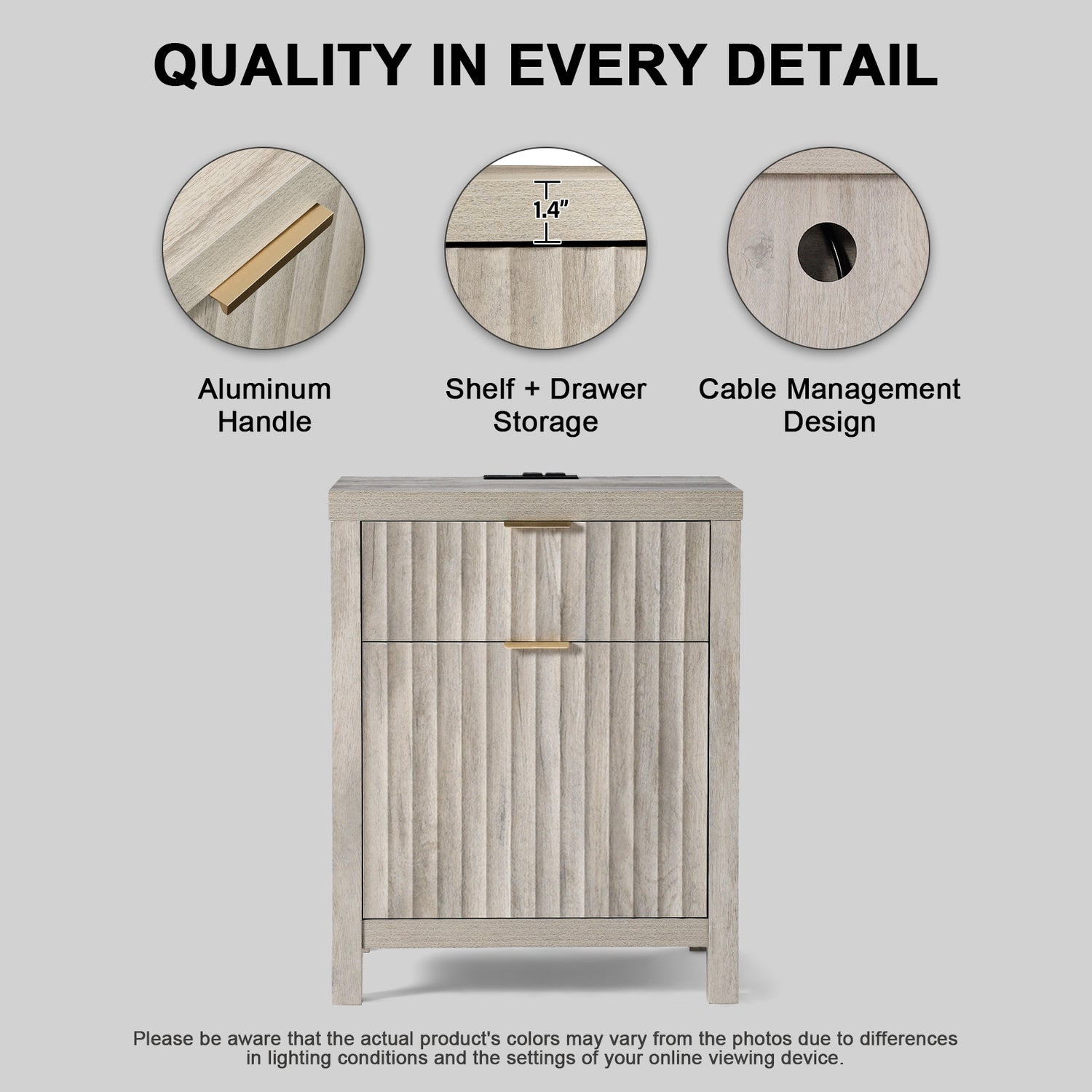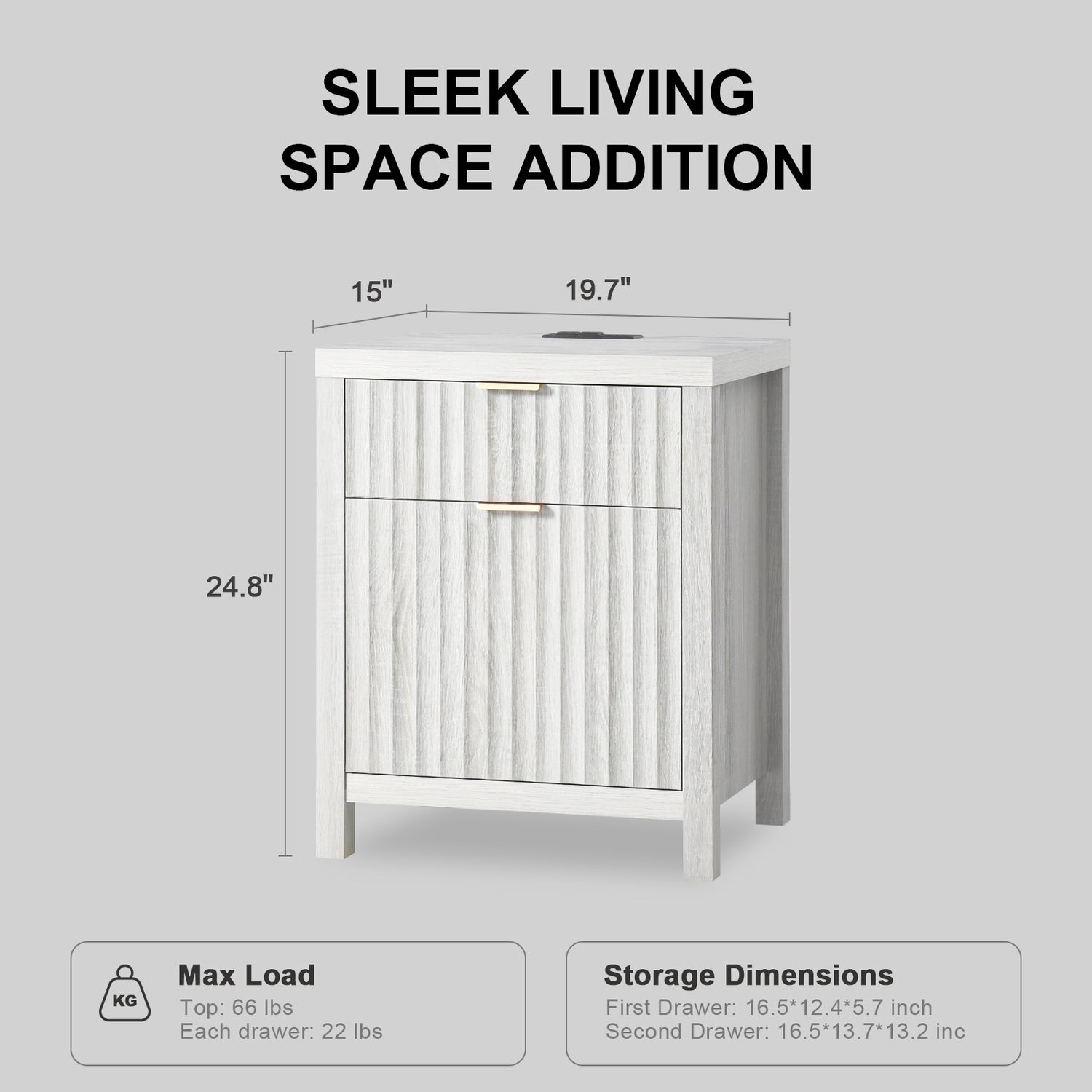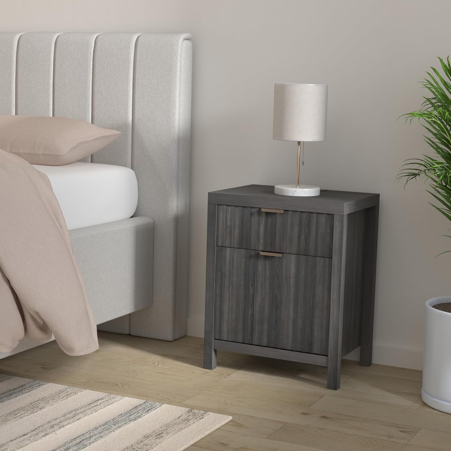 Wooden Fluted 2-Drawer Nightstand with Charging Station - Grey Oak / 1PC / Metal Wood is backordered and will ship as soon as it is back in stock.