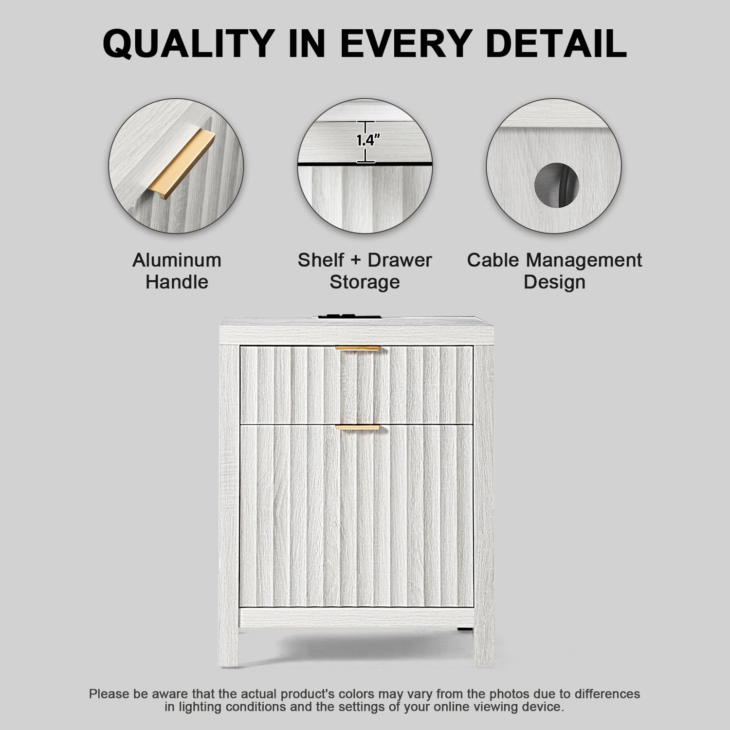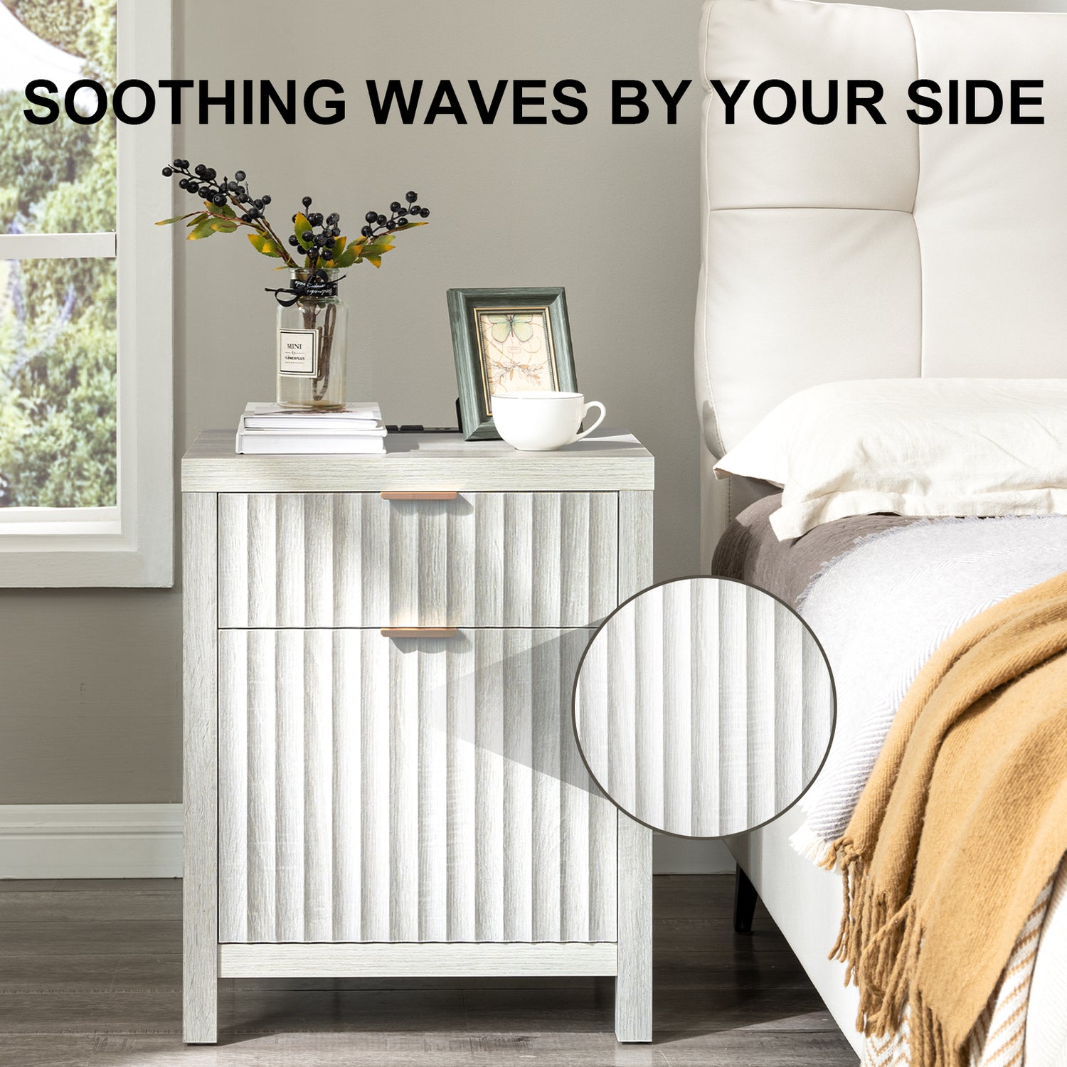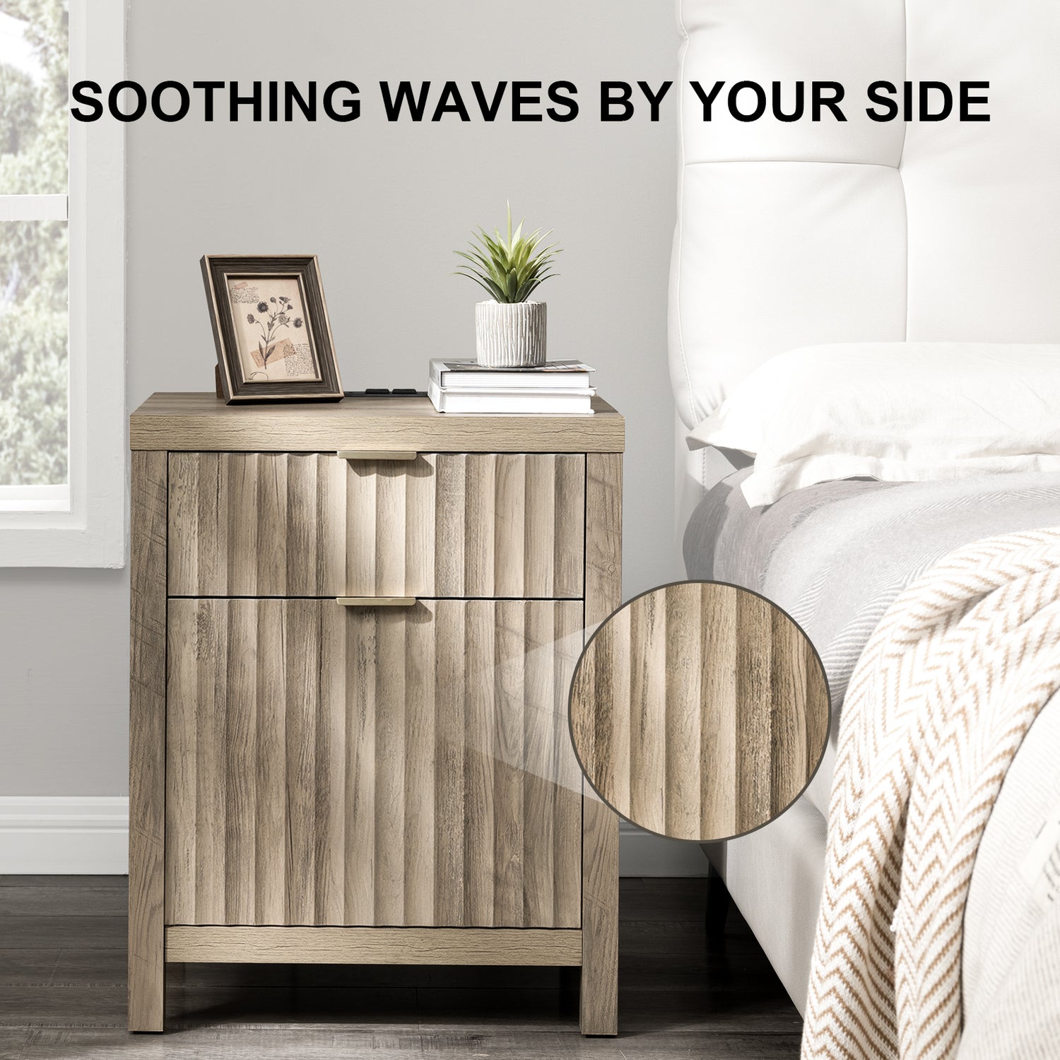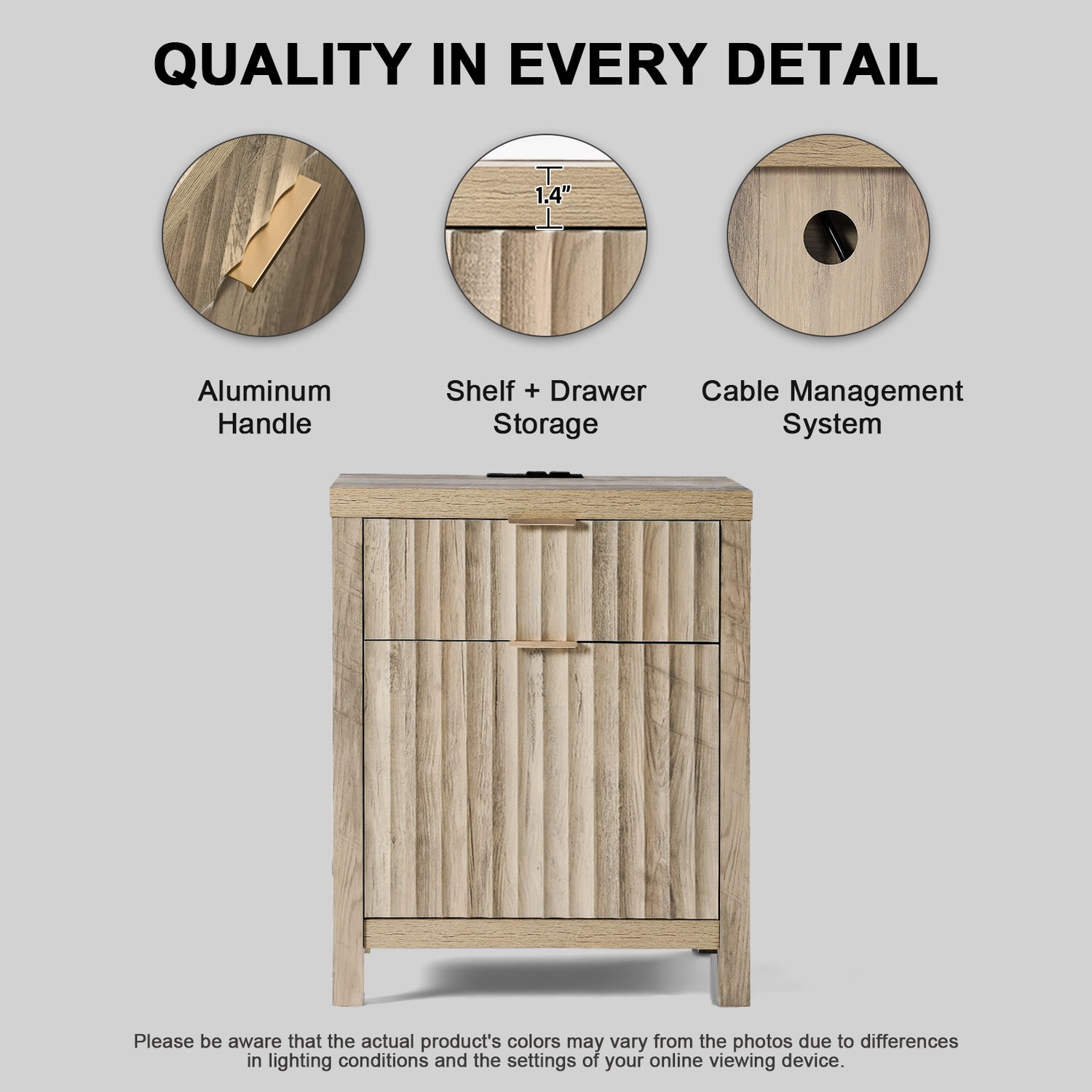 Wooden Fluted 2-Drawer Nightstand with Charging Station - Grey Oak / 1PC / Metal Wood is backordered and will ship as soon as it is back in stock.