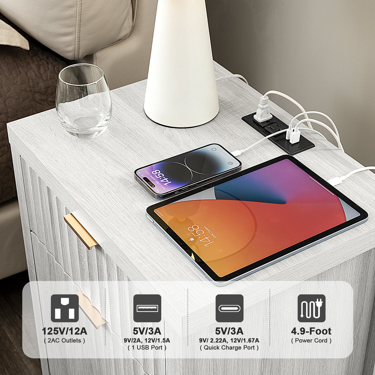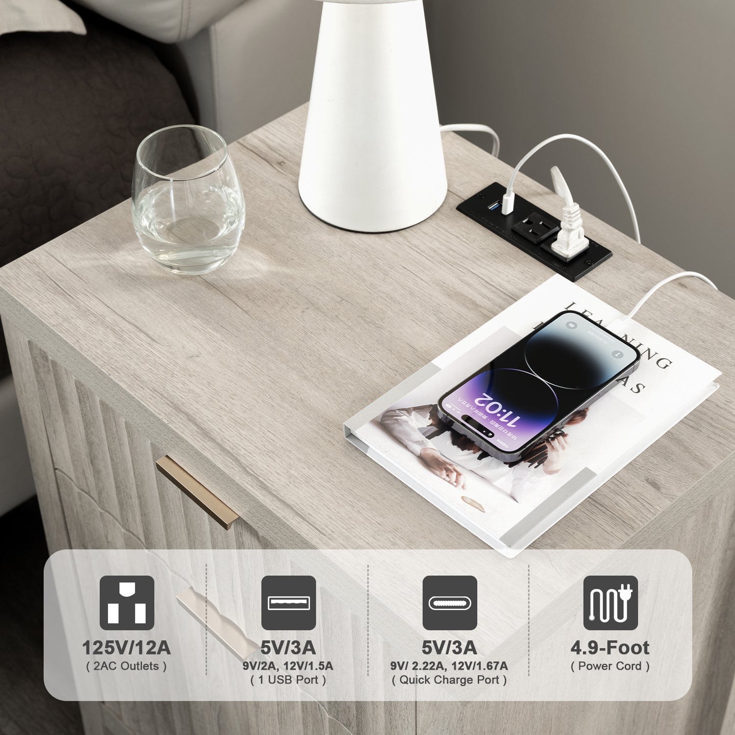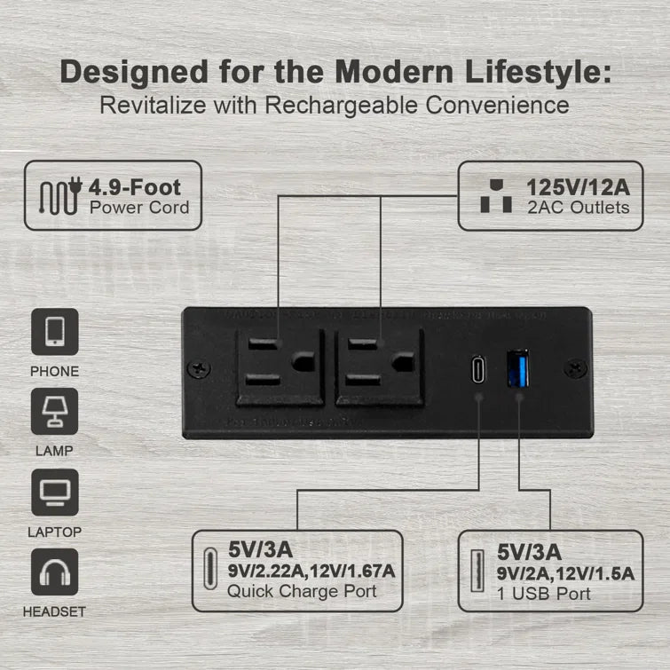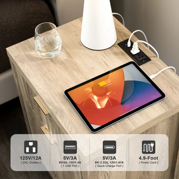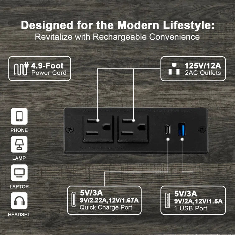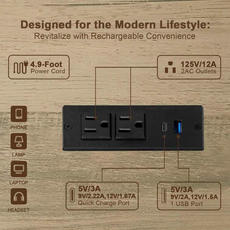 Maintain the power of your essential devices and have them at your fingertips with our practical coffee table equipped with a built-in charging station. With 2 USB ports and 2 outlets, it allows you to effortlessly charge multiple devices simultaneously. The 4.9ft power cord provides the flexibility to position the charging nightstand wherever you desire in your bedroom or living room.