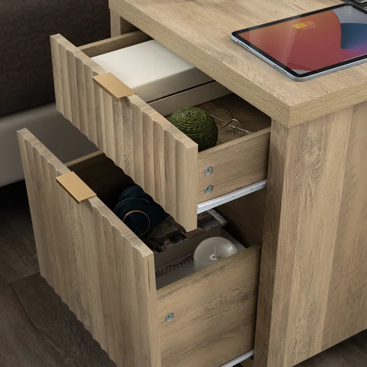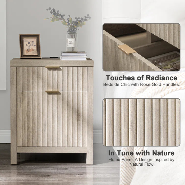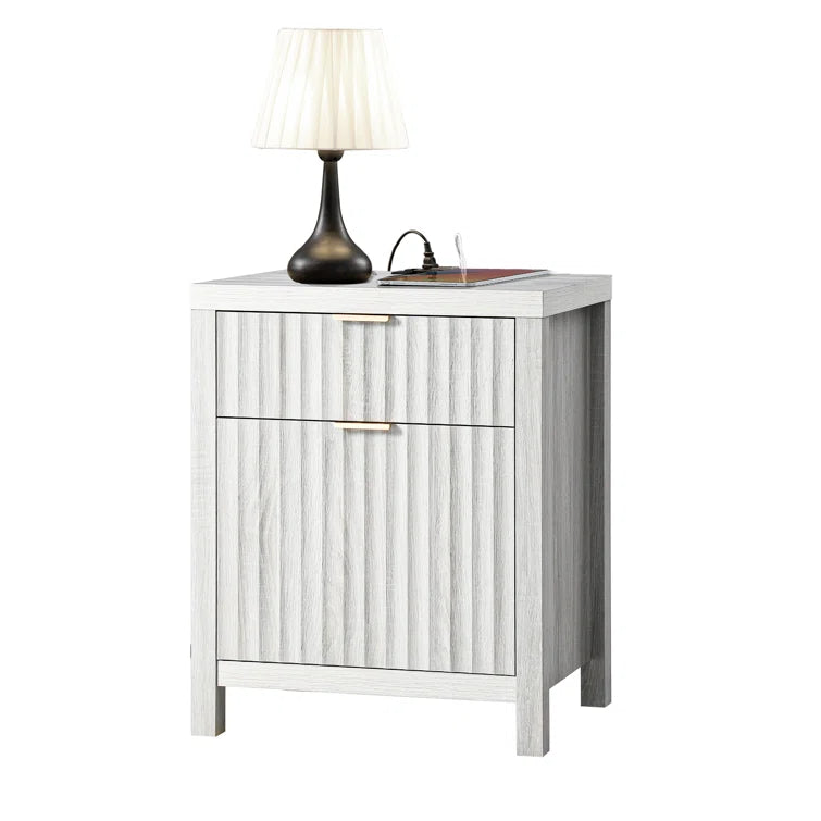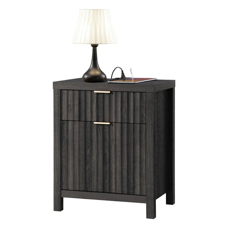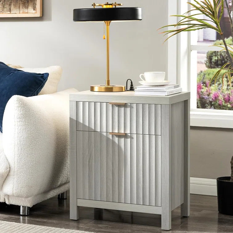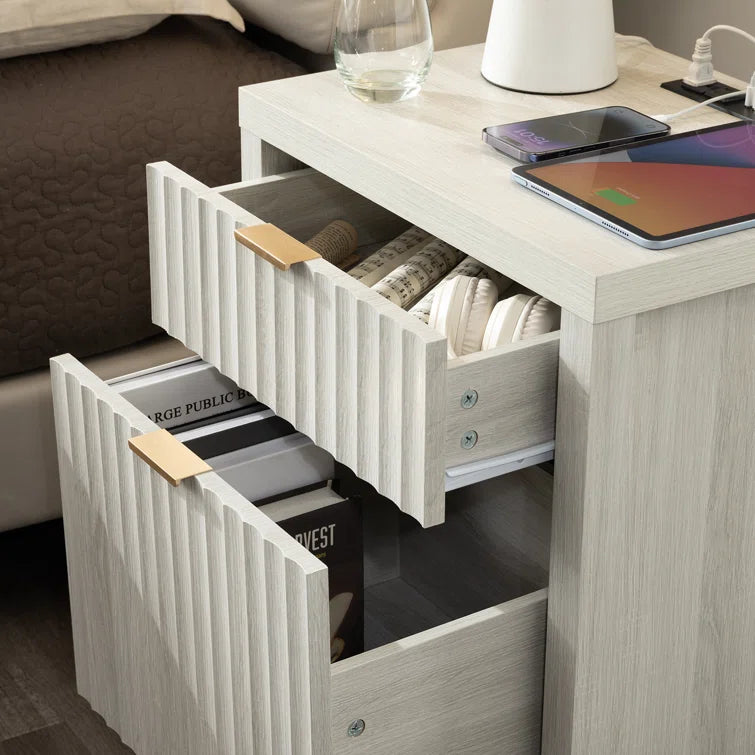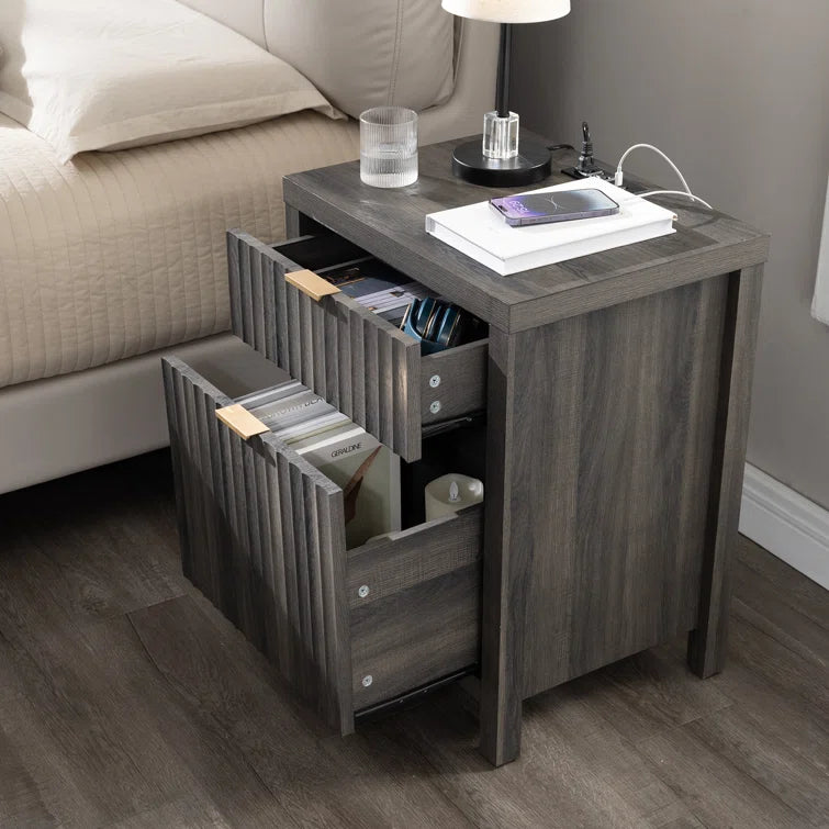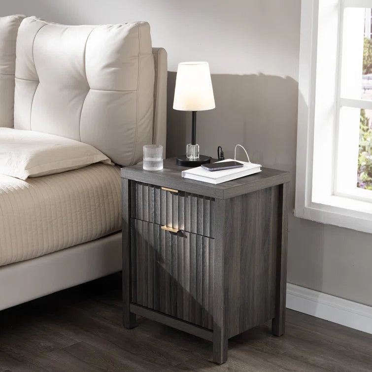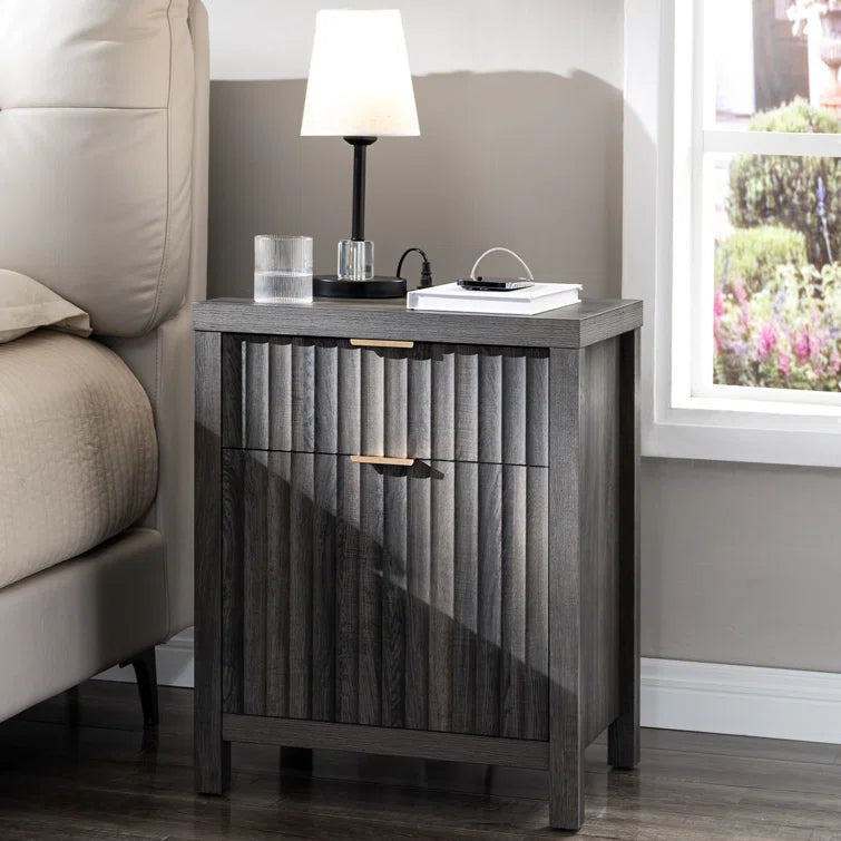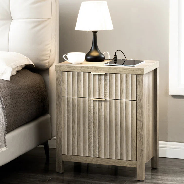 Wooden Fluted 2-Drawer Nightstand with Charging Station