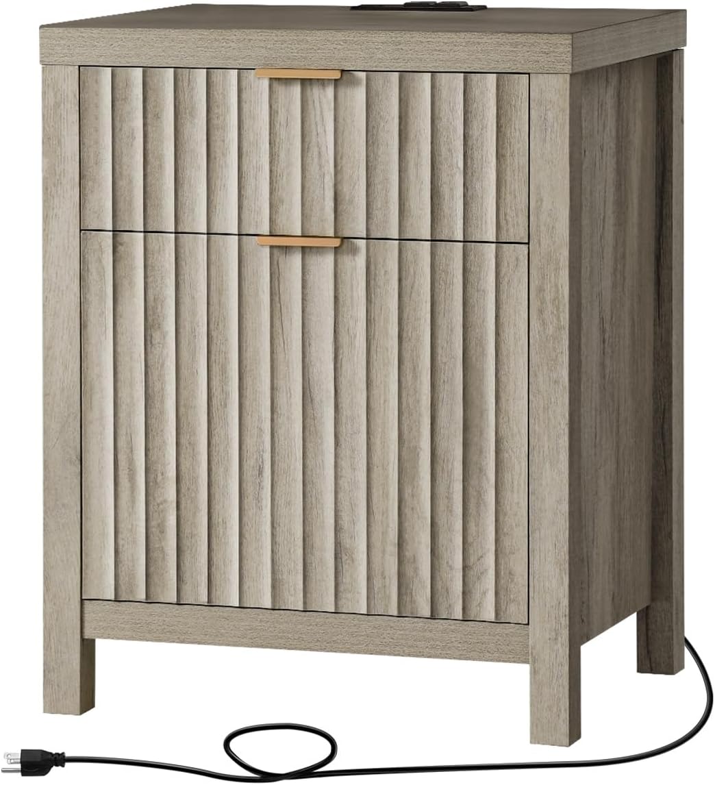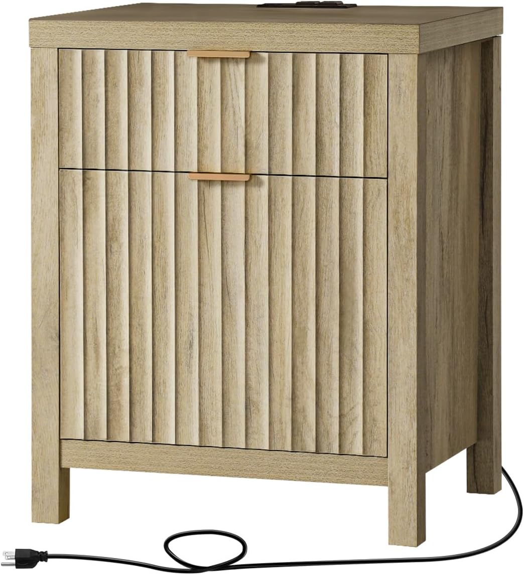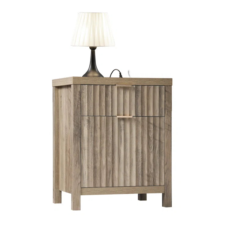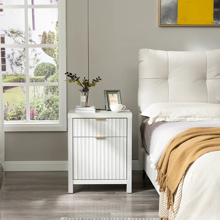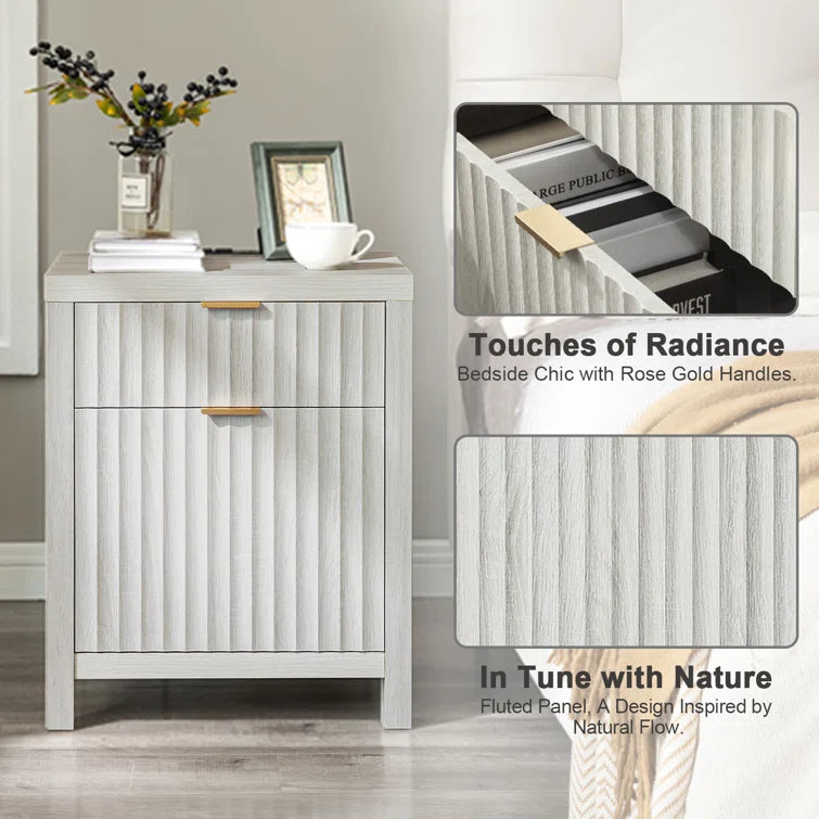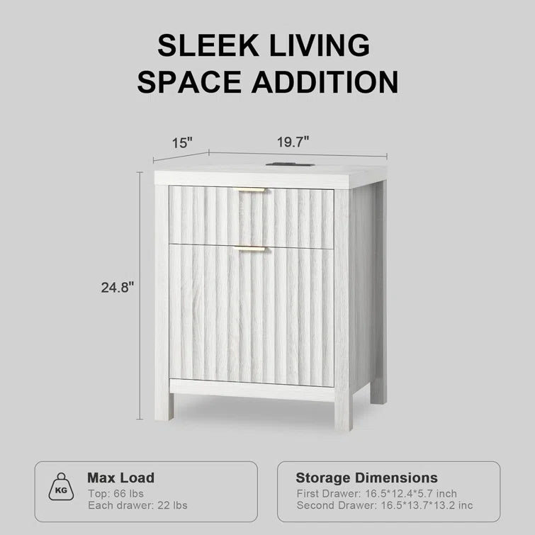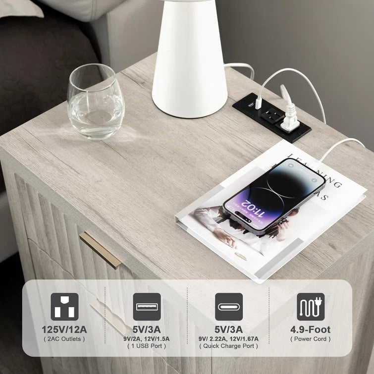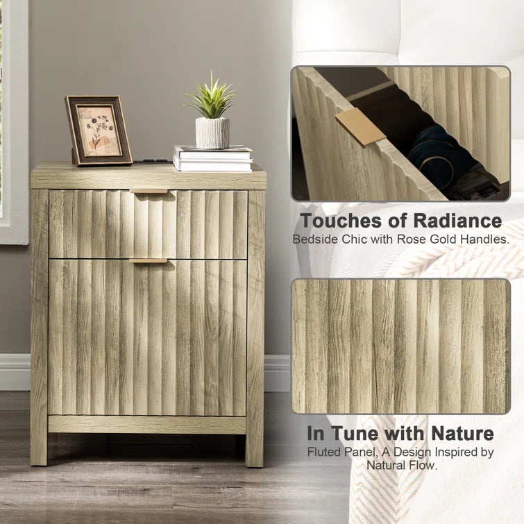 Wooden Fluted 2-Drawer Nightstand with Charging Station