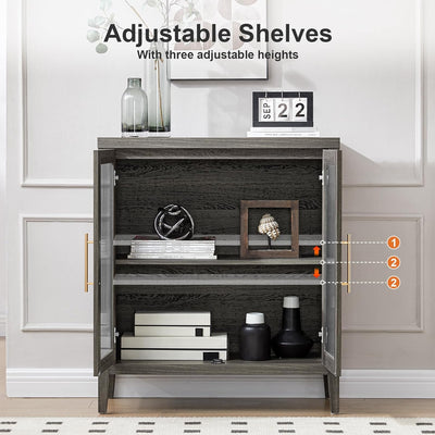 Featuring a two-door design adorned with ribbed glass that creates a hazy aesthetic in the light, the dining cabinet comes with adjustable shelves and offers three height options to customize the interior to your unique needs. Whether you're storing books, gadgets or decorative items, maximize storage efficiency and easily adapt to changing needs.
