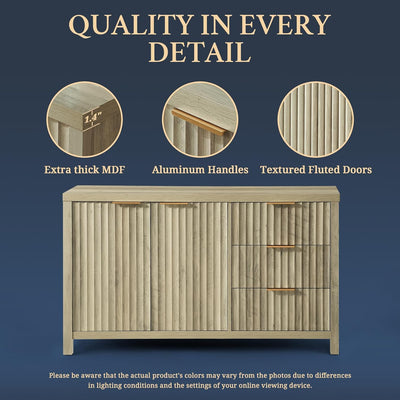 {"materialstitle":"Quality in Every Detail","image":"https://cdn.shopify.com/s/files/1/0780/4230/0713/files/1_0aa645cb-7537-4df8-bb36-3009a785778f.jpg?v=1722254869","paragraph":["This accent cabinet features hand-carved wavy patterns on each panel, enhancing the modern appeal and visual depth of your space, infusing every corner with a stylish and elegant ambiance.!","【3-Level Adjustable Shelves】This intricately designed buffet cabinet includes two doors and three drawers, with three adjustable shelves for flexible storage customization according to personal needs.","【Durable and Sturdy】 This modern sideboard is made from exterior grade MDF, enhancing both structural stability and durability. The 1.4-inch thick top ensures excellent load-bearing capacity, making it perfect for displaying decorative items.","【Product Dimensions】Total Dimensions: 46.69 L x 15.43 W x 29.21 H | Individual Storage: 25.98 L x 13.78 W x 23.62 H | Each Drawer: 16.54L x 13.78W x 5.71H inches | Maximum Top Panel Load: Maximum Top Panel Load: 100 lbs | Maximum Adjustable Shelves Load: 50 lbs | Maximum Drawers Load: 20 lbs | Cabinet leg height: 2.76 in.","【Easy to Assemble】This fluted credenza comes with clear, detailed instructions, numbered parts, and all necessary tools for assembly. Follow our video tutorial for easy setup, or reach out to our professional team for further assistance."]}