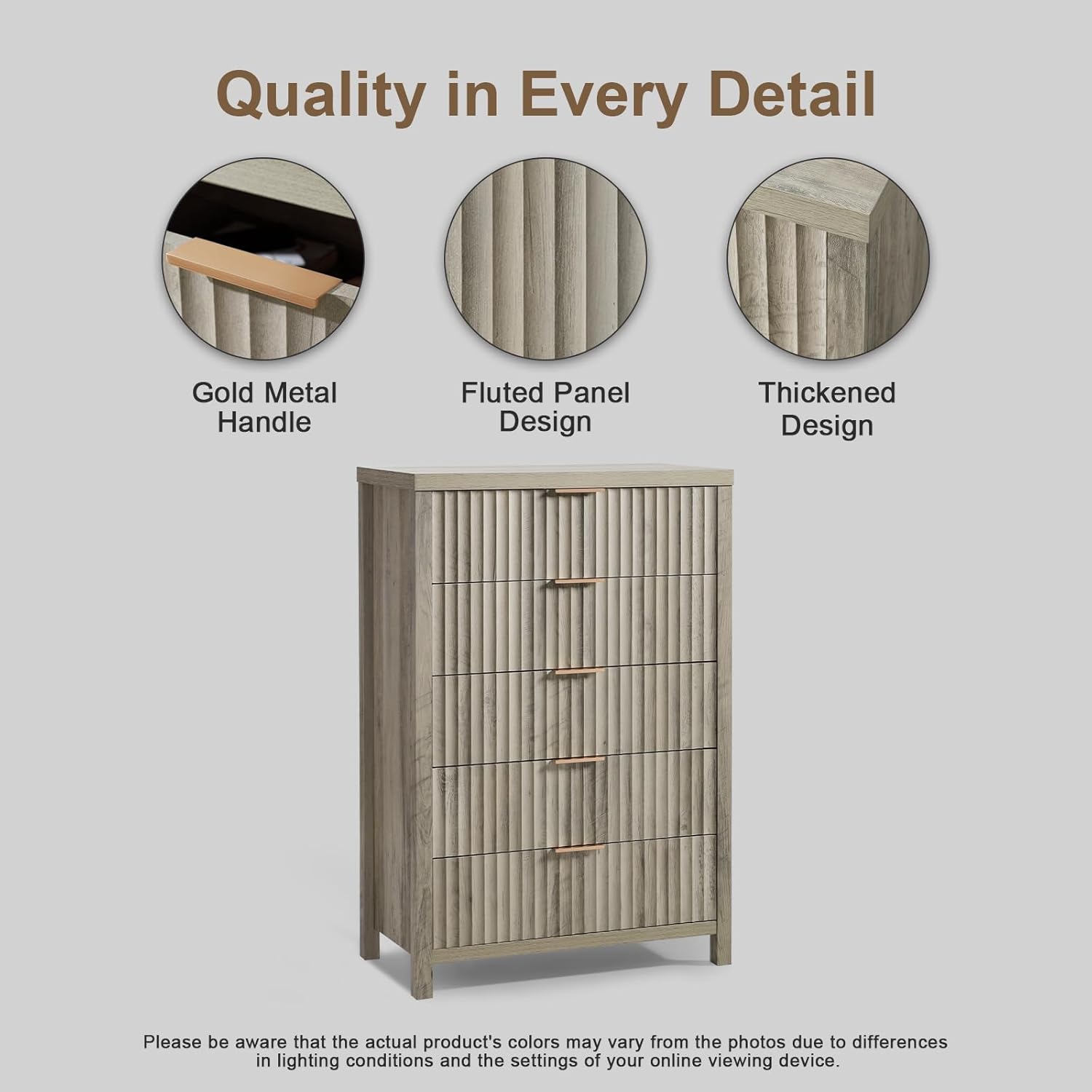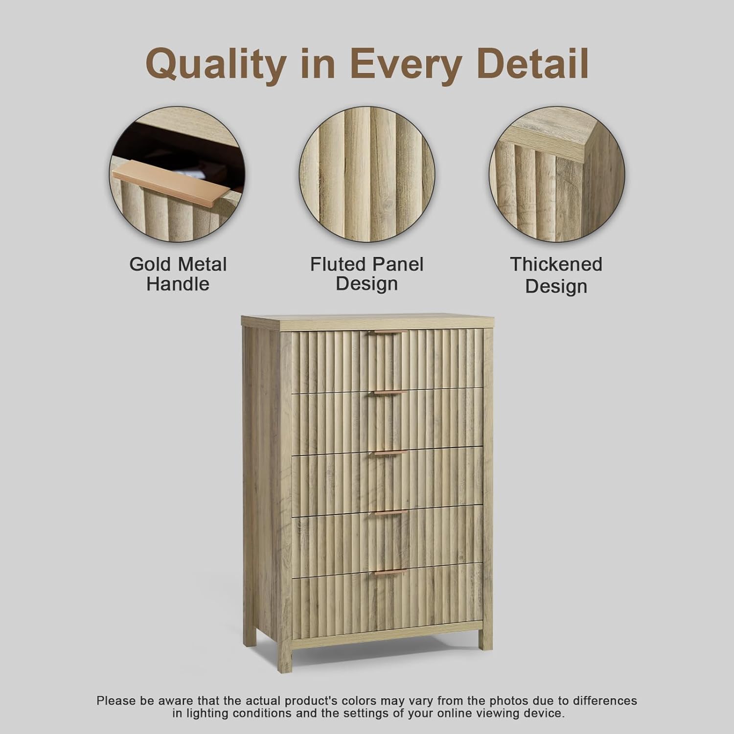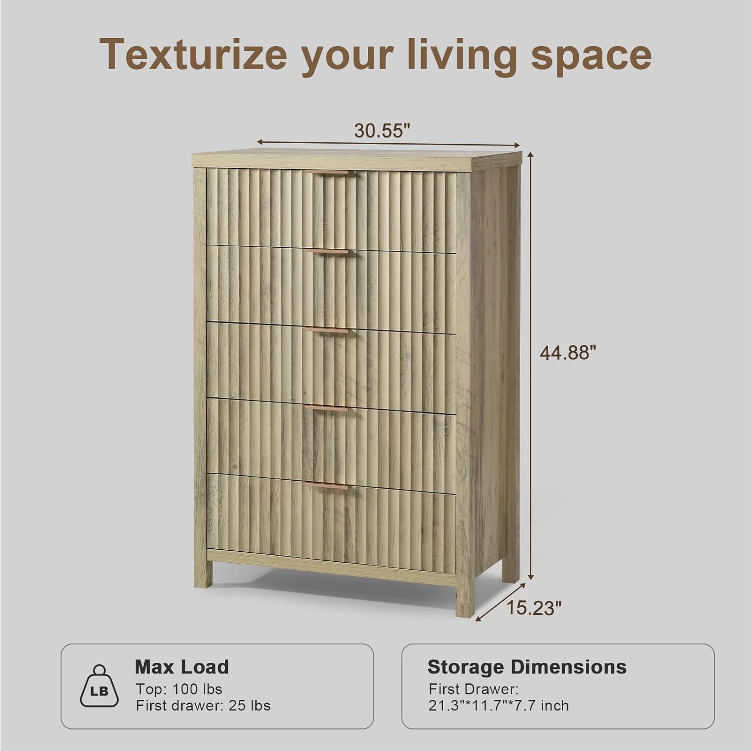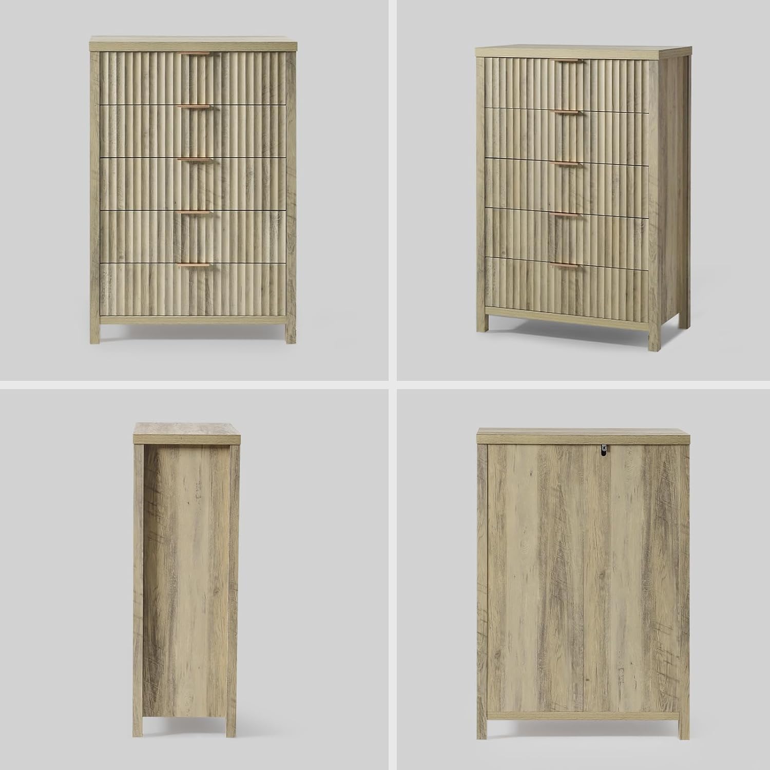 Wooden Fluted 5-Drawer Chest with Curved Silhouette Design - Sunwashed Ash Oak / 1PC / Exterior Grade MDF Board is backordered and will ship as soon as it is back in stock.