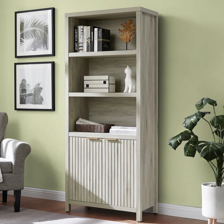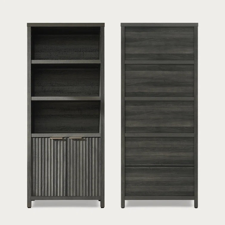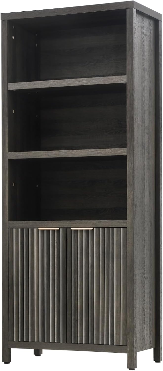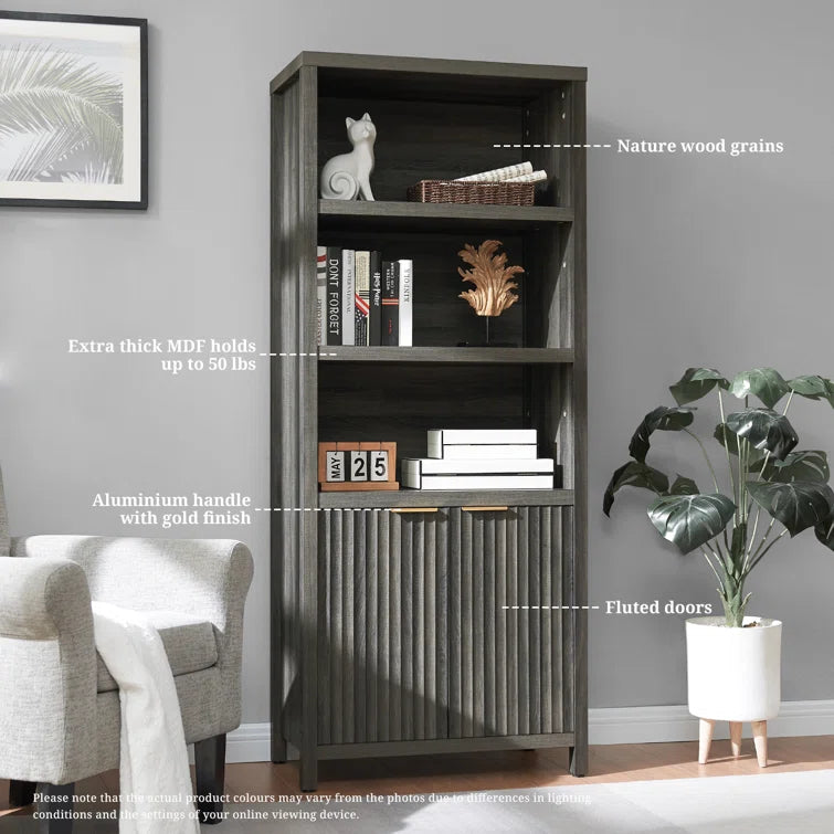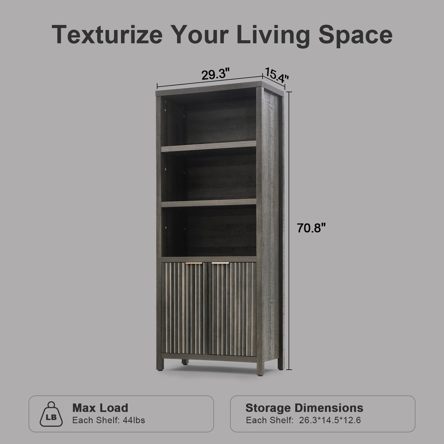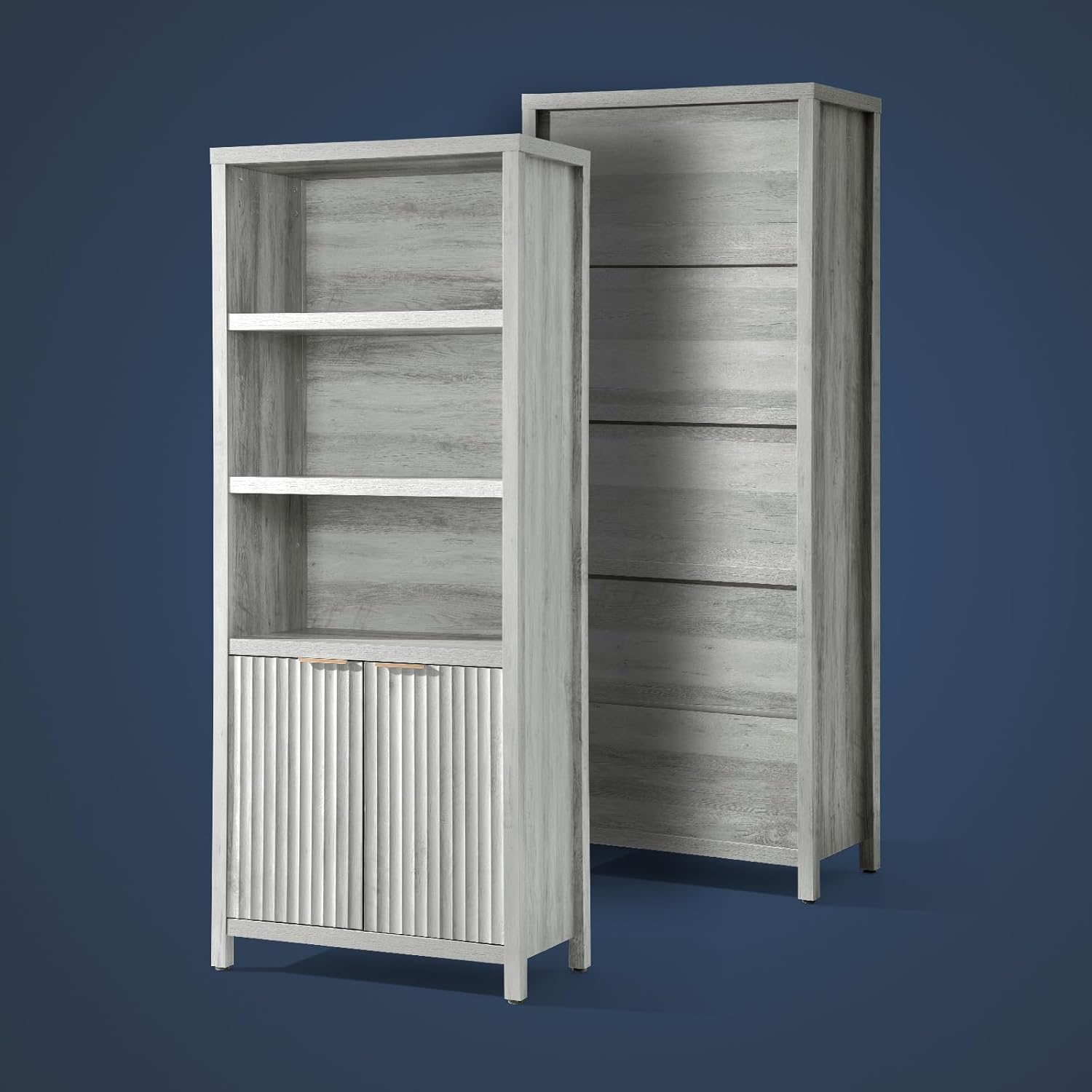 Wooden Fluted 5-Tier Tall Bookcase Cabinet with Doors - Grey Oak / 1PC / Exterior Grade MDF Board is backordered and will ship as soon as it is back in stock.