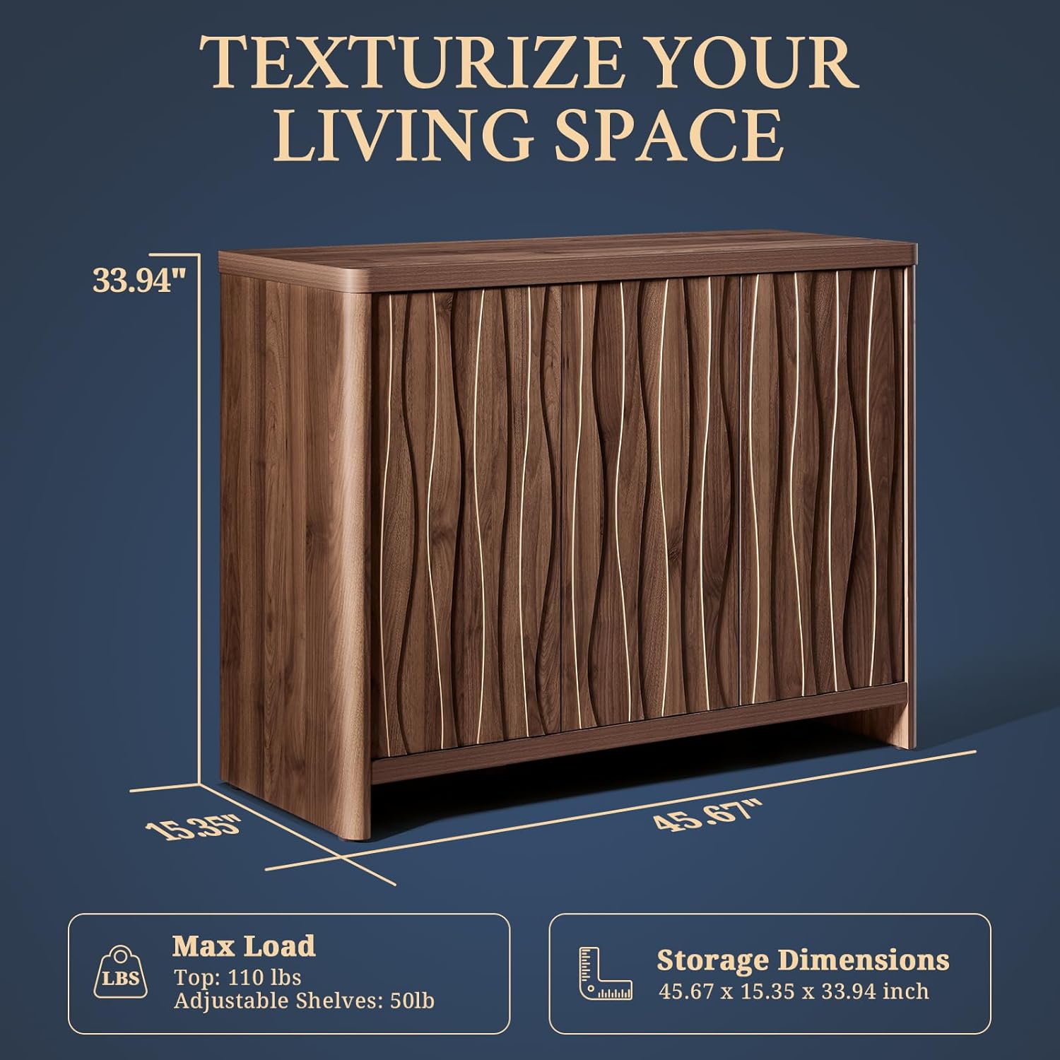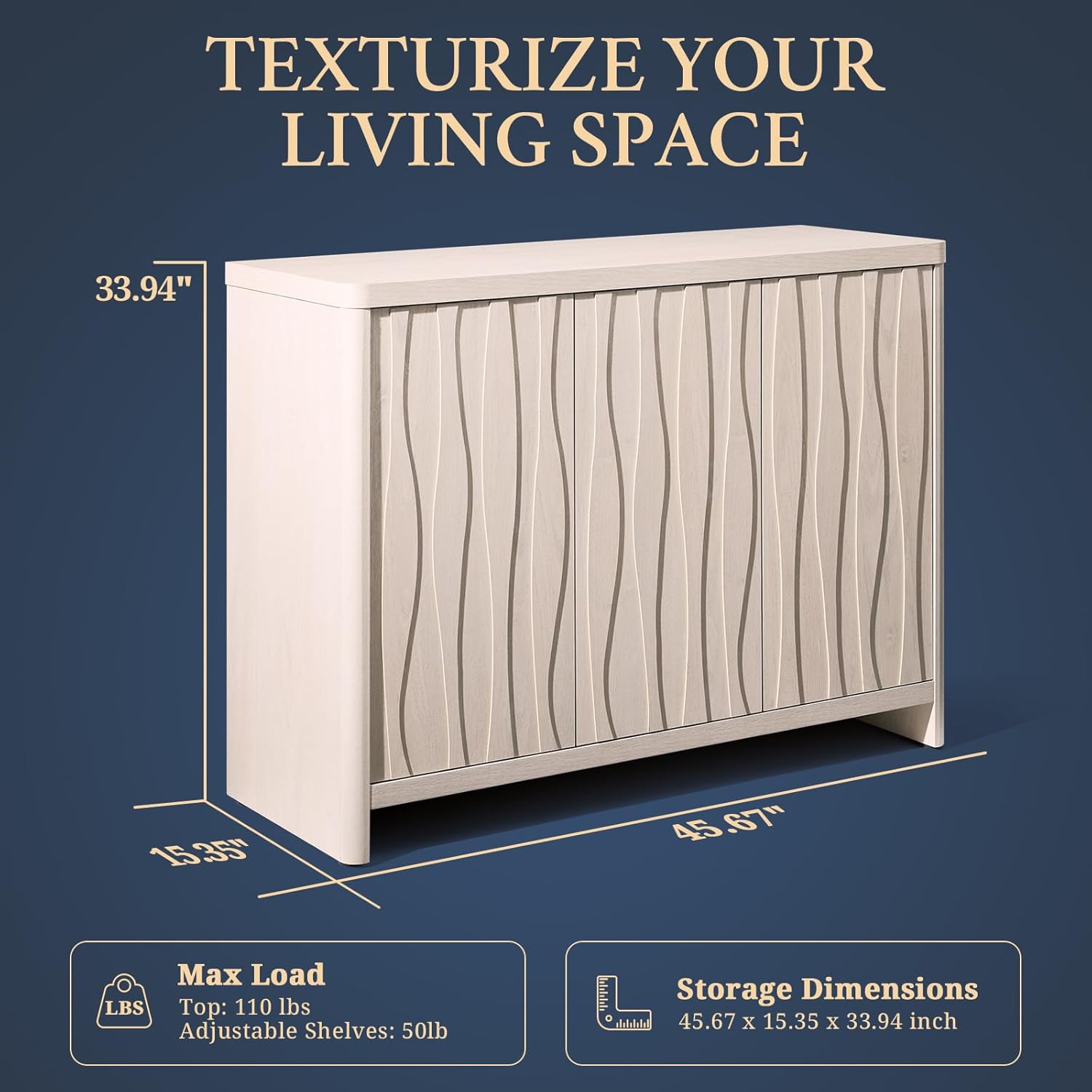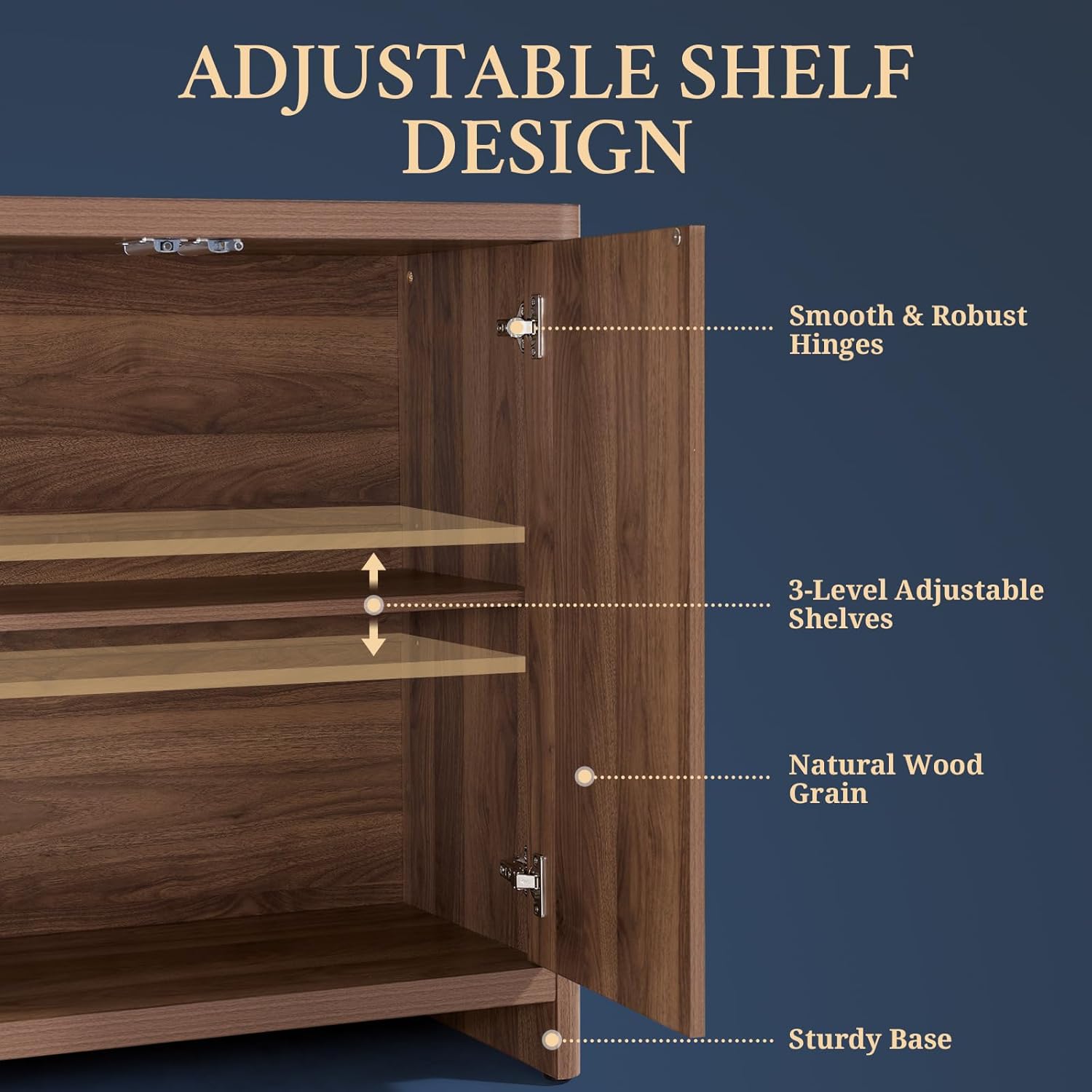 This sideboard storage cabinet is made from 1.4-inch thick external grade MDF material, with a sturdy base to ensure long-term stability and durability. Inside the doors, it features 3 height-adjustable shelves, allowing you to customize your storage space.
