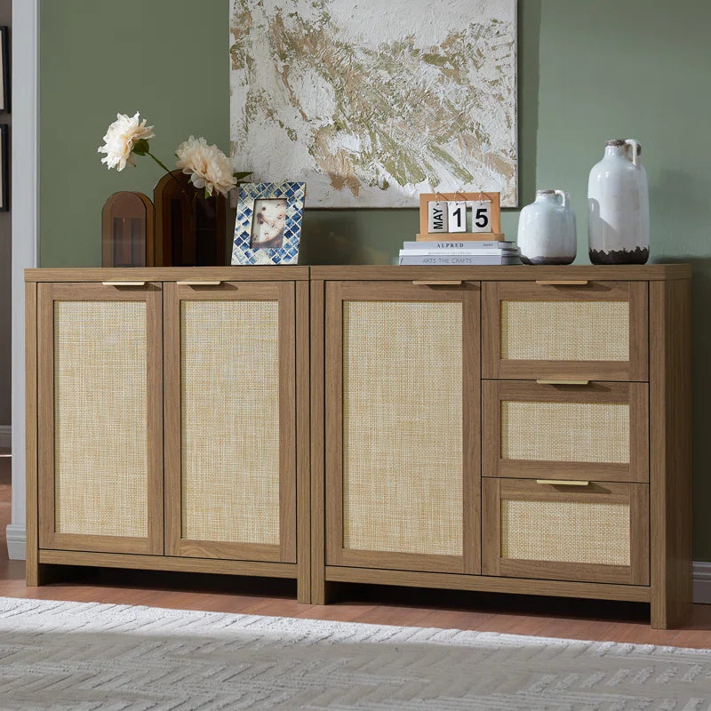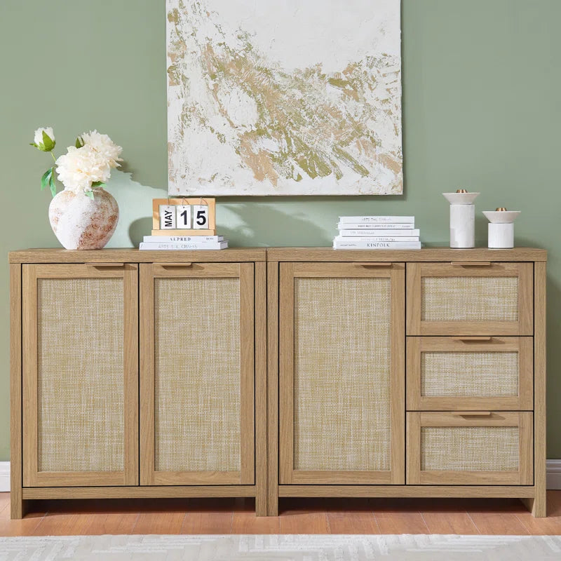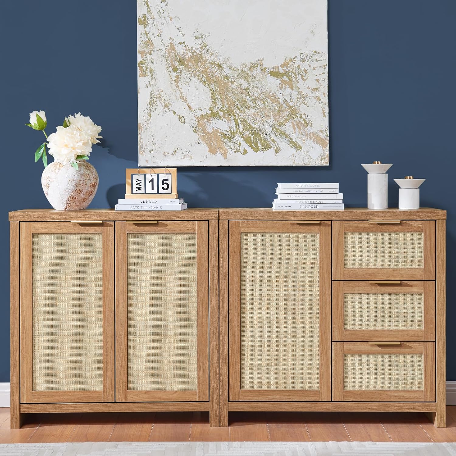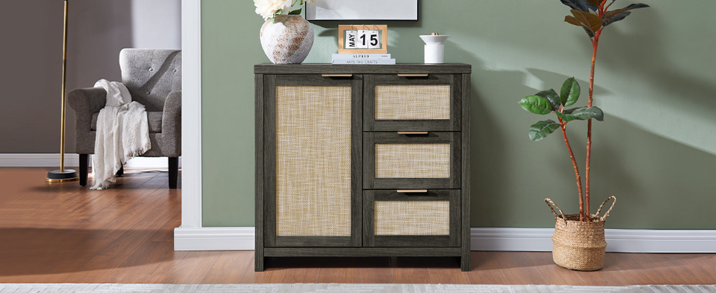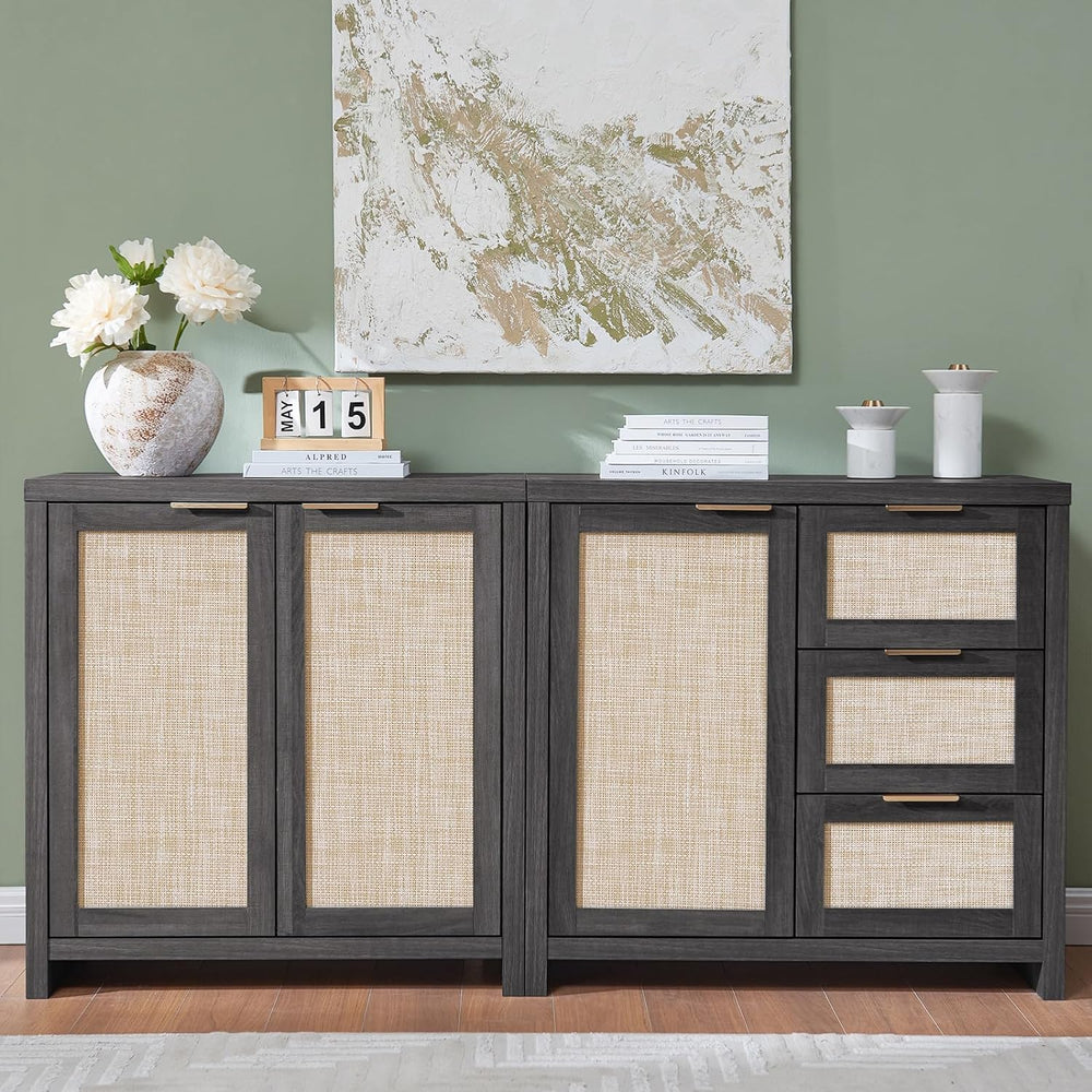 {"materialstitle":"Quality in Every Detail","image":"https://cdn.shopify.com/s/files/1/0780/4230/0713/files/1_4ee56d3b-fdd4-4328-98d0-ba2e61621943.jpg?v=1722239752","paragraph":["The two buffet cabinets feature rattan doors and stylish gold handles, effortlessly blending modern and farmhouse styles, making them a perfect addition to any room in your home. Depending on your needs, these cabinets can serve as a console table in the living room, a coffee bar cabinet in the dining room, or an entryway console cabinet!","【Adjustable Shelves】The internal adjustable shelves feature three height options, customizing your storage experience to effectively meet your specific storage needs. This thoughtful functionality maximizes your storage options, providing flexibility and ensuring your items find the perfect place in the cabinet.","【More Storage Possibilities with 2 Cabinets】Our Single Door 3 Drawer Cabinet and Double Door Cabinet give you more storage space. The two cabinets are perfectly matched in size at 13.7 inches wide and 32.7 inches high. The Single Door 3 Drawer Chest measures 34 inches in length, while the Double Door Chest measures 31.4 inches in length. This dynamic pair will elevate your space and provide versatile solutions for all your organizational needs.","【Package Includes】You will receive two packages: one for the '2-door cabinet' and another for the '1-door 3-drawer cabinet'.","【Easy to Install】Bid farewell to complicated assembly processes. Our rattan sideboard buffet cabinet is designed for easy setup. Every part is thoughtfully labeled, and the accompanying instructions include detailed illustrations for each step. If you have any questions, feel free to contact us - we're here to assist you throughout."]}