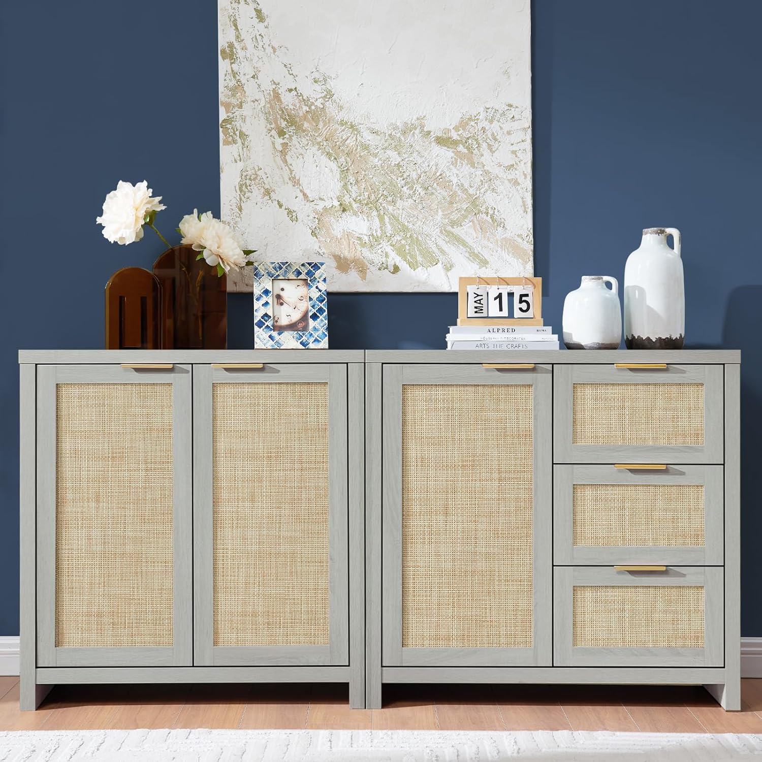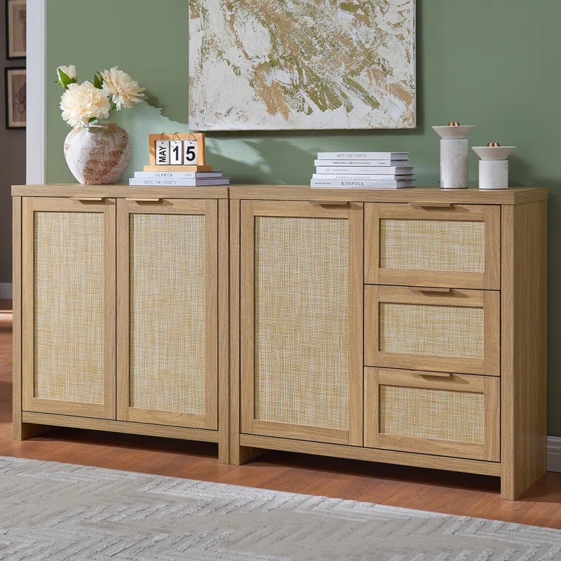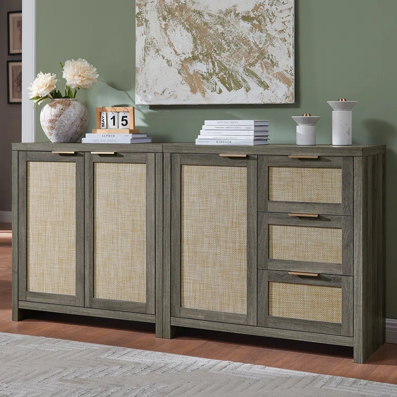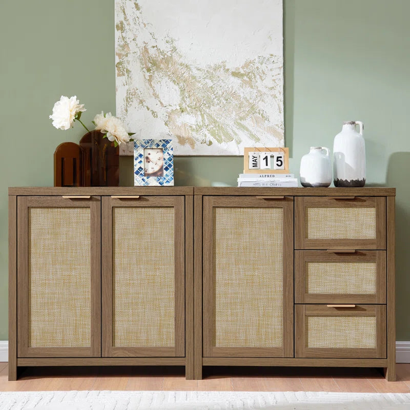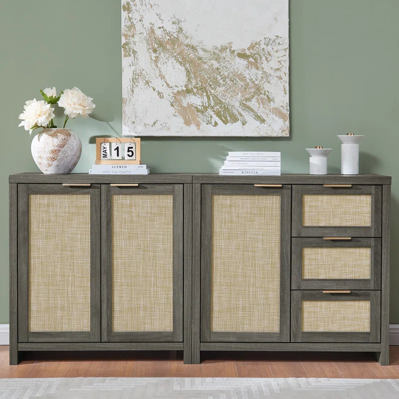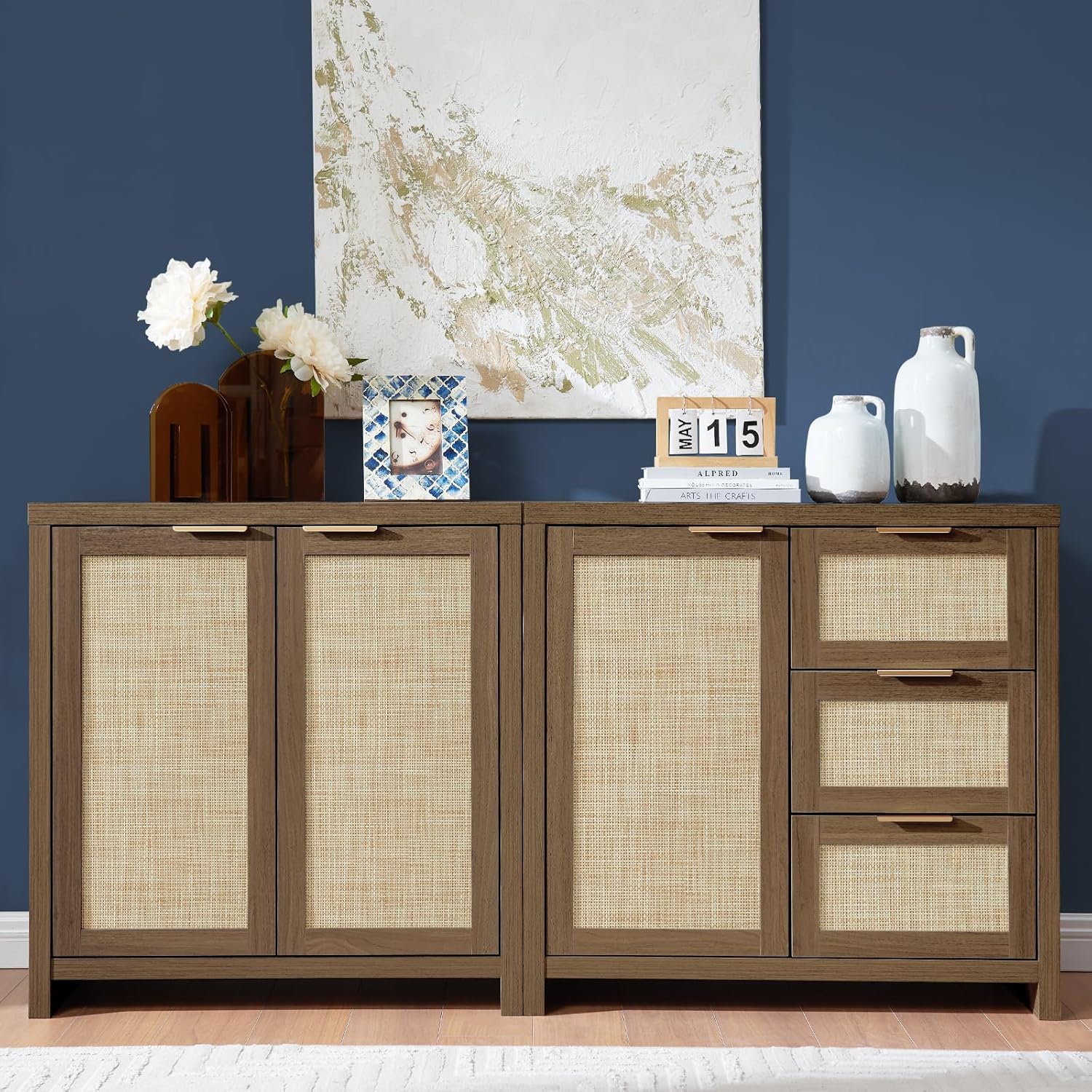 {"materialstitle":"Quality in Every Detail","image":"https://cdn.shopify.com/s/files/1/0780/4230/0713/files/1_4ee56d3b-fdd4-4328-98d0-ba2e61621943.jpg?v=1722239752","paragraph":["The two buffet cabinets feature rattan doors and stylish gold handles, effortlessly blending modern and farmhouse styles, making them a perfect addition to any room in your home. Depending on your needs, these cabinets can serve as a console table in the living room, a coffee bar cabinet in the dining room, or an entryway console cabinet!","【Adjustable Shelves】The internal adjustable shelves feature three height options, customizing your storage experience to effectively meet your specific storage needs. This thoughtful functionality maximizes your storage options, providing flexibility and ensuring your items find the perfect place in the cabinet.","【More Storage Possibilities with 2 Cabinets】Our Single Door 3 Drawer Cabinet and Double Door Cabinet give you more storage space. The two cabinets are perfectly matched in size at 13.7 inches wide and 32.7 inches high. The Single Door 3 Drawer Chest measures 34 inches in length, while the Double Door Chest measures 31.4 inches in length. This dynamic pair will elevate your space and provide versatile solutions for all your organizational needs.","【Package Includes】You will receive two packages: one for the '2-door cabinet' and another for the '1-door 3-drawer cabinet'.","【Easy to Install】Bid farewell to complicated assembly processes. Our rattan sideboard buffet cabinet is designed for easy setup. Every part is thoughtfully labeled, and the accompanying instructions include detailed illustrations for each step. If you have any questions, feel free to contact us - we're here to assist you throughout."]}