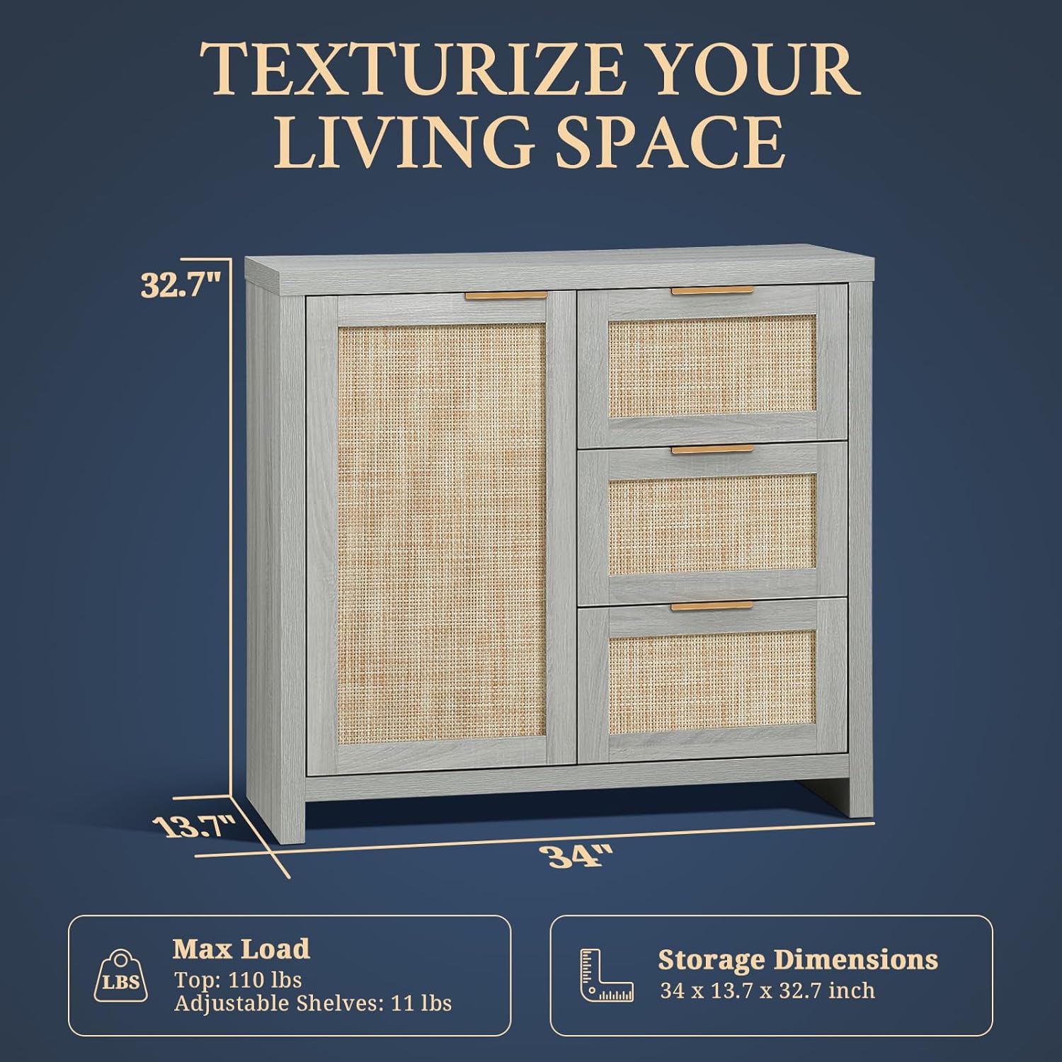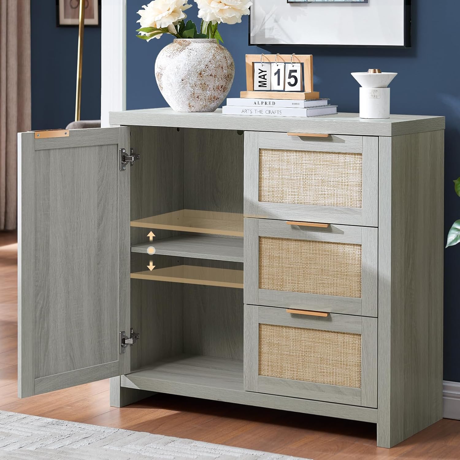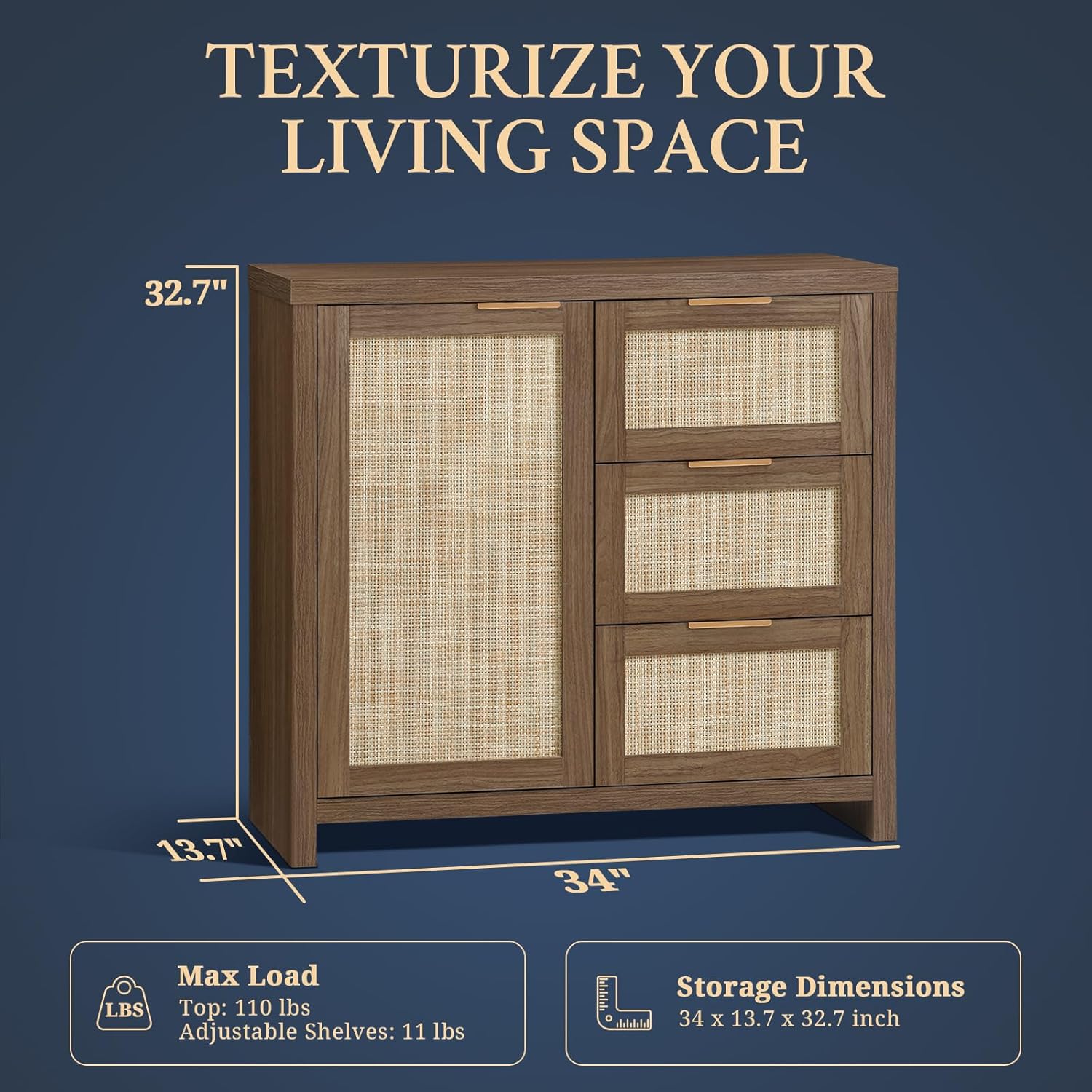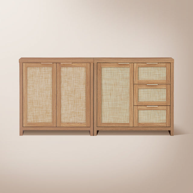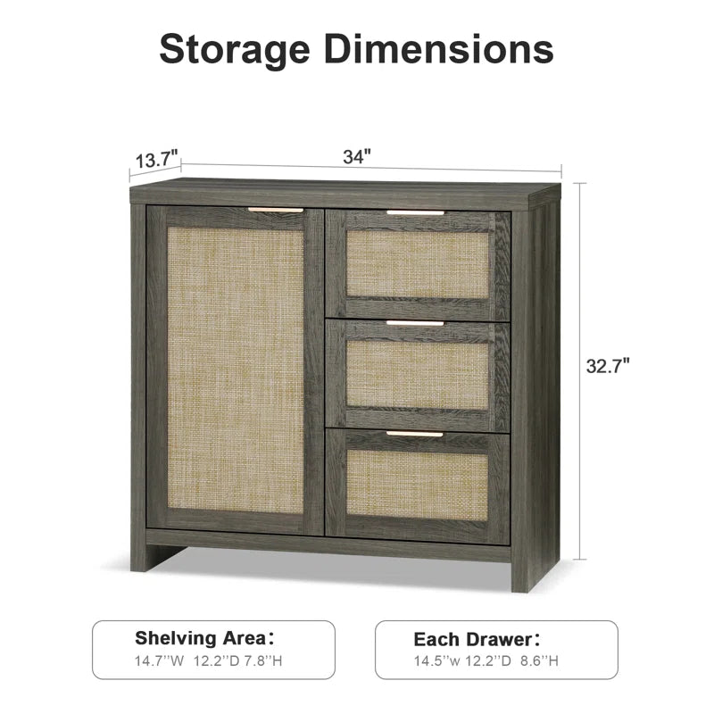 {"materialstitle":"Quality in Every Detail","image":"https://cdn.shopify.com/s/files/1/0780/4230/0713/files/1_4ee56d3b-fdd4-4328-98d0-ba2e61621943.jpg?v=1722239752","paragraph":["The two buffet cabinets feature rattan doors and stylish gold handles, effortlessly blending modern and farmhouse styles, making them a perfect addition to any room in your home. Depending on your needs, these cabinets can serve as a console table in the living room, a coffee bar cabinet in the dining room, or an entryway console cabinet!","【Adjustable Shelves】The internal adjustable shelves feature three height options, customizing your storage experience to effectively meet your specific storage needs. This thoughtful functionality maximizes your storage options, providing flexibility and ensuring your items find the perfect place in the cabinet.","【More Storage Possibilities with 2 Cabinets】Our Single Door 3 Drawer Cabinet and Double Door Cabinet give you more storage space. The two cabinets are perfectly matched in size at 13.7 inches wide and 32.7 inches high. The Single Door 3 Drawer Chest measures 34 inches in length, while the Double Door Chest measures 31.4 inches in length. This dynamic pair will elevate your space and provide versatile solutions for all your organizational needs.","【Package Includes】You will receive two packages: one for the '2-door cabinet' and another for the '1-door 3-drawer cabinet'.","【Easy to Install】Bid farewell to complicated assembly processes. Our rattan sideboard buffet cabinet is designed for easy setup. Every part is thoughtfully labeled, and the accompanying instructions include detailed illustrations for each step. If you have any questions, feel free to contact us - we're here to assist you throughout."]}