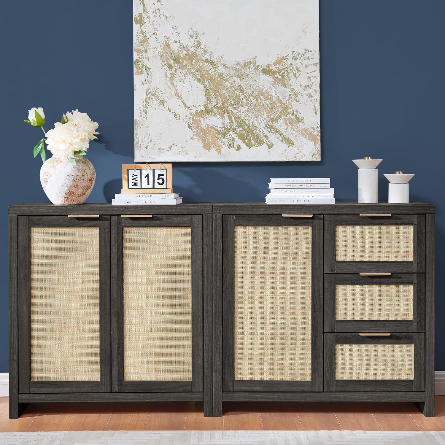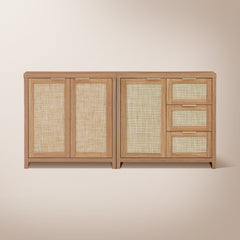 This rattan sideboard storage set is amazing! The 65.4-inch large design is perfect for my kitchen, providing ample storage space while enhancing the overall aesthetic. The sideboard has 3 doors and 3 drawers, each section is well-designed to efficiently organize and store various kitchen items.