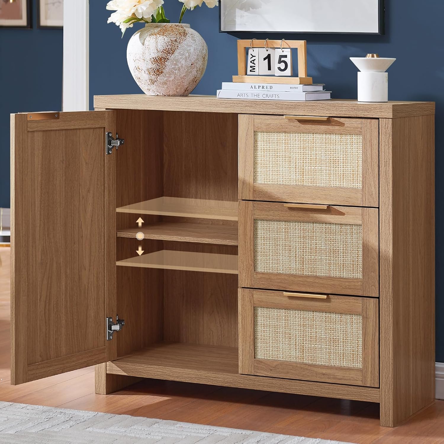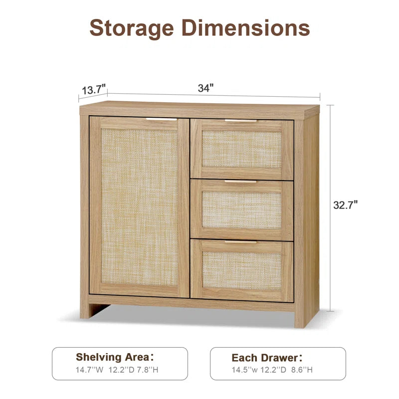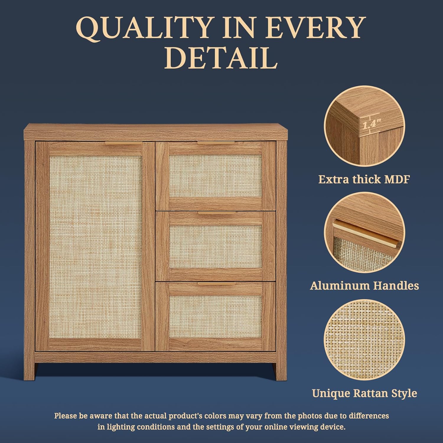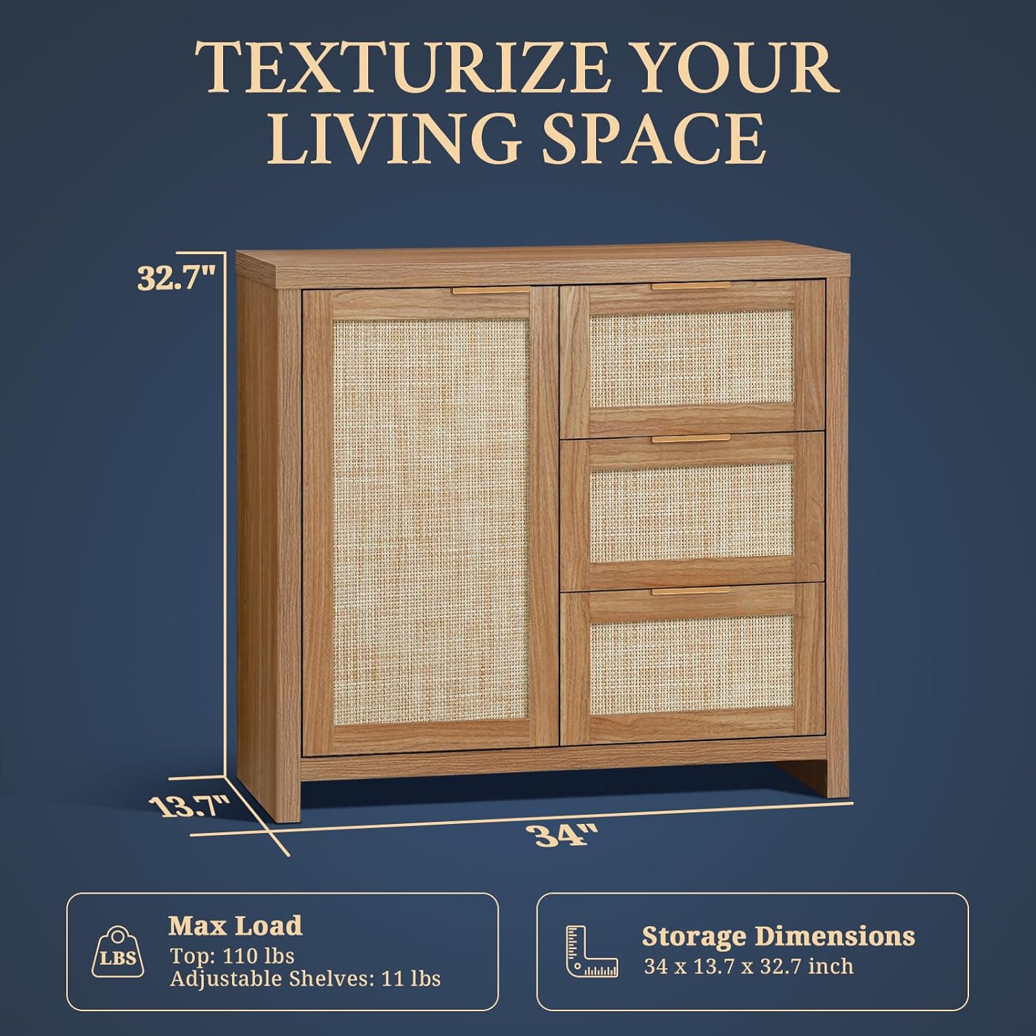 This storage cabinet is perfect for my living room. The rattan design adds a beautiful touch of texture, and it offers plenty of space for all my items. The three drawers are great for smaller items, and the doors keep everything else organized and hidden. Highly recommend it!