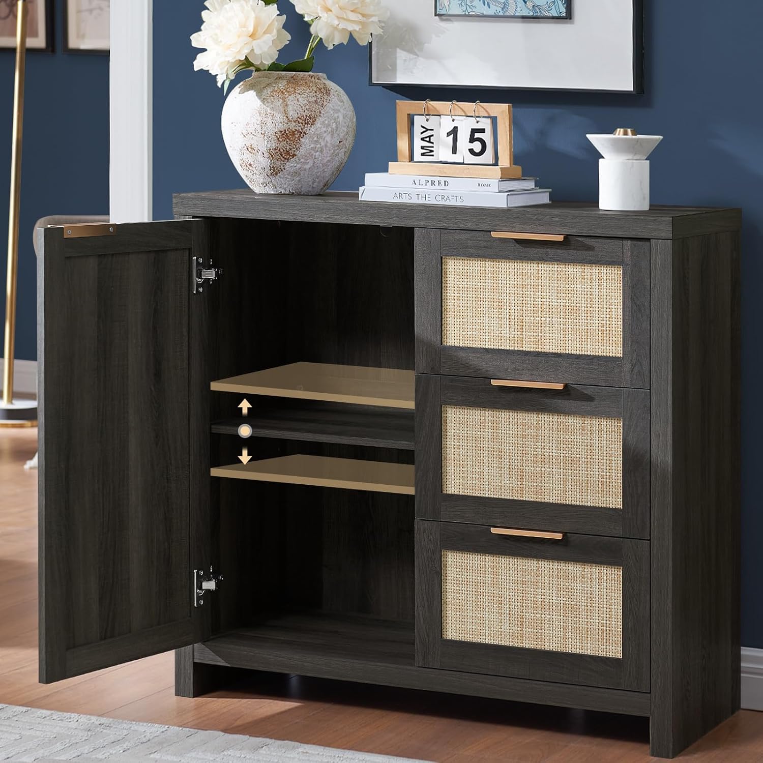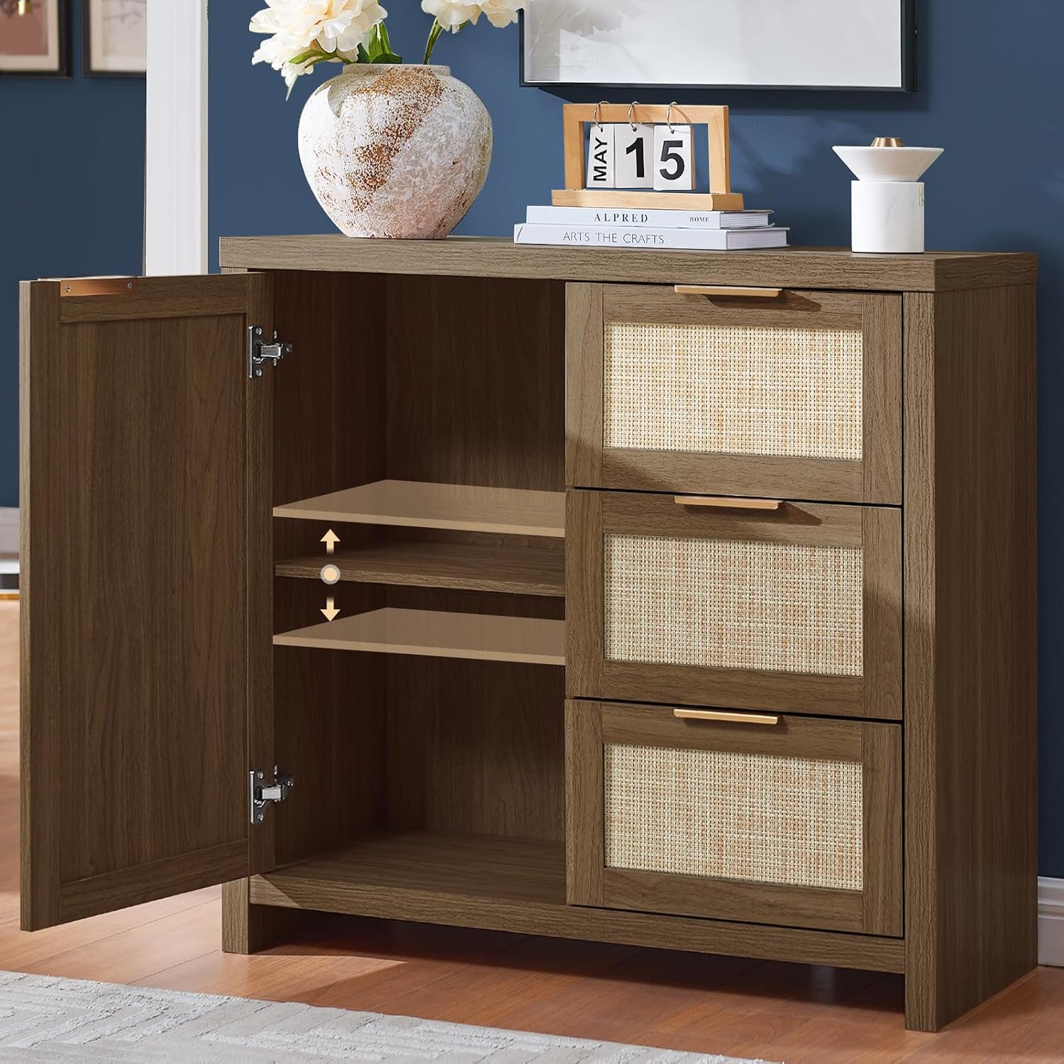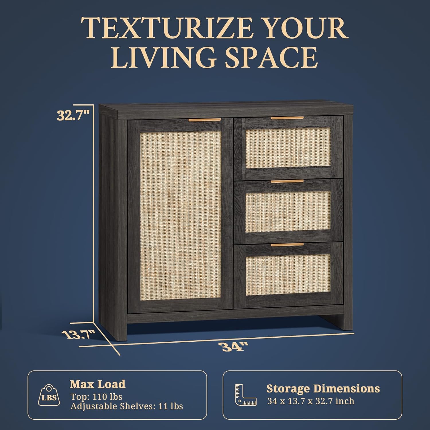 This storage cabinet is perfect for my living room. The rattan design adds a beautiful touch of texture, and it offers plenty of space for all my items. The three drawers are great for smaller items, and the doors keep everything else organized and hidden. Highly recommend it!