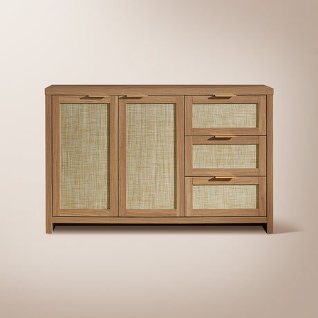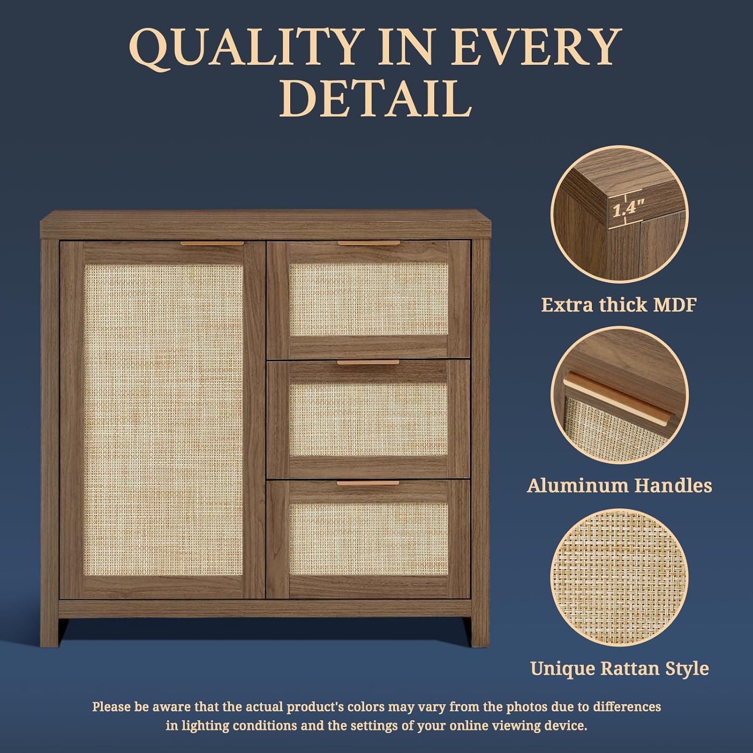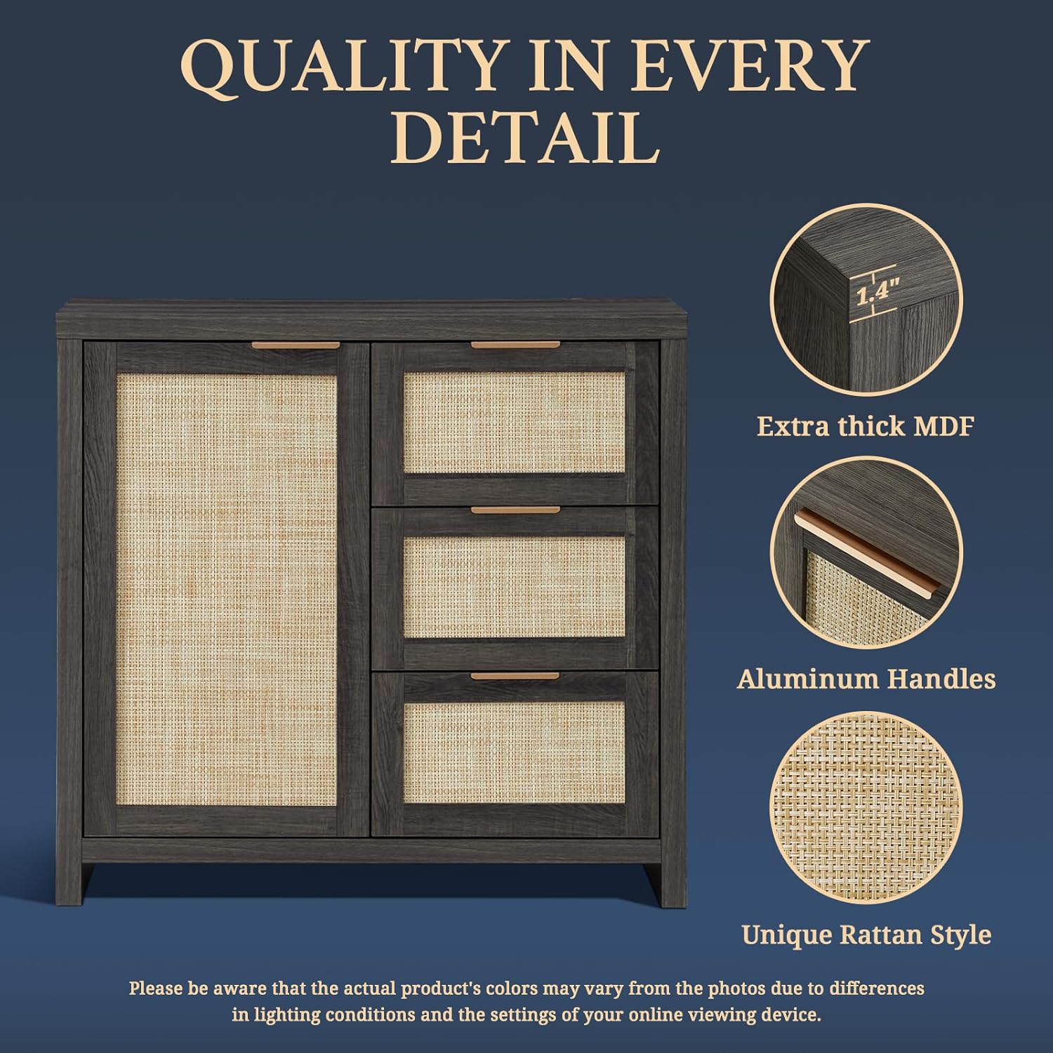 The quality of this cabinet is amazing. It’s very sturdy, and the rattan details give it a unique, elegant look. I’m using it in my dining room as a buffet, and it’s perfect for storing dishes and serving items. The drawers are spacious, and the three doors provide ample storage space.