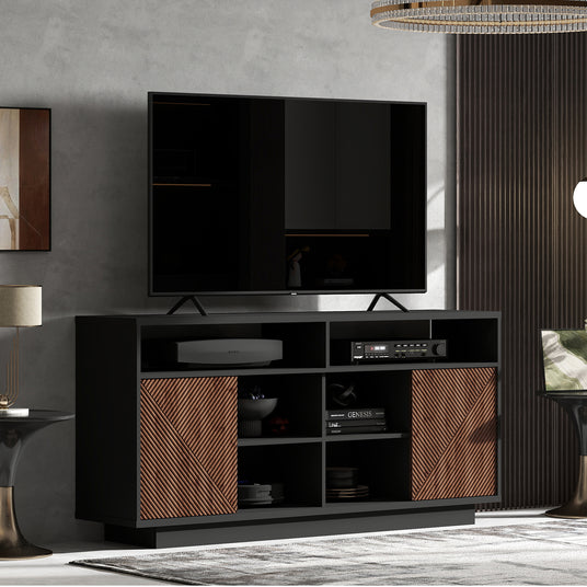 With dimensions of 62.8 inches (L) x 15.4 inches (W) x 30.71 inches (H), this sliding door TV cabinet provides ample space for your TV and other media essentials while maintaining a sleek, minimalist profile. The striking patchwork stripe design adds a modern, dynamic flair, while the sliding doors offer a space-saving solution for easy access to the storage compartments. Whether your style is contemporary, modern, or Scandinavian, this piece blends seamlessly with your home dΓ©cor.