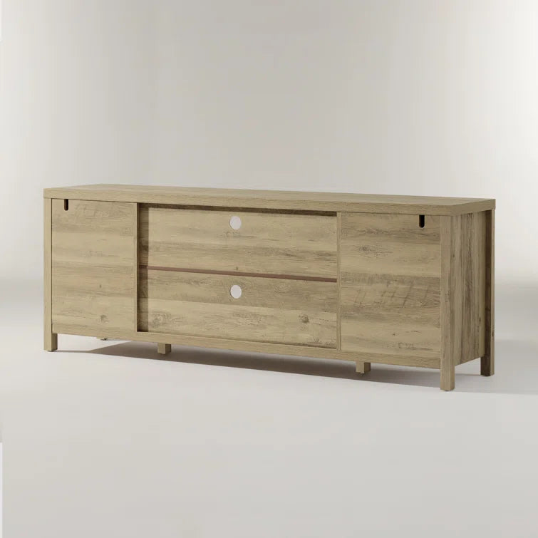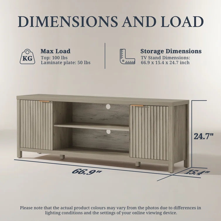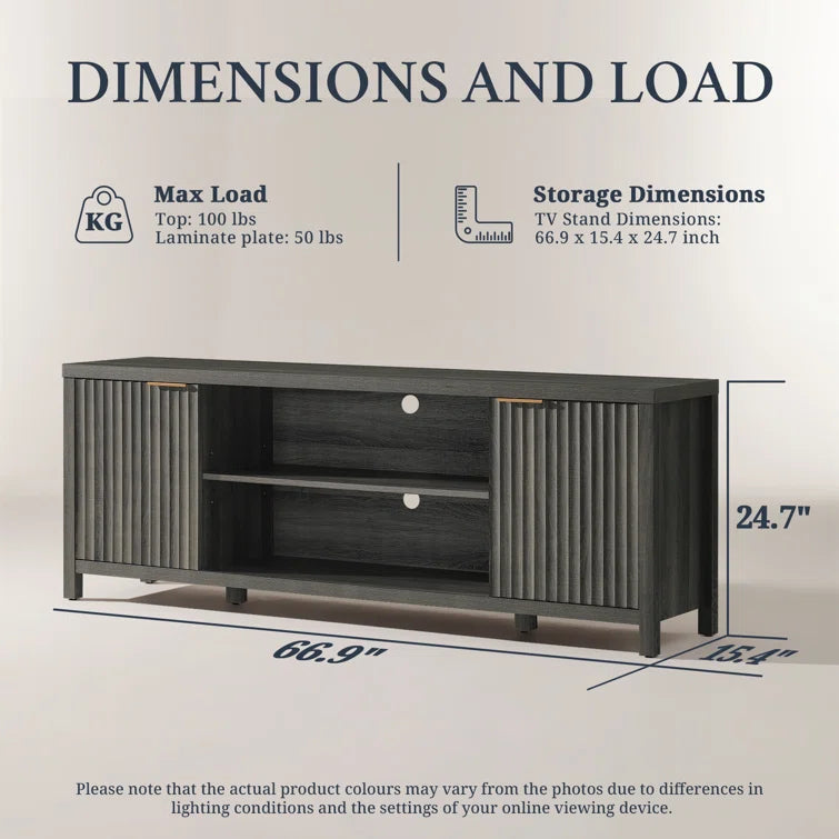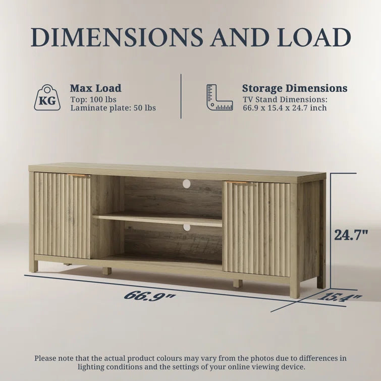 This farmhouse tv stand is thoughtfully designed, measuring 66.9" in width and 24.7" in height, to accommodate TVs ranging from 50 to 75 inches. Its sizing ensures compatibility with various television models. With its seamless blend of functionality and aesthetic appeal, it serves not only as the media center for your family but also as a refined and tasteful decoration for your living room, bedroom, office, or lounge.