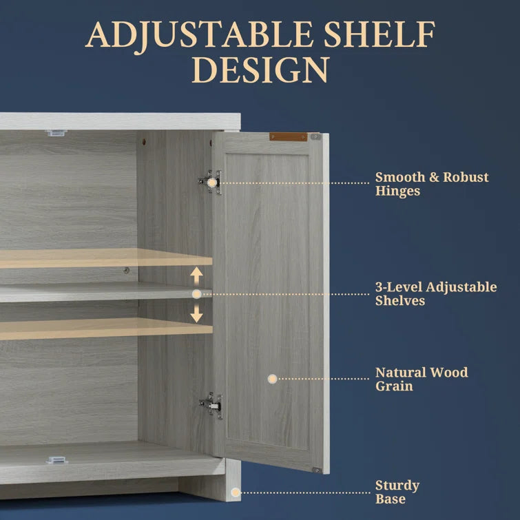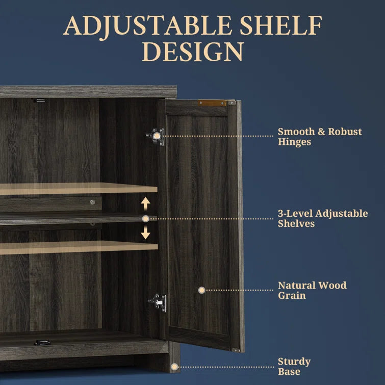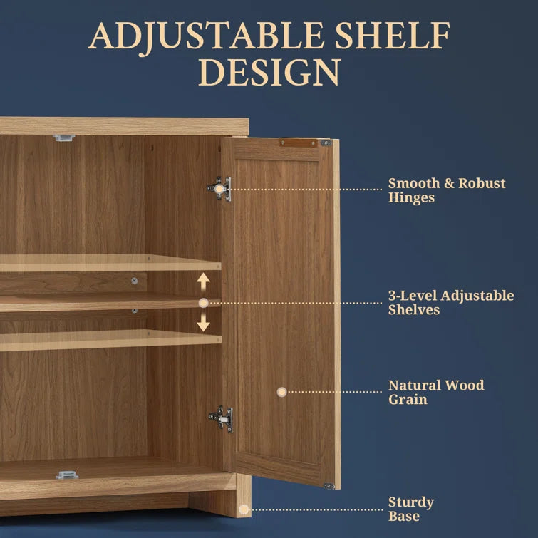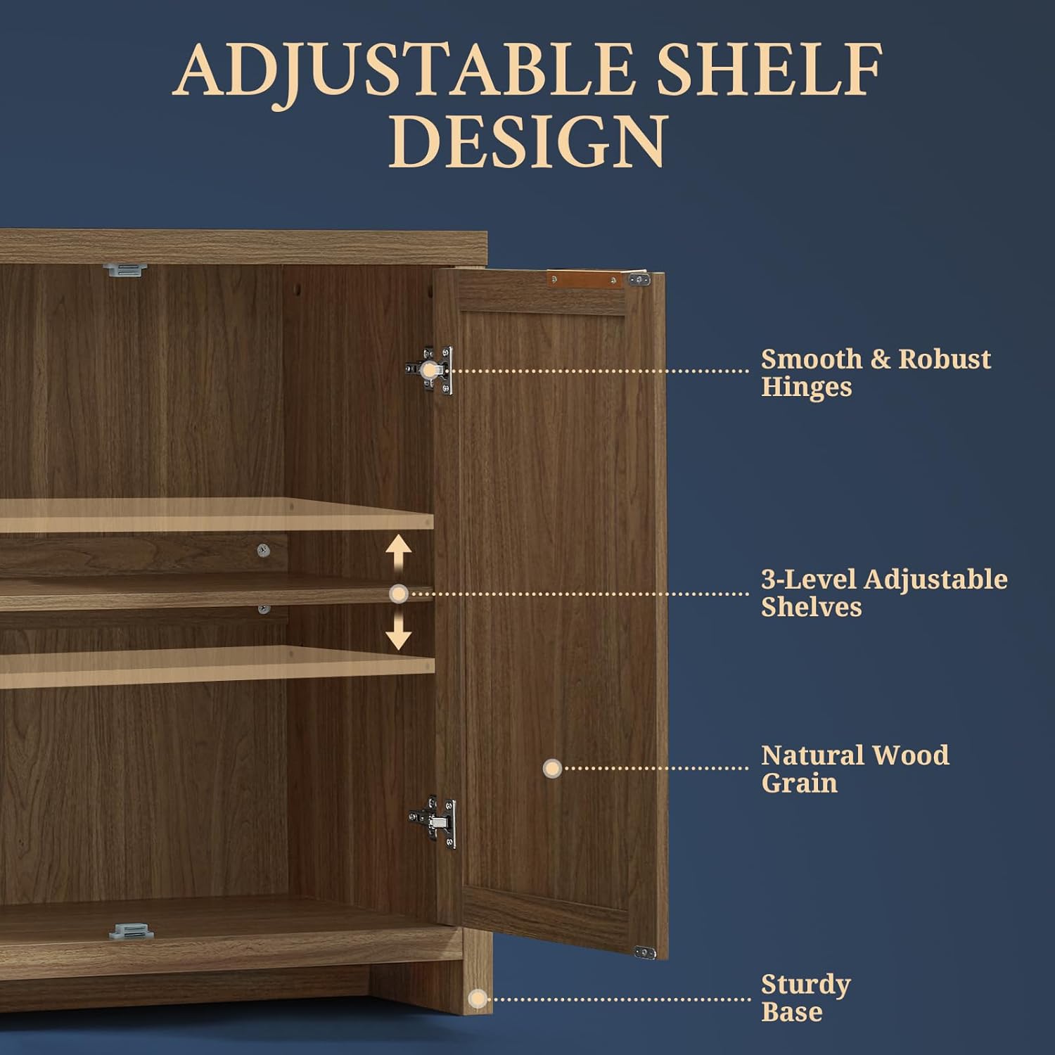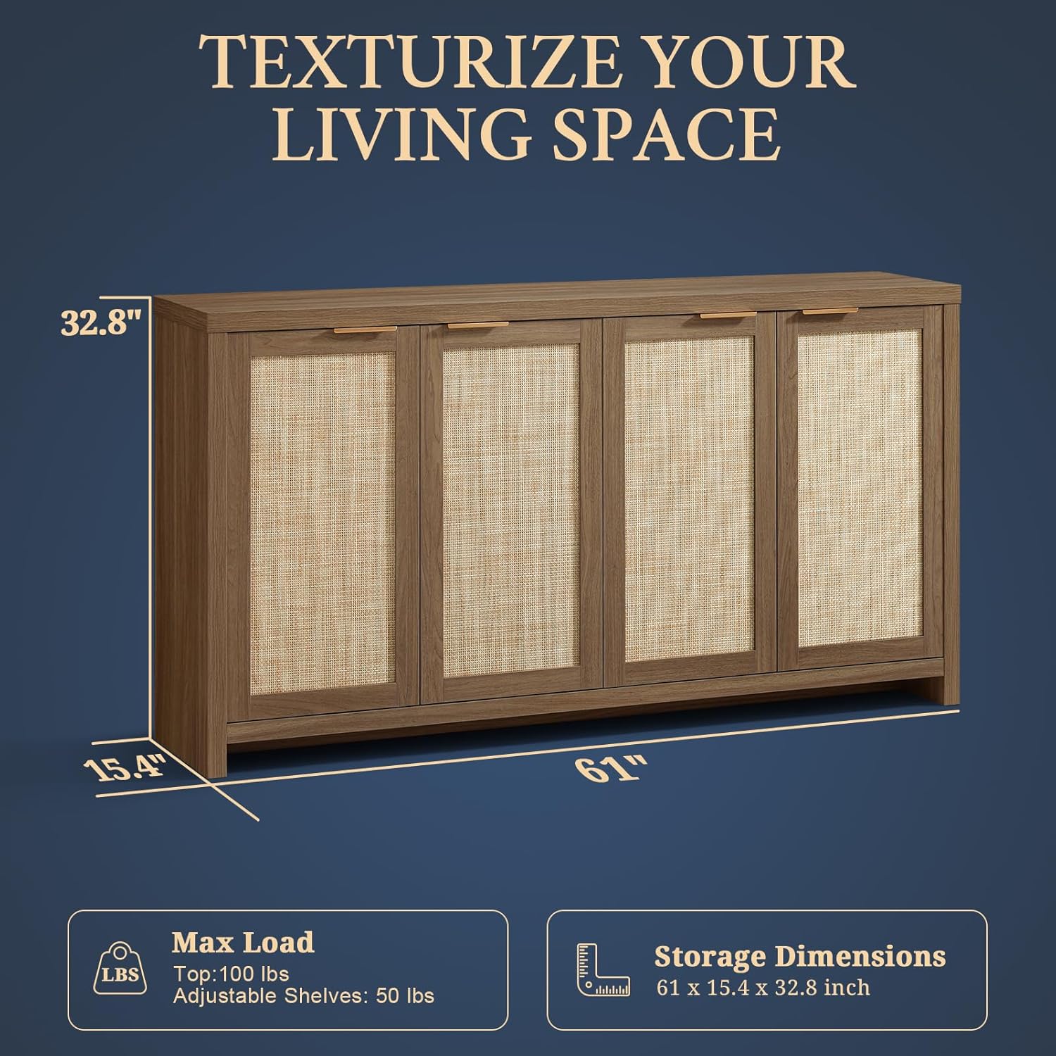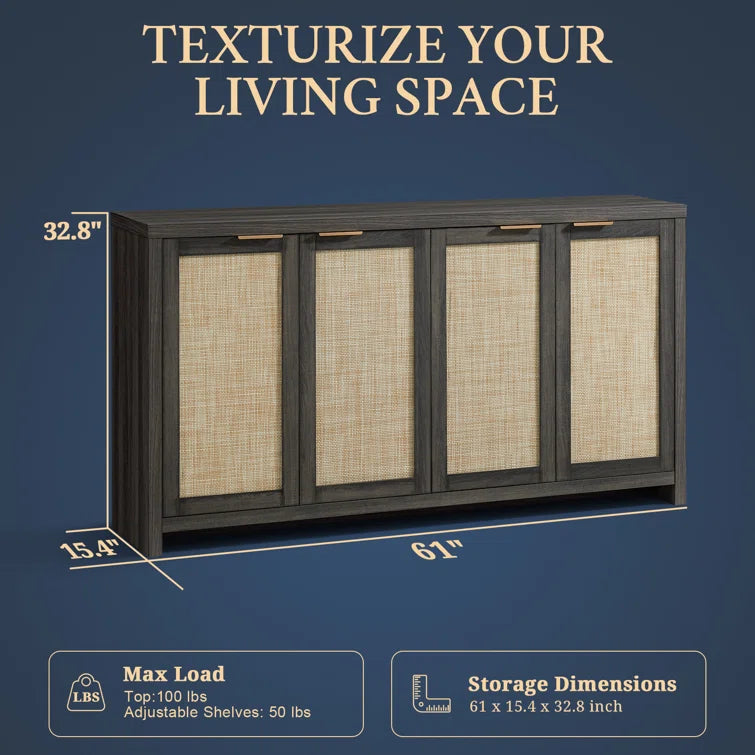 {"materialstitle":"Quality in Every Detail","image":"https://cdn.shopify.com/s/files/1/0780/4230/0713/files/1_eafa3cbc-299c-4ff3-82a4-7ce537214561.jpg?v=1722240641","paragraph":["The Hampstead series highlights the charm of textured elements and refined craftsmanship. Featuring rattan panel accents, sleek finishes, and versatile designs, this collection brings warmth, depth, and functionality to any space. Perfect for modern and minimalist interiors, the Hampstead series offers stylish and practical solutions for your home.","【Rattan 4-Door Storage Sideboard Cabinet】This sideboard cabinet combines natural rattan craftsmanship with versatile storage solutions. Featuring handwoven rattan doors and a sleek midnight oak finish, it brings warmth and texture to modern interiors. Its ample storage and timeless design make it a stylish and functional choice for dining rooms, living spaces, or hallways.","【Design and Versatility Combined】Measuring 63 inches (L) x 15.7 inches (W) x 31.5 inches (H), this cabinet is perfect for dining rooms, living rooms, or offices. The handwoven rattan panels create an inviting and organic aesthetic, blending effortlessly with modern, minimalist, or rustic decor styles.","【Ample Storage Capacity】Behind its four rattan doors, the cabinet features adjustable shelves, providing flexible storage for kitchenware, books, or decorative items. The spacious design ensures clutter-free organization, making it ideal for both everyday use and special occasions.","【Durable and Sustainable Design】Crafted from 1.4-inch high-quality MDF and premium decorative laminate, the cabinet ensures durability and longevity. The handwoven rattan panels add a natural touch while maintaining strength, making it a reliable storage solution for years to come.","【Stable and Floor-Friendly】Equipped with protective foot pads, this cabinet effectively prevents floor scratches and remains stable even on uneven surfaces. Its sturdy structure supports a maximum weight of 100 lbs, making it suitable for storing heavy items.","【Easy Assembly】Labeled parts and step-by-step instructions make assembly straightforward and hassle-free. Most users can set up the cabinet in under 60 minutes."]}