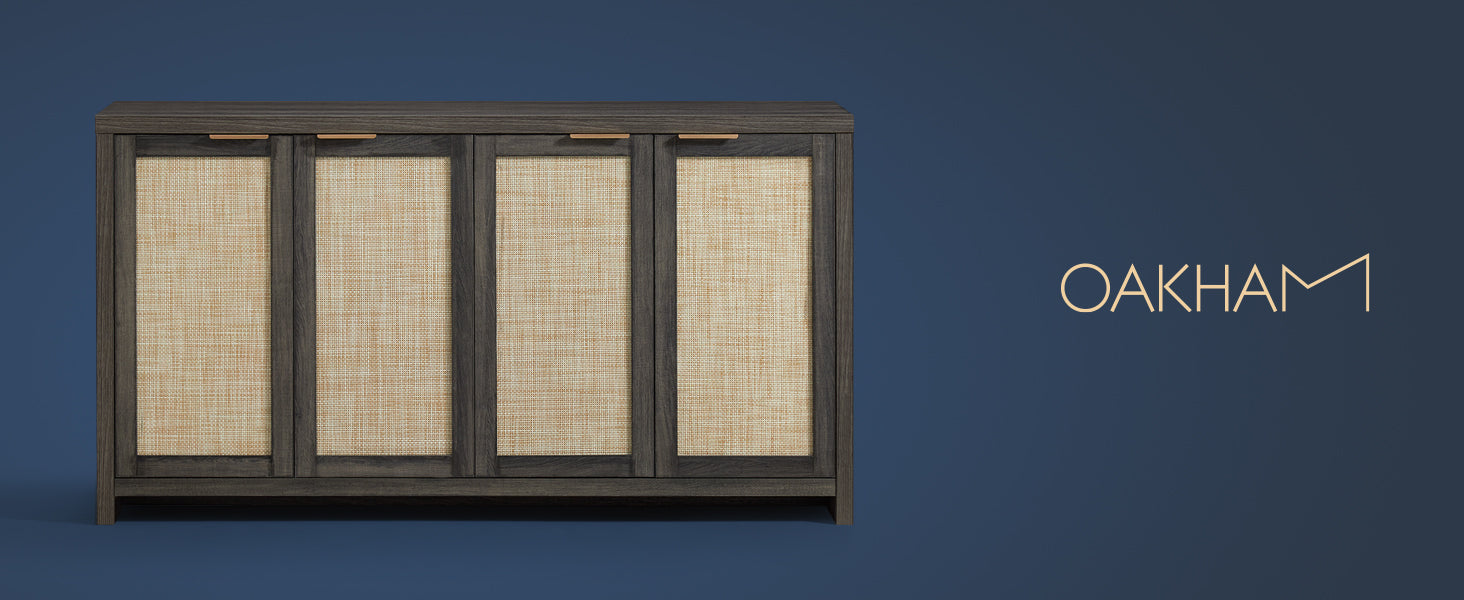 The OAKHAM sideboard buffet features a 4-door rattan design, adding a natural touch to your kitchen, living room, or hallway. The earthy tones and texture blend with various styles, bringing warmth and elegance to any space.