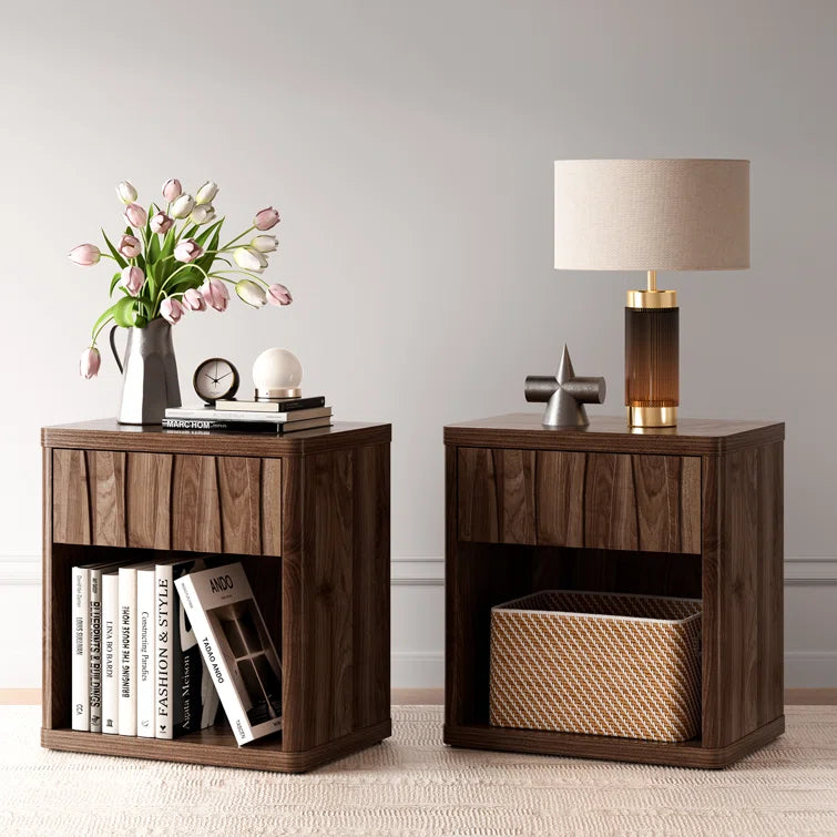 Wooden Fluted Single-Drawer Nightstand with Charging Station