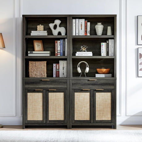 Transform Your Space with the Rattan Double Doors Wooden 5-Tier Tall Bookcase Cabinet