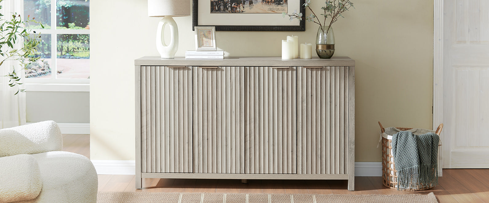 Wooden Fluted Storage Cabinet with Double Doors and 3 Drawers