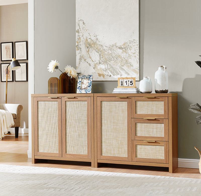 Wooden Fluted Storage Cabinet with Double Doors and 3 Drawers